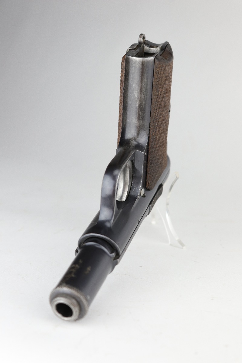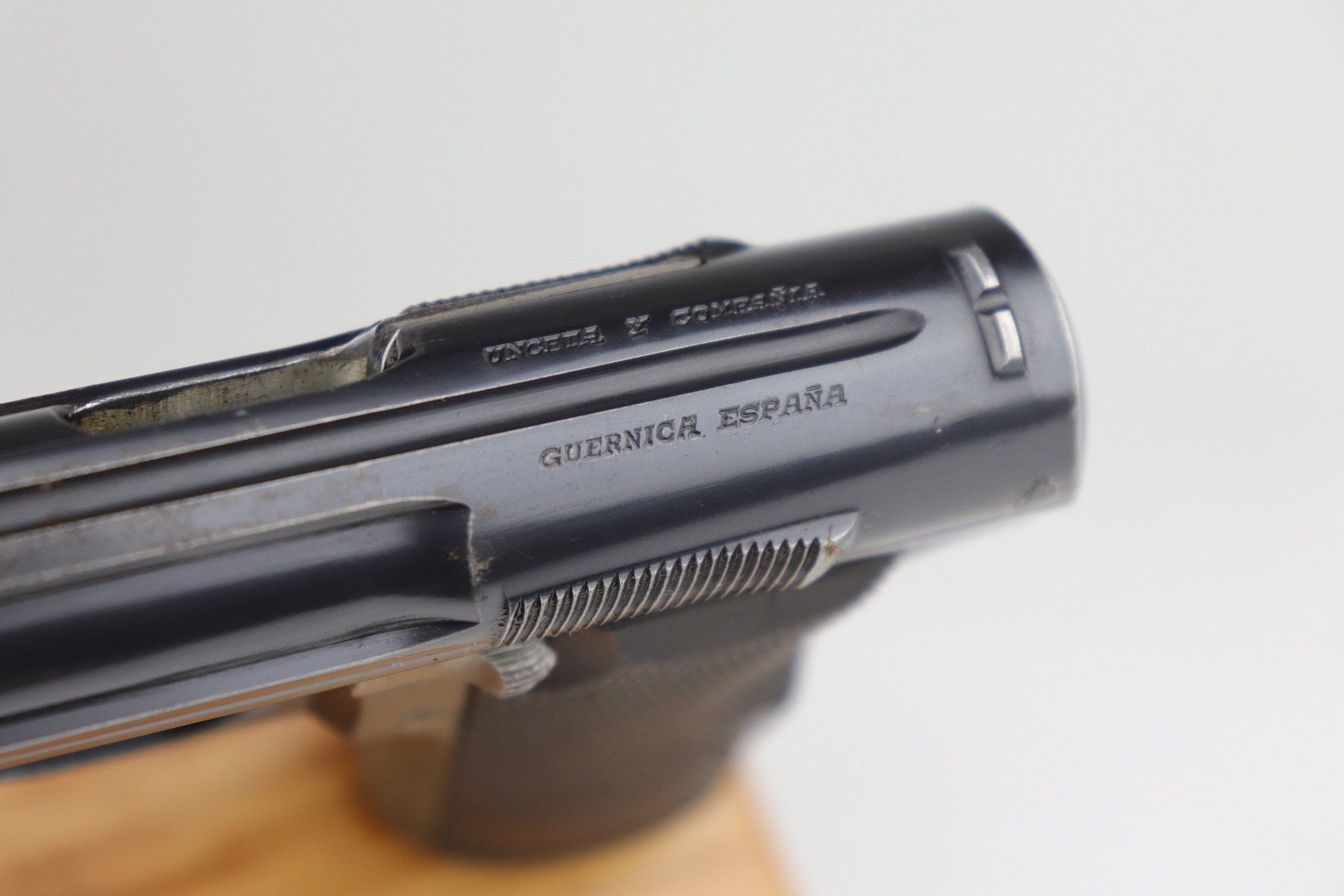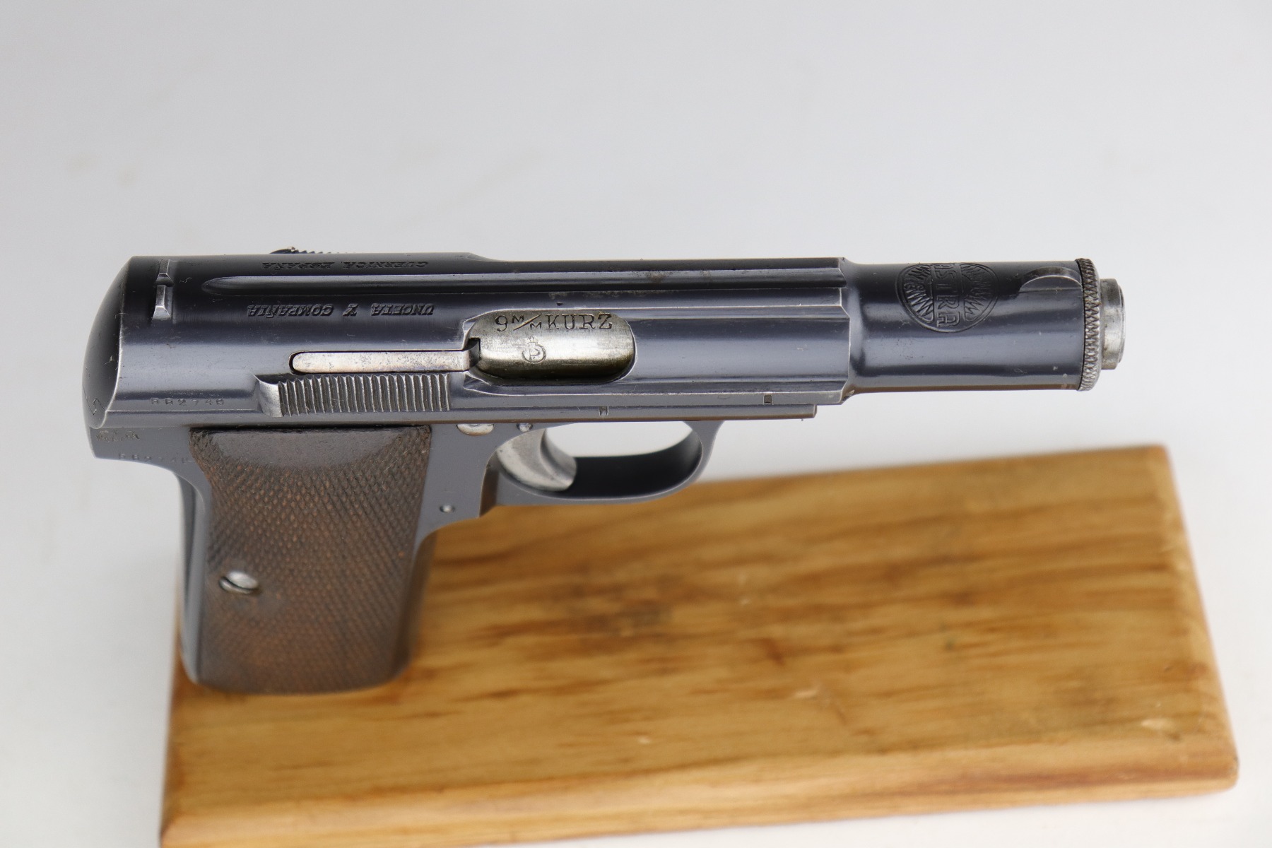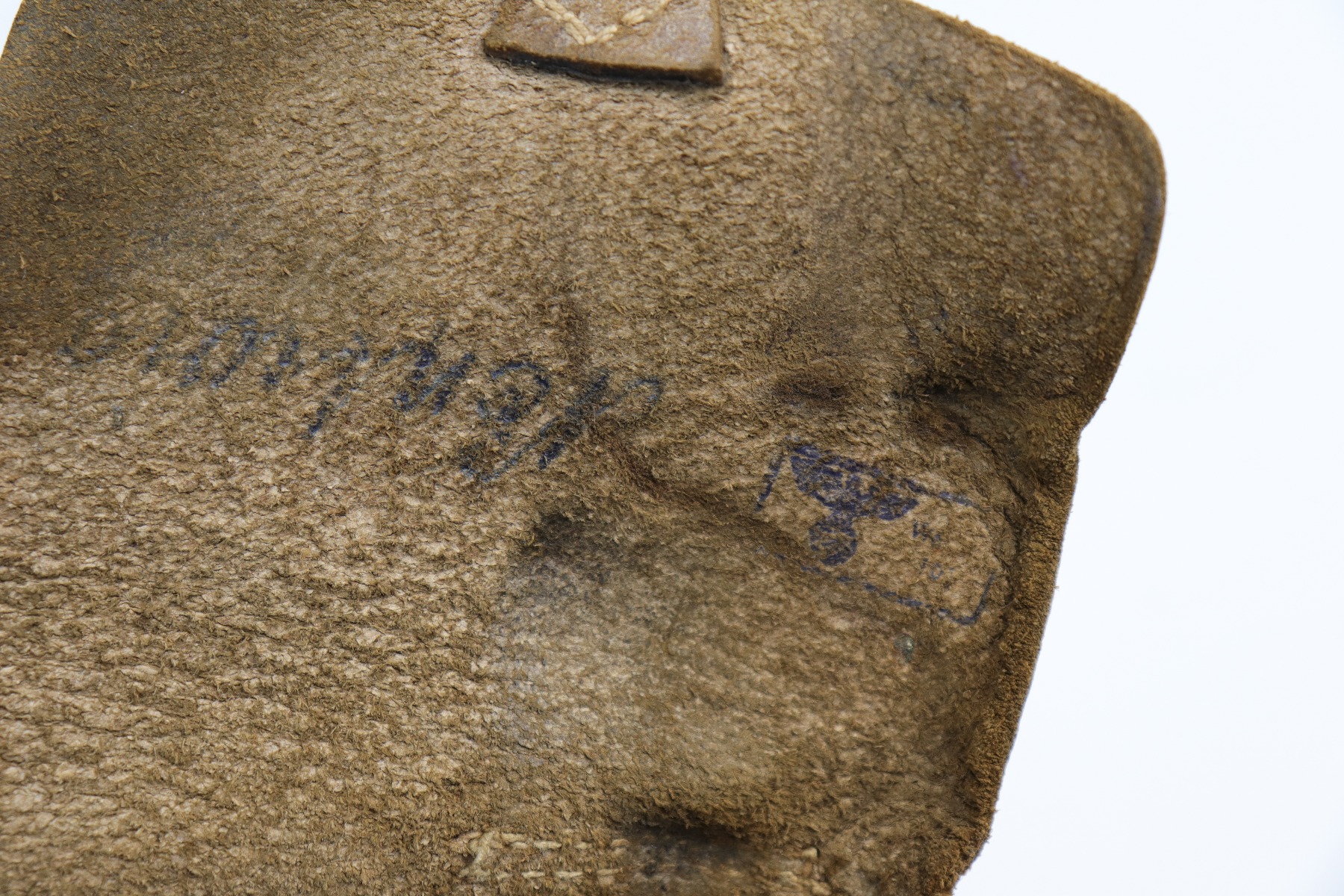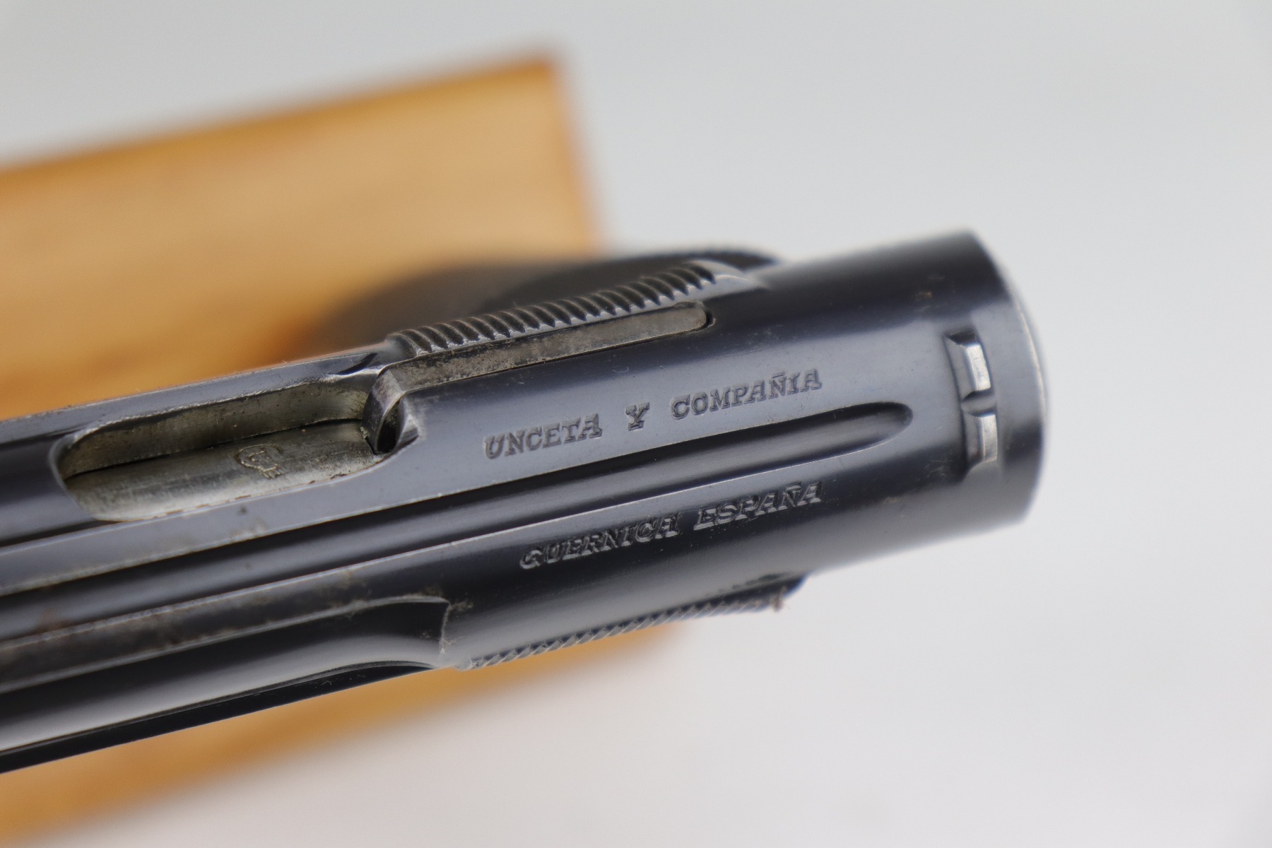 8/12/20 – This is an original Spanish-made Astra 300 rig issued to the Nazi Army in February of 1943. The gun is all matching and has the proper “Waffen 251” Nazi military acceptance proof on the tang. This rig also comes with a holster and two magazines. This particular pistol has retained about 85% of its original bluing. There is thinning on both of the straps and areas of spotty wear and minor freckling on the underside of the slide and left rear of the slide. There is also some minor thinning on the left side of the gun toward the center. Very nice original grips. The holster is in decent shape, but there is light cracking throughout and a small hole in the mag pouch. There is a Nazi waffen ink stamp on the inside. The rig also includes two period-correct magazines. The bore is shiny with nice rifling.