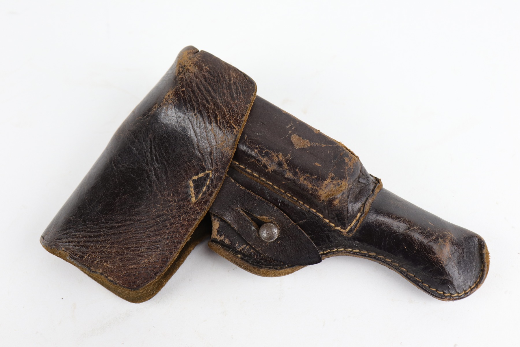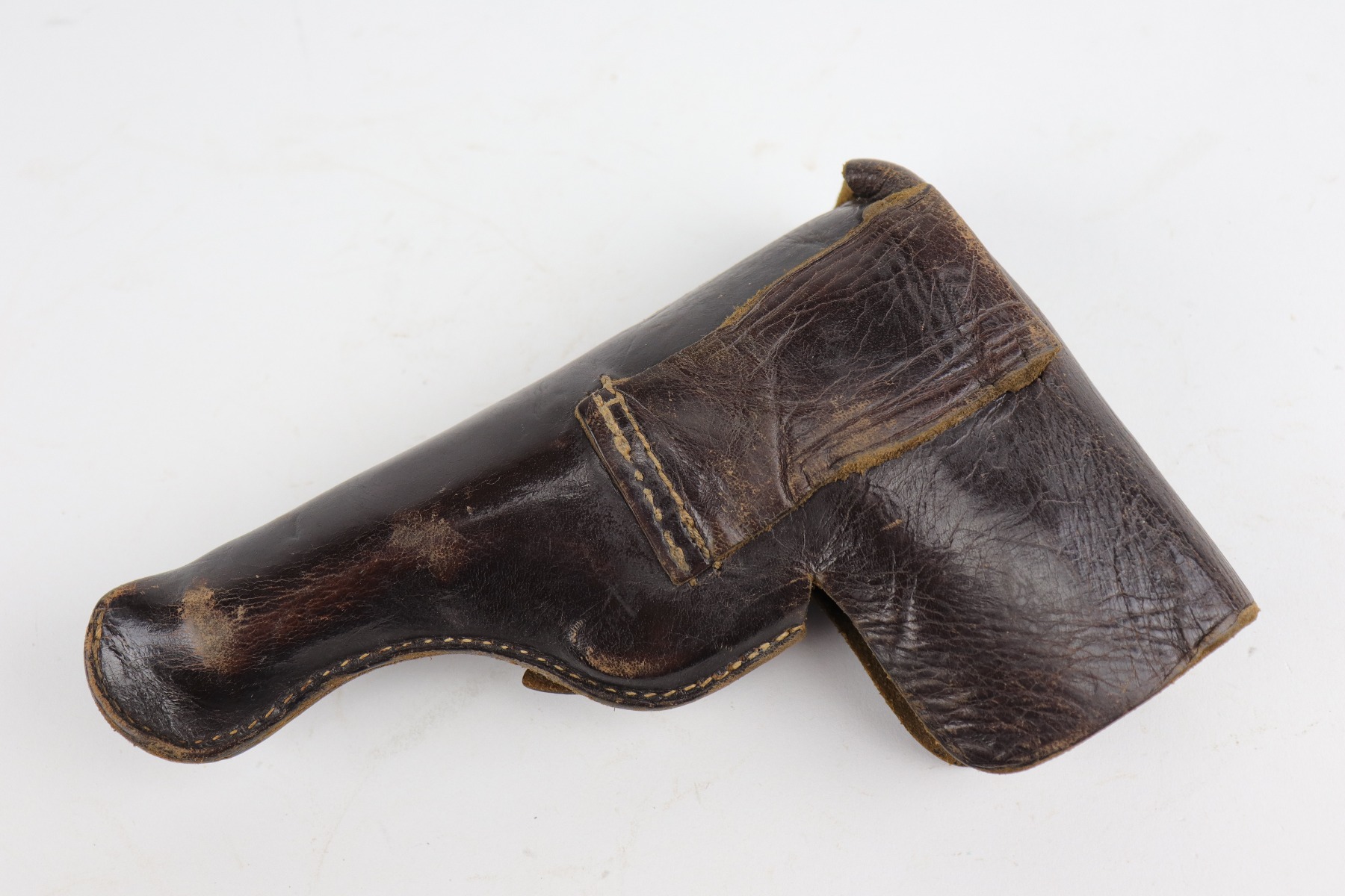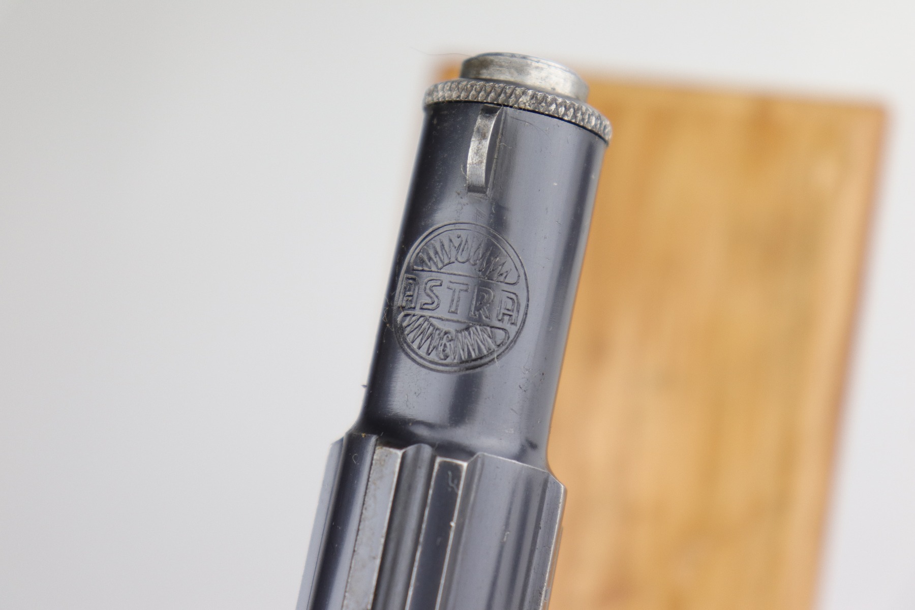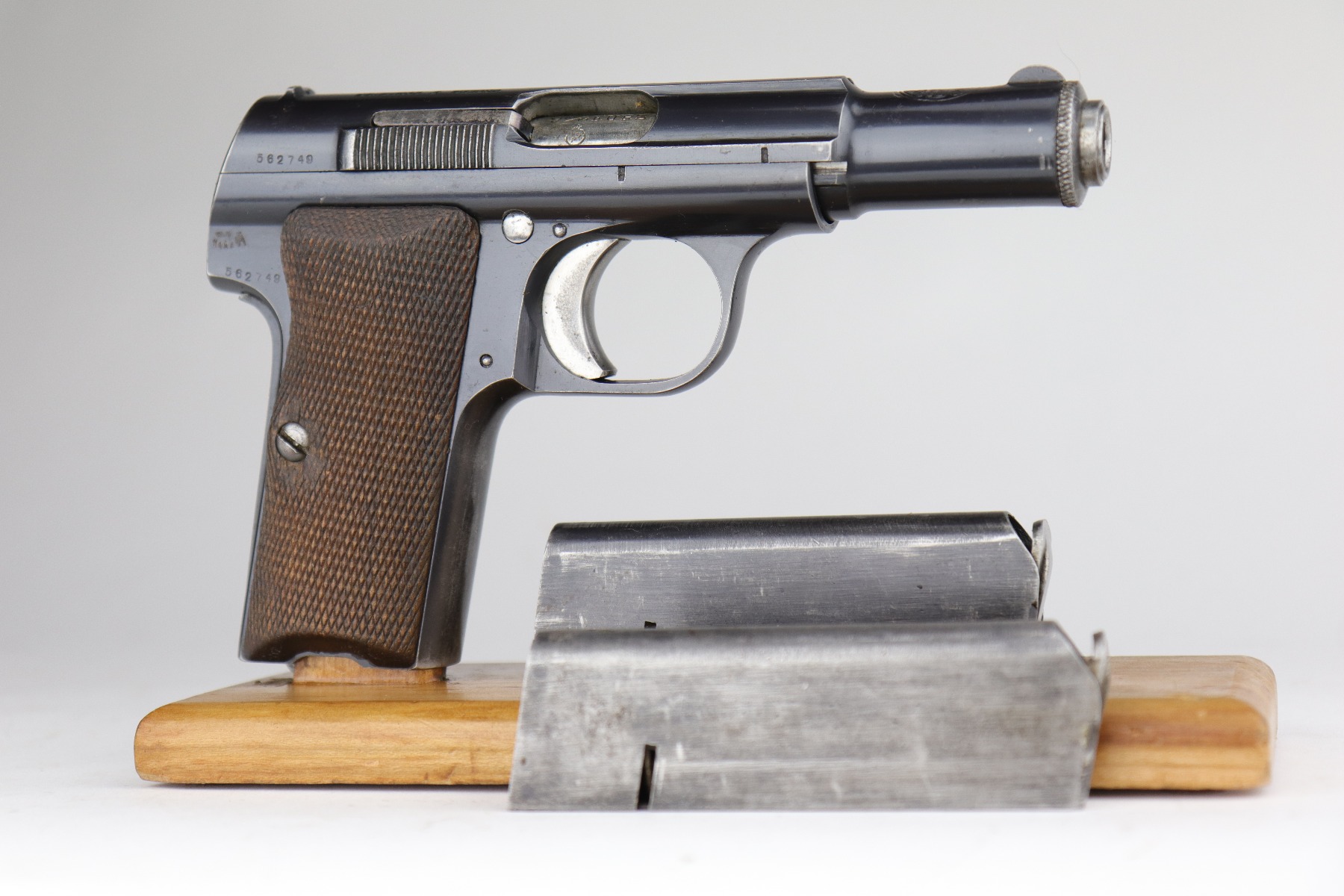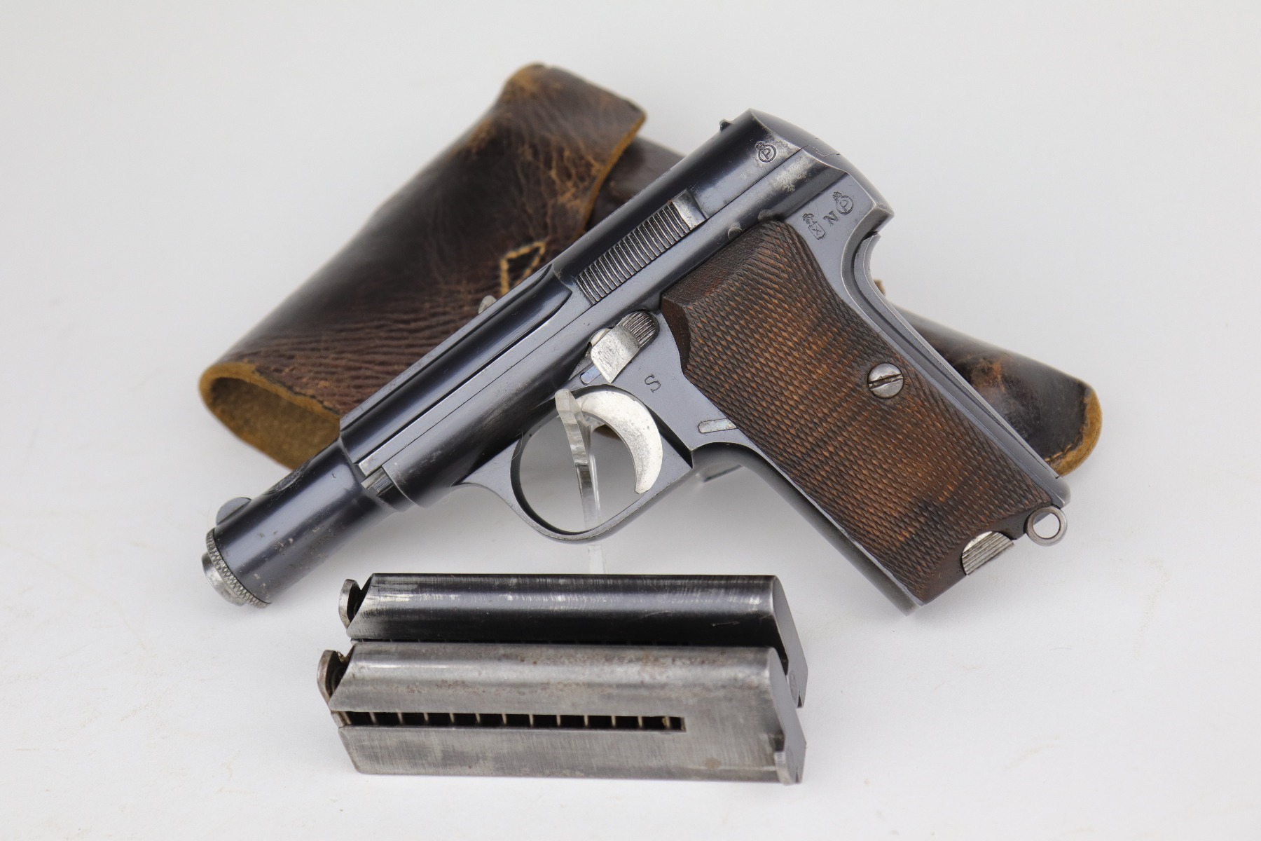 8/12/20 – This is an original Spanish-made Astra 300 rig issued to the Nazi Army in February of 1943. The gun is all matching and has the proper “Waffen 251” Nazi military acceptance proof on the tang. This rig also comes with a holster and two magazines. This particular pistol has retained about 85% of its original bluing. There is thinning on both of the straps and areas of spotty wear and minor freckling on the underside of the slide and left rear of the slide. There is also some minor thinning on the left side of the gun toward the center. Very nice original grips. The holster is in decent shape, but there is light cracking throughout and a small hole in the mag pouch. There is a Nazi waffen ink stamp on the inside. The rig also includes two period-correct magazines. The bore is shiny with nice rifling.
