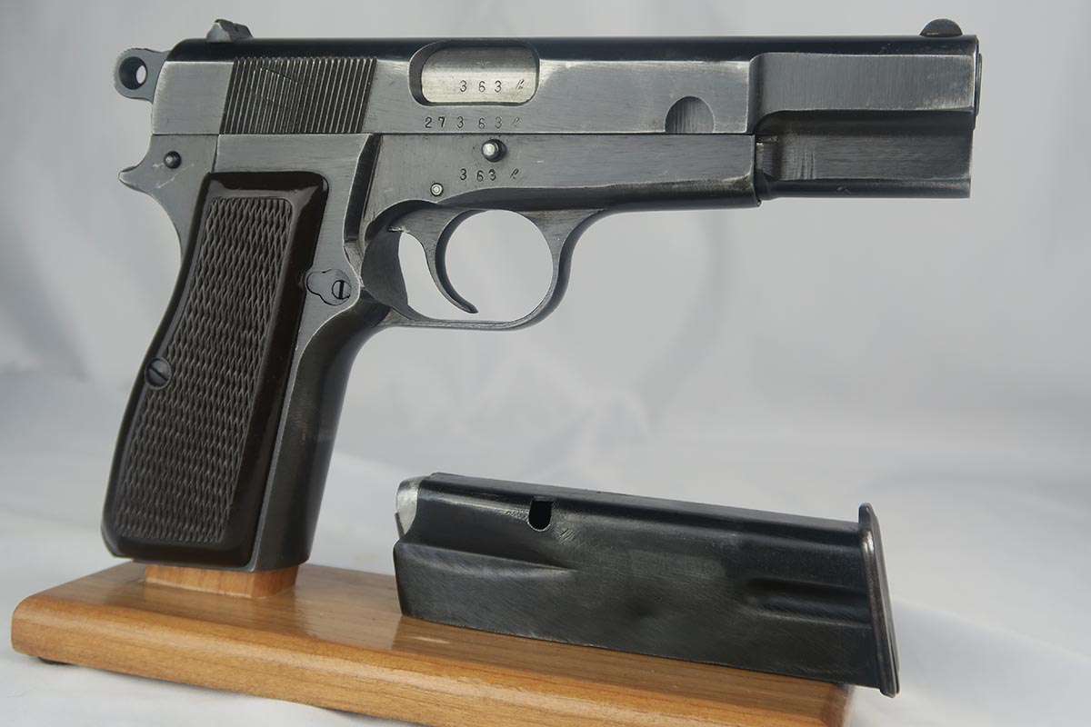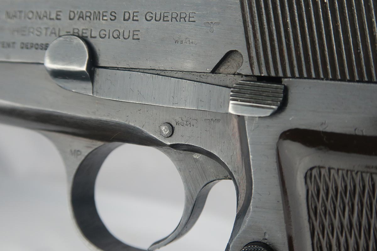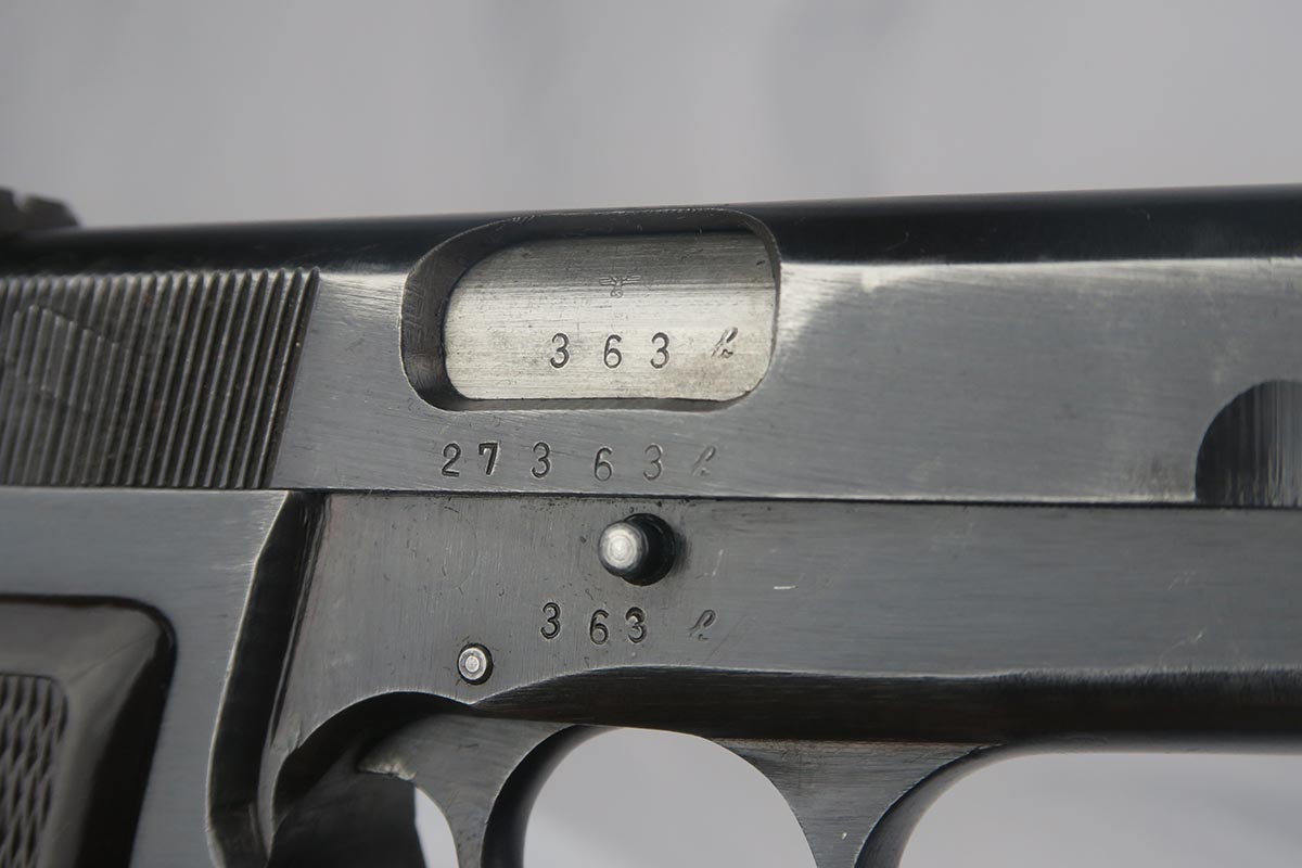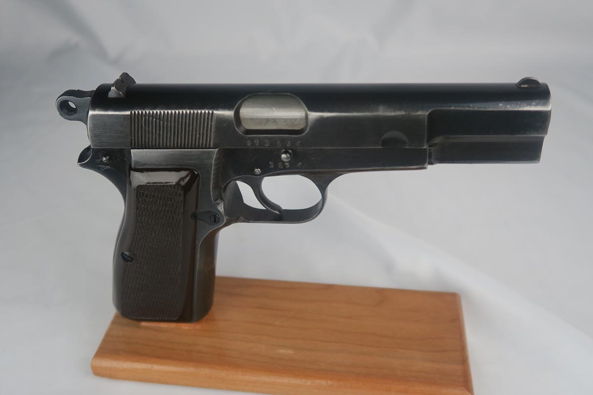 9/5/17 – This is a nice Browning High Power that was issued to the Germany Army during World War II.  It is original and correct with about 95% blue remaining.  There is high edge wear on the slide and a little bit of finish loss on the straps.  Minty grips.  Period correct magazine.  Strong bore with no major issues.