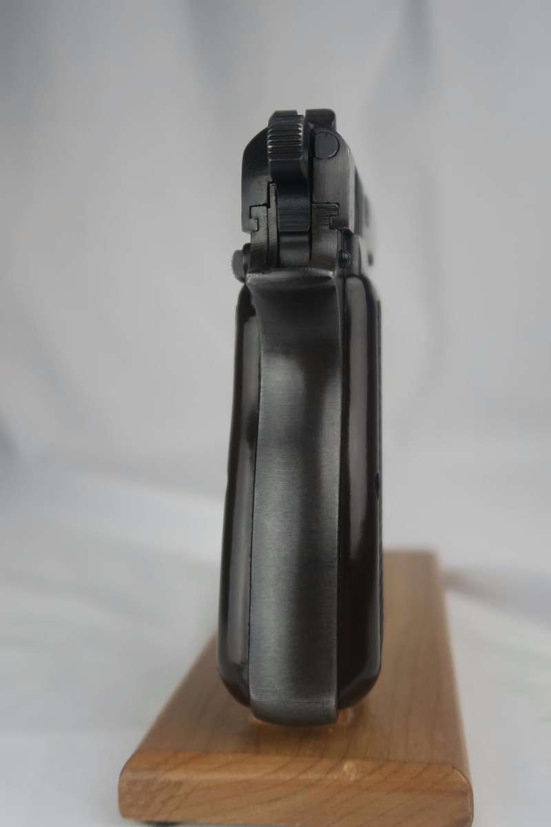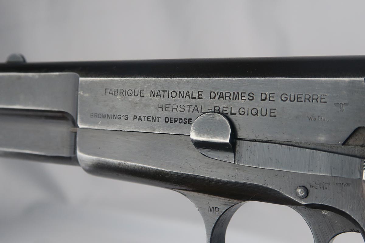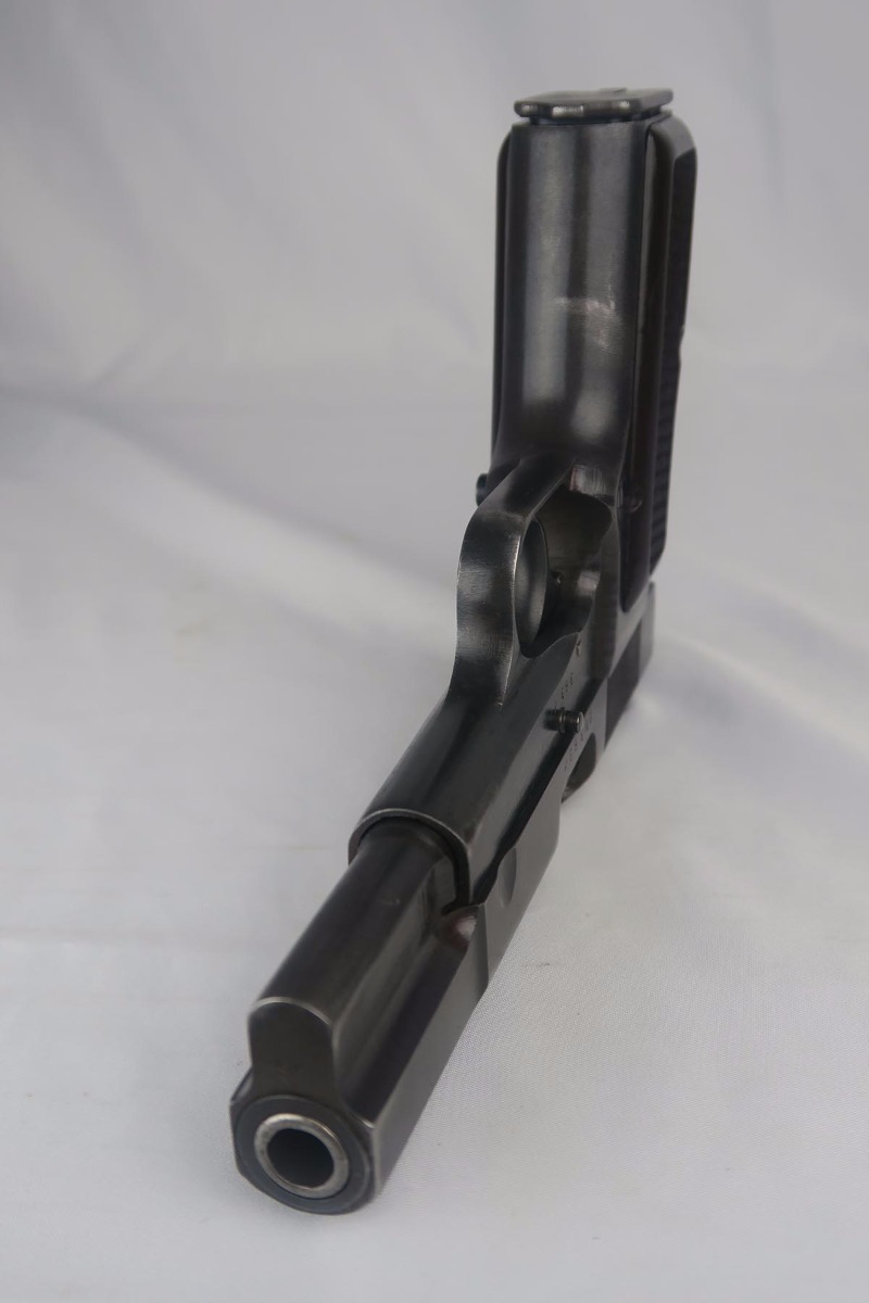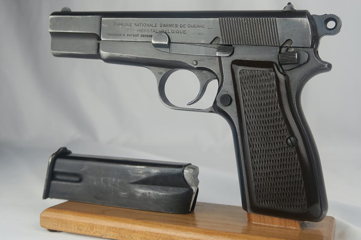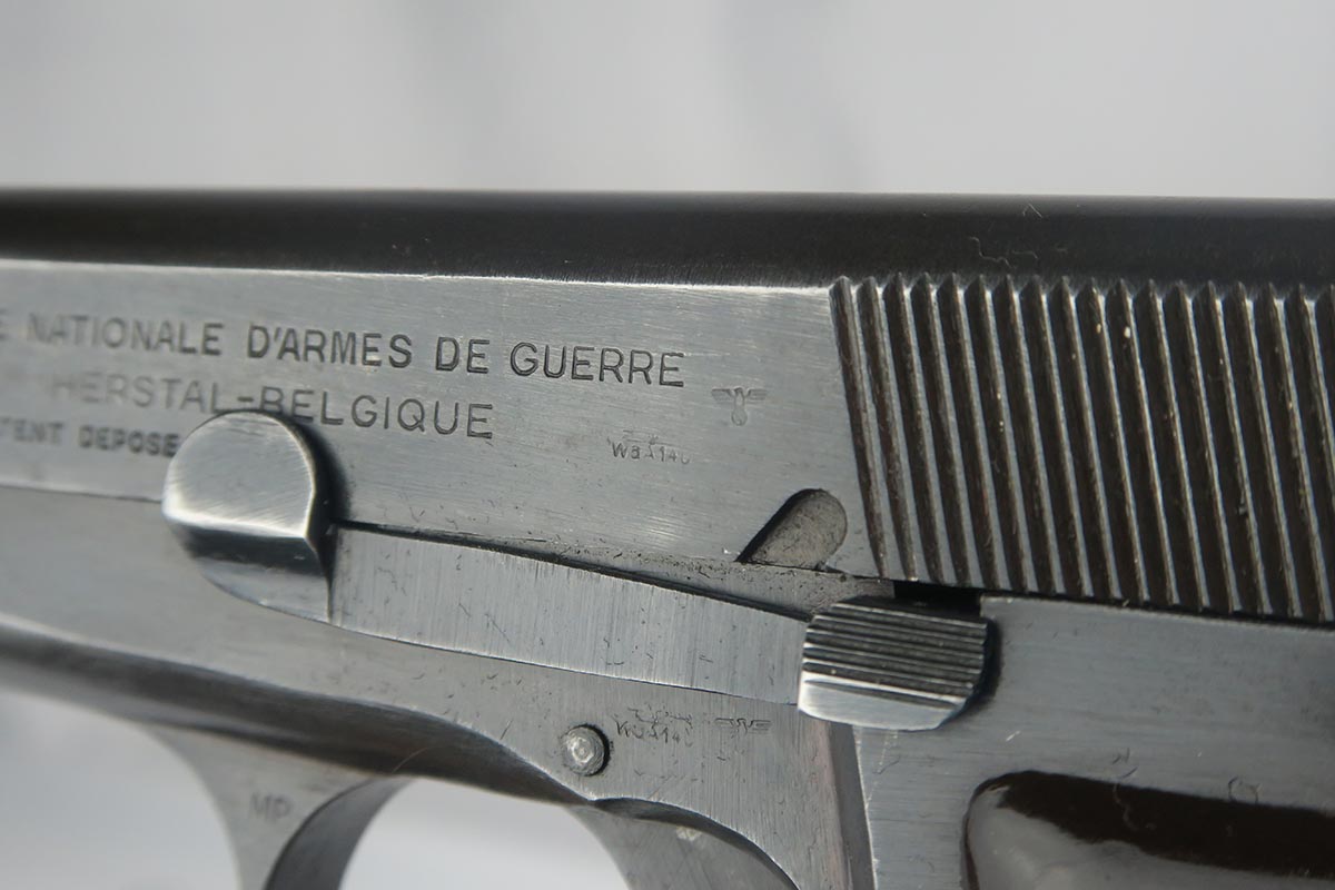9/5/17 – This is a nice Browning High Power that was issued to the Germany Army during World War II.  It is original and correct with about 95% blue remaining.  There is high edge wear on the slide and a little bit of finish loss on the straps.  Minty grips.  Period correct magazine.  Strong bore with no major issues.