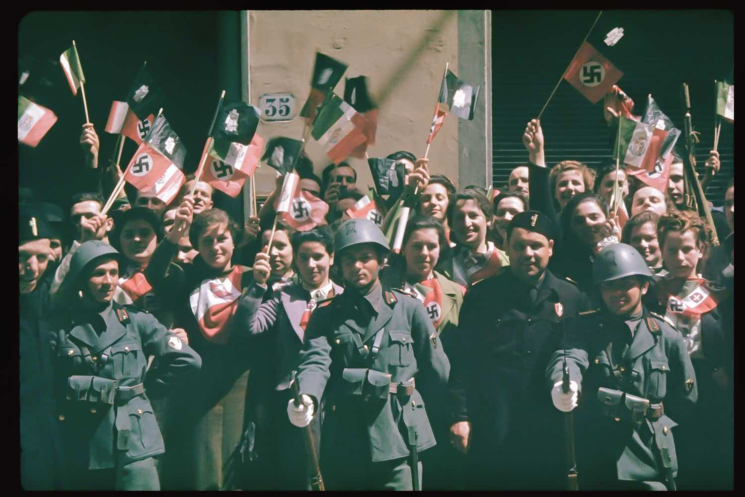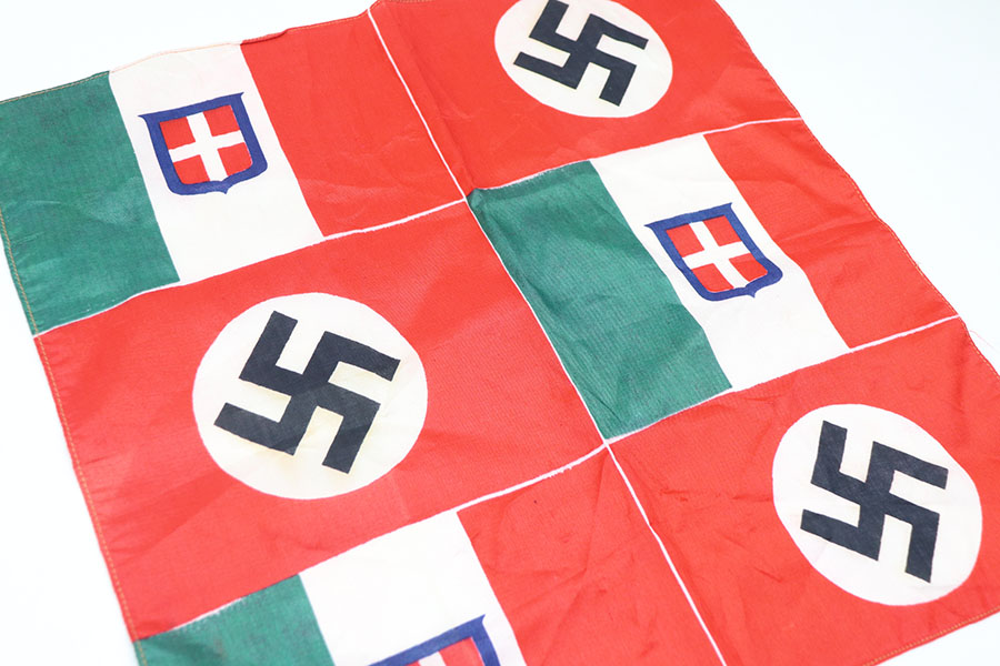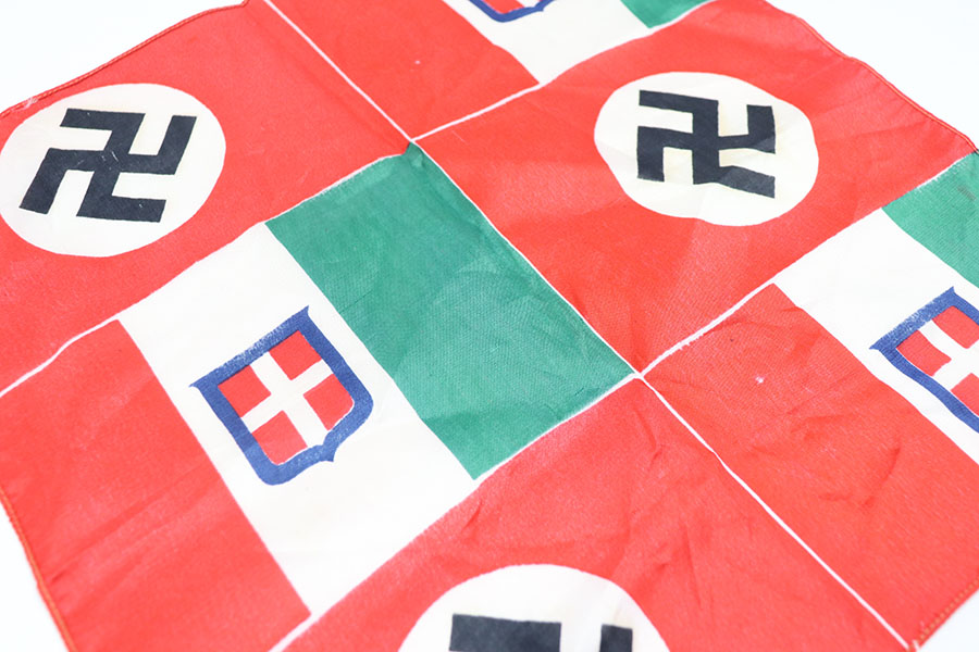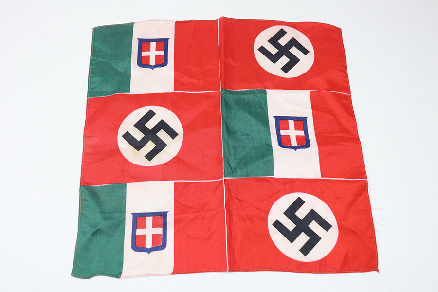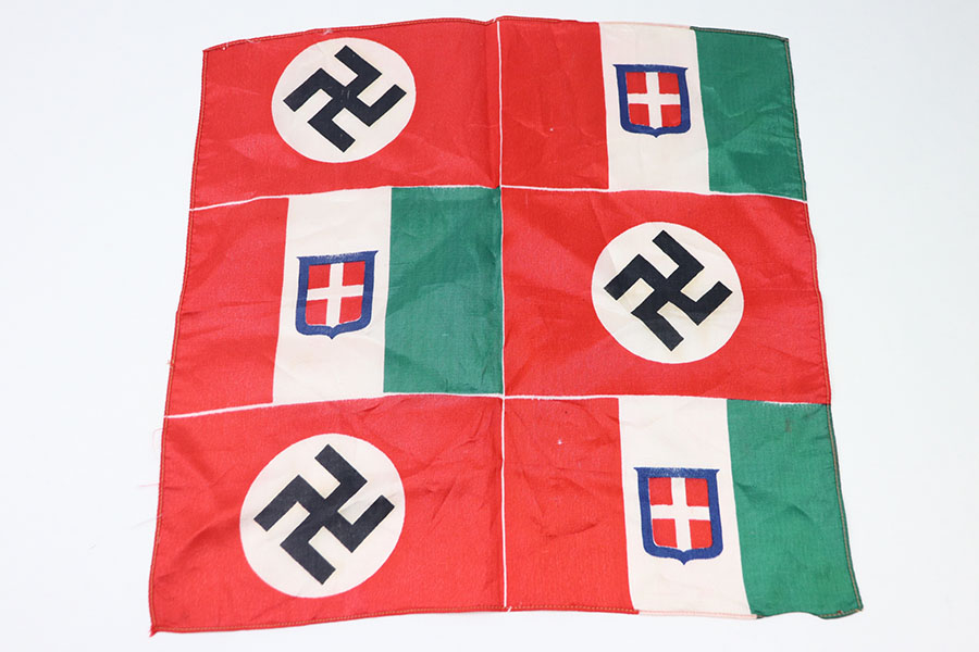 4/20/21 – This is a small 12×13 inch rally flag signifying the alliance between Italy and Germany during WW2. Silk construction and in excellent condition. The last image of this listing shows a woman wearing one of these as a scarf, of sorts, in the crowd.