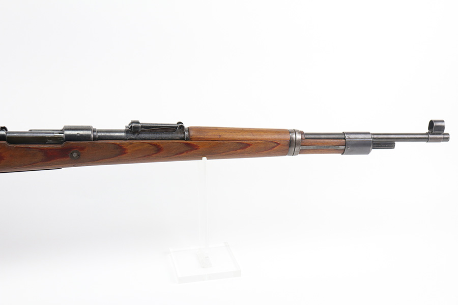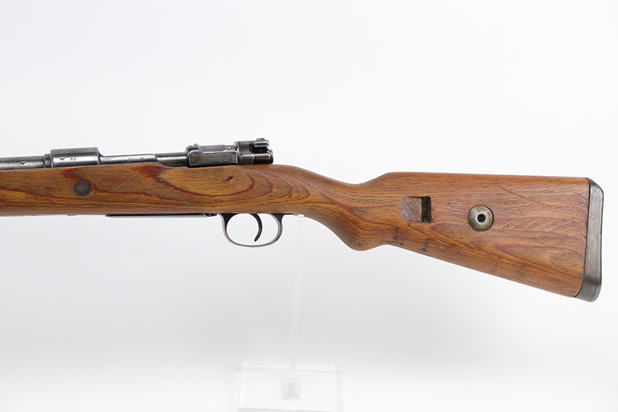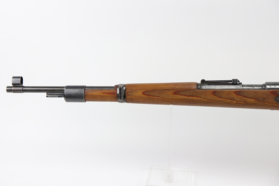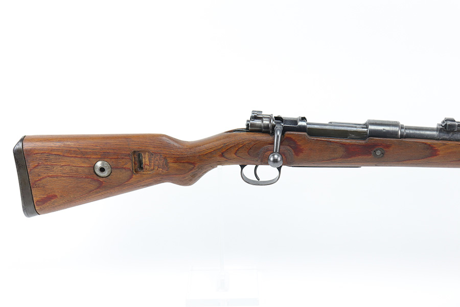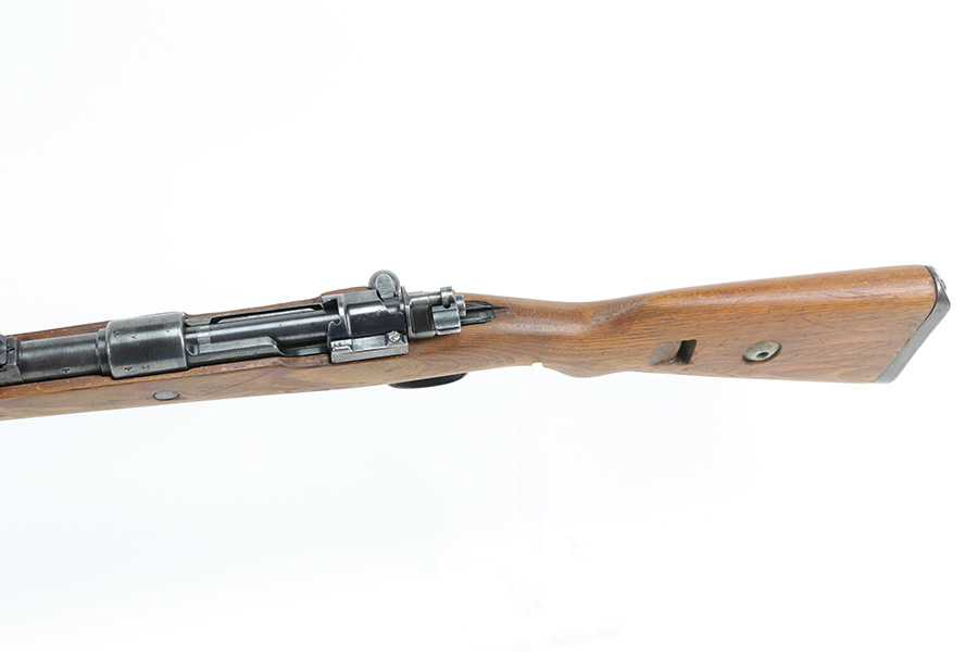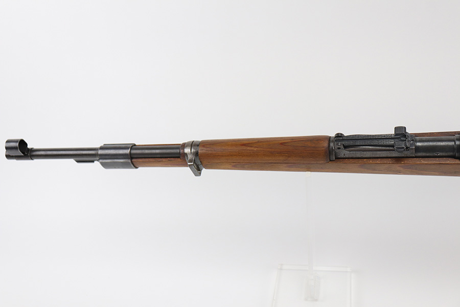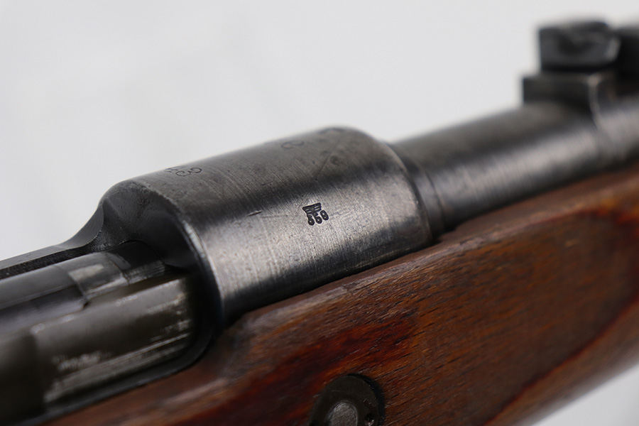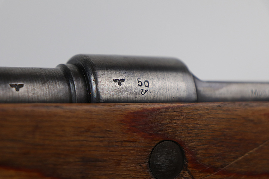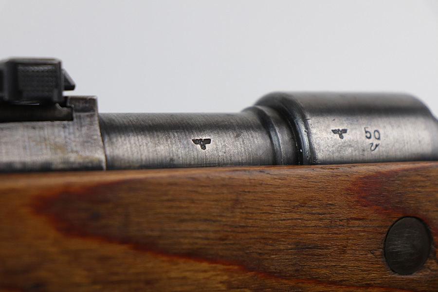 9/16/21 – This is a very nice example of a JP Sauer K98 rifle issued to the Nazi military in 1943. It is all matching, has the proper waffen military proofs throughout, and features the Sauer “CE 43” factory code on the receiver. The stock has no visible numbers but looks like it has an extremely faint waffen eagle H proof on the right side of the butt stock. The receiver area and rear barrel band have lost most of their finish. The barrel, front band, floor plate, and trigger group have most of their finish. There is minor wear around the muzzle and spotty oxidation throughout. Light brown patina throughout. The stock is nice but has some light scratches here and there. It was likely lightly sanded. The rifling in the bore is a bit worn with spotty oxidation and minor pitting throughout.
