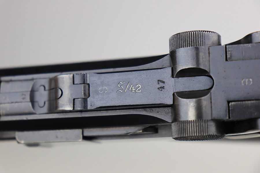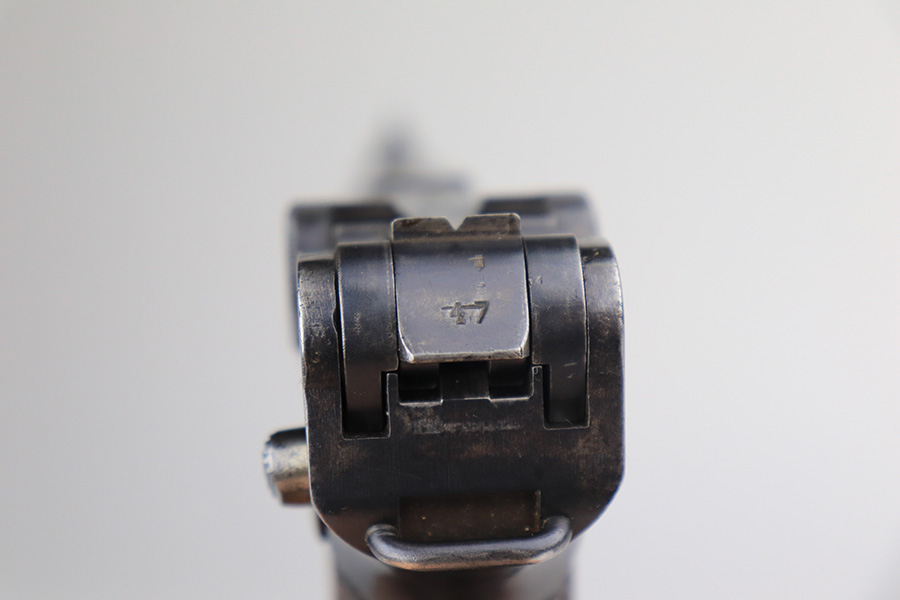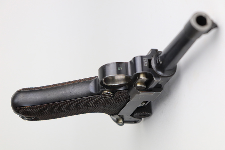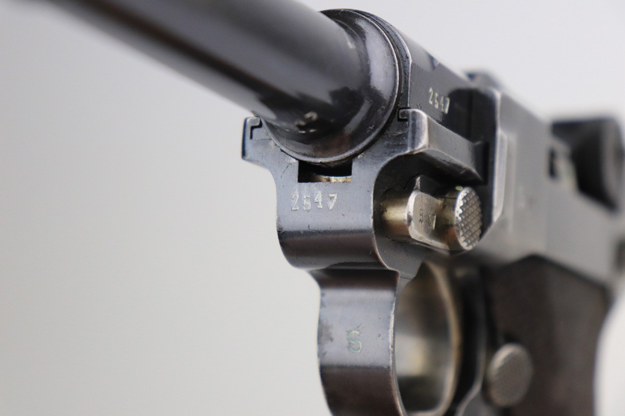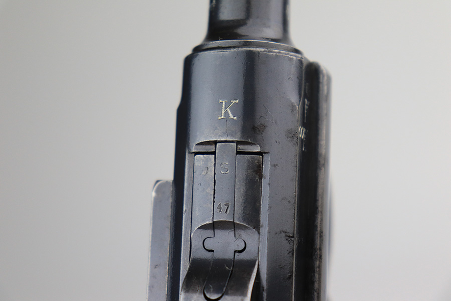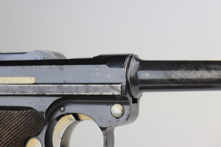 11/24/21 – This is a rare, early Nazi Mauser Luger from 1934 with K date code over chamber. There were only 10,000 of these Lugers produced, and only a tiny portion of those have survived in original condition, with their original magazine and grips. This one has the original, matching grips but the magazine is mismatched. It is a rare, original magazine with O/37 marking, but the serial number was ground and restamped at some point. The gun has roughly 60-70% of the original blue remaining, with visible thinning in many areas, and little straw remaining on the small parts. Right side rail and right side of the barrel have some freckling. All small parts are ‘S” marked, with a mix of gothic and script fonts. Bore has strong rifling but a little frost throughout. Grips show some handling wear but no cracks or chips.