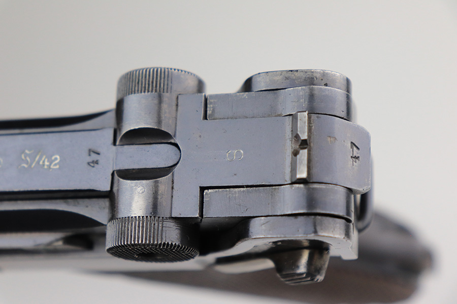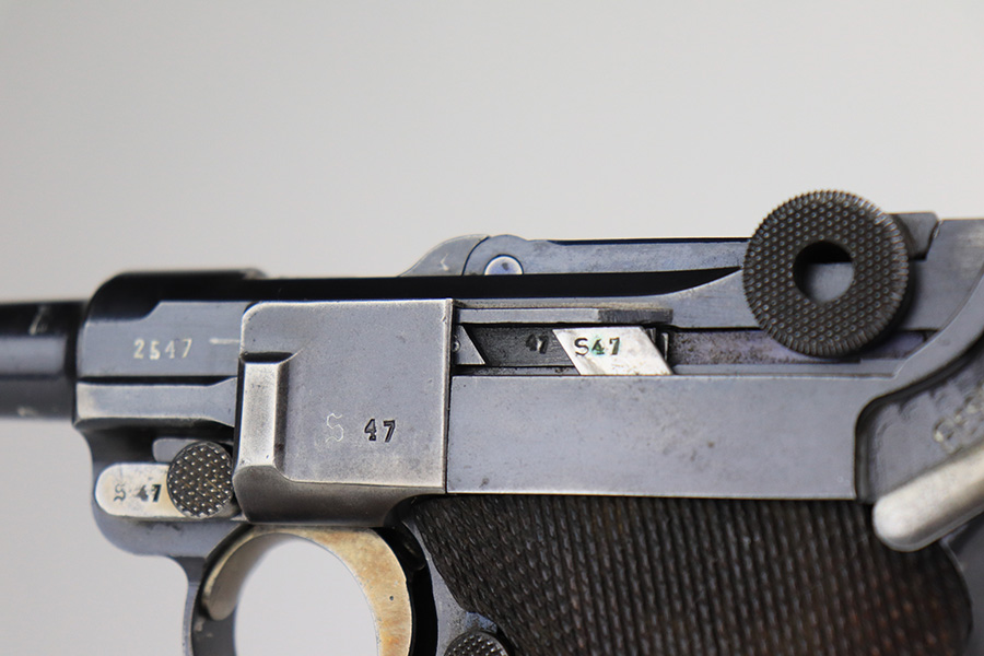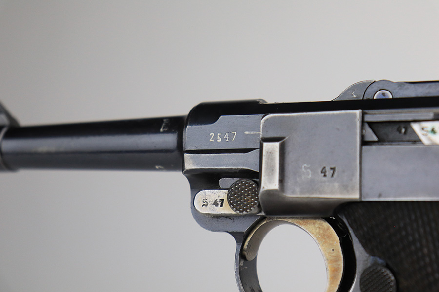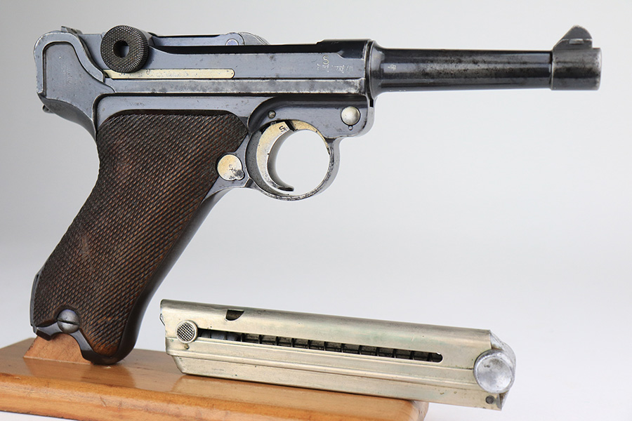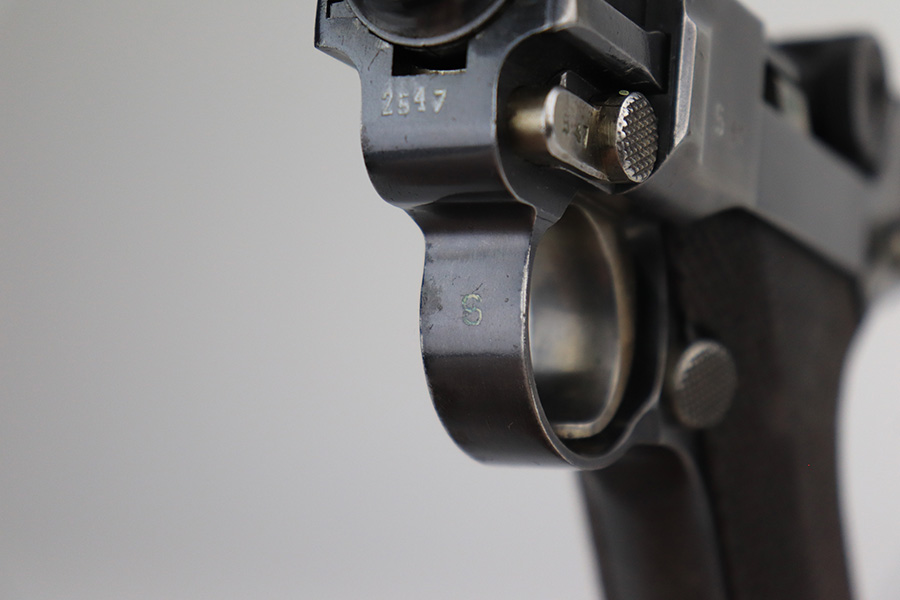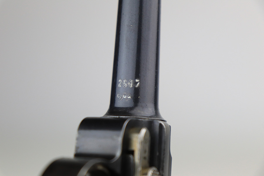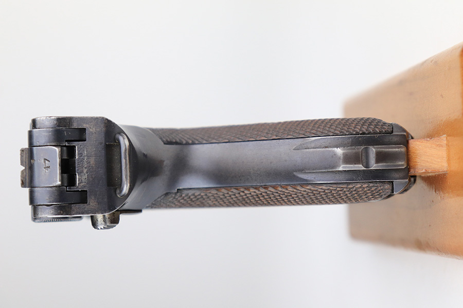 11/24/21 – This is a rare, early Nazi Mauser Luger from 1934 with K date code over chamber. There were only 10,000 of these Lugers produced, and only a tiny portion of those have survived in original condition, with their original magazine and grips. This one has the original, matching grips but the magazine is mismatched. It is a rare, original magazine with O/37 marking, but the serial number was ground and restamped at some point. The gun has roughly 60-70% of the original blue remaining, with visible thinning in many areas, and little straw remaining on the small parts. Right side rail and right side of the barrel have some freckling. All small parts are ‘S” marked, with a mix of gothic and script fonts. Bore has strong rifling but a little frost throughout. Grips show some handling wear but no cracks or chips.
