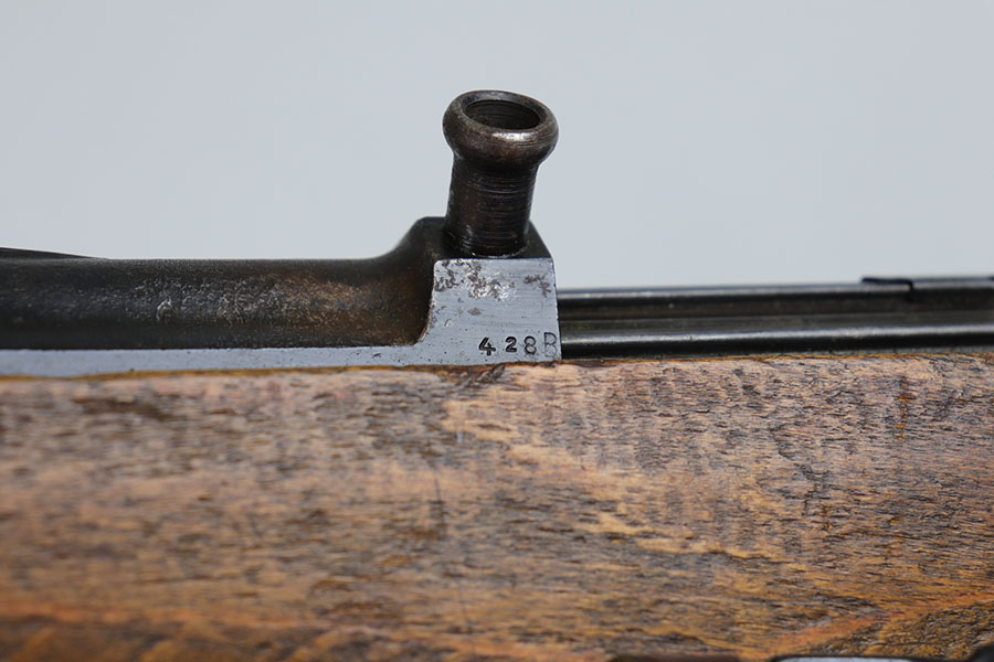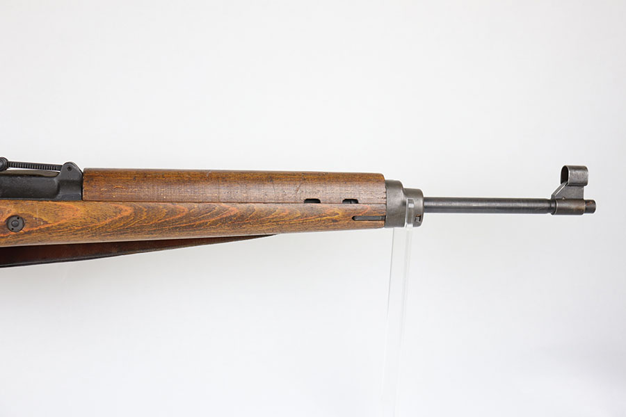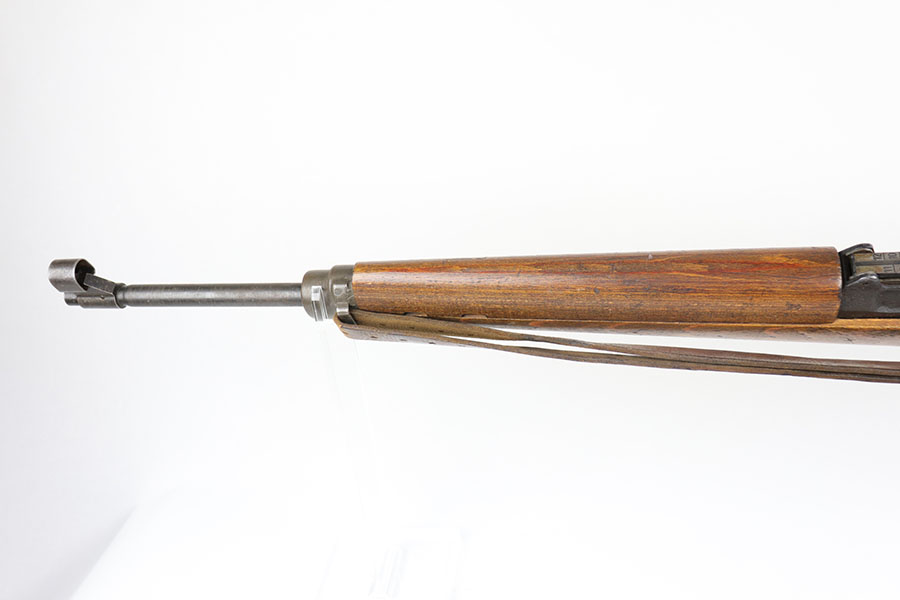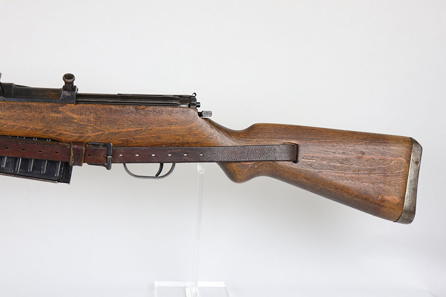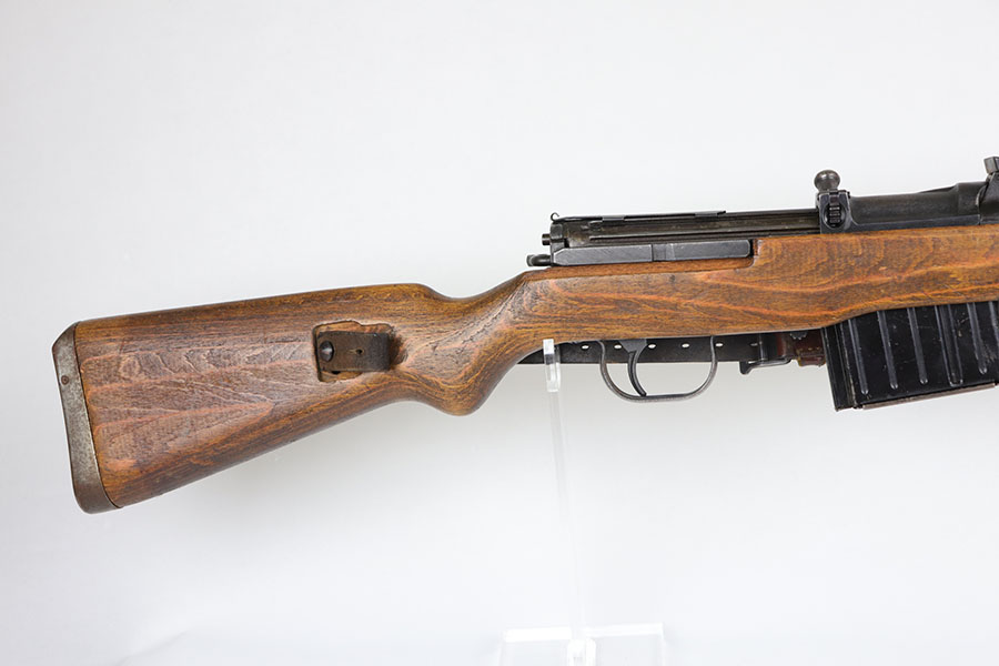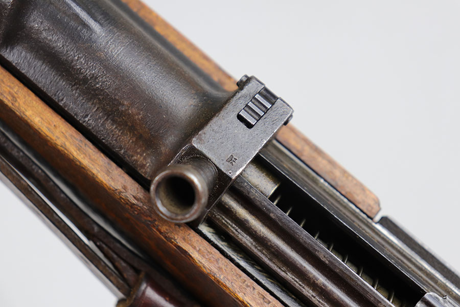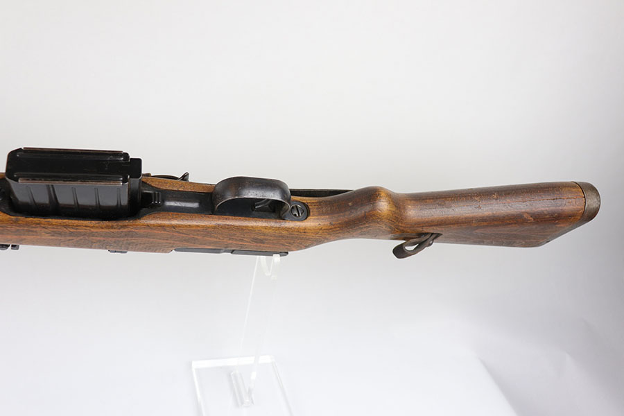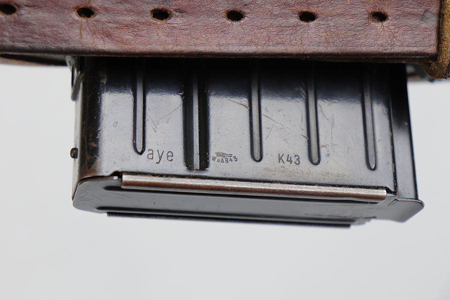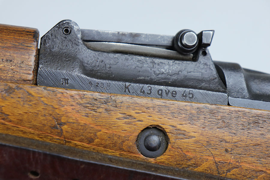 7/10/20 – This is the most uncommon variation of the German G43(K43) rifle, made in the final months of the war, around February-March of 1945. It was made at the Berliner Lubecker factory, which was assigned a ‘qve’ code in 1945 instead of the previous ‘bcd’ code. With a total of about 60,000 rifles made, this variation is one of the least encountered by the collectors and exhibits the late war rough machining and bluing. The gun is all original and matching, including the receiver, bolt and the buttstock. The stock has waffenamts on the wrist and right side, and serial is fairly clear on the underside. The blue doesn’t show much wear, mainly on front sight and trigger group, but the finish and machining are rough throughout. There is a crack along the bottom of the butt stock. Terrific bore. Magazine is ‘K43’ marked and ‘aye’ maker marked. Original sight hood but postwar sling present.