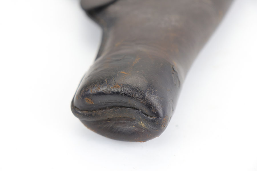 3/13/20 – This is a WW2 era holster for the Kongsberg model 1914 pistol. These are fairly scarce holsters, especially if they are waffen proof stamped. This holster has a waffen eagle proof on the back leather, and we believe this is an original, period correct stamp. See the close up in photos. The holster has some normal signs of aging and light wear throughout, clearly showing signs of use. Brass closure stud. All original stitching is tight and in tact.