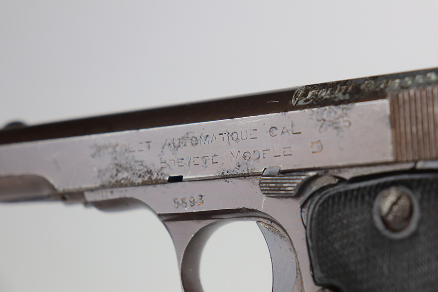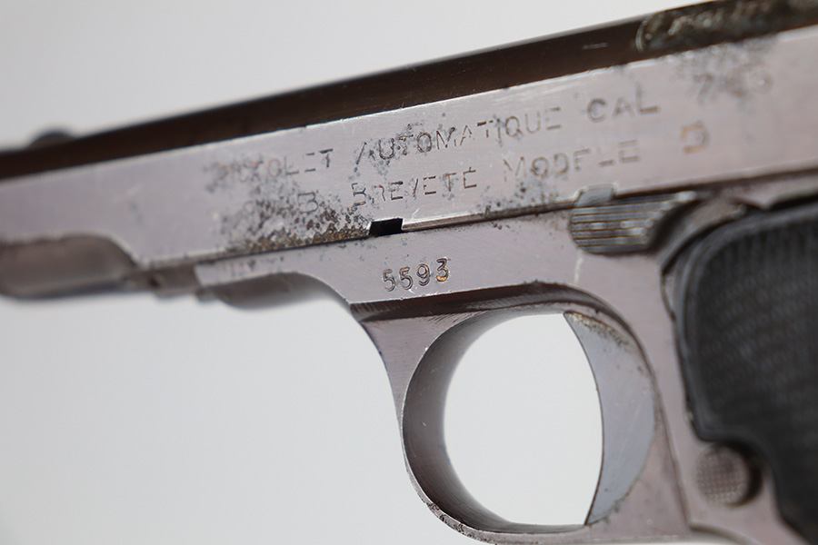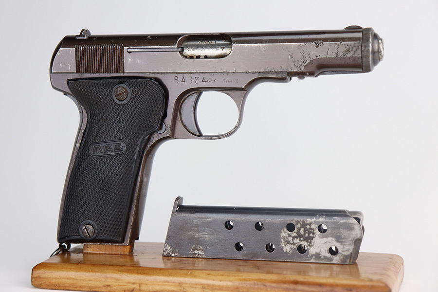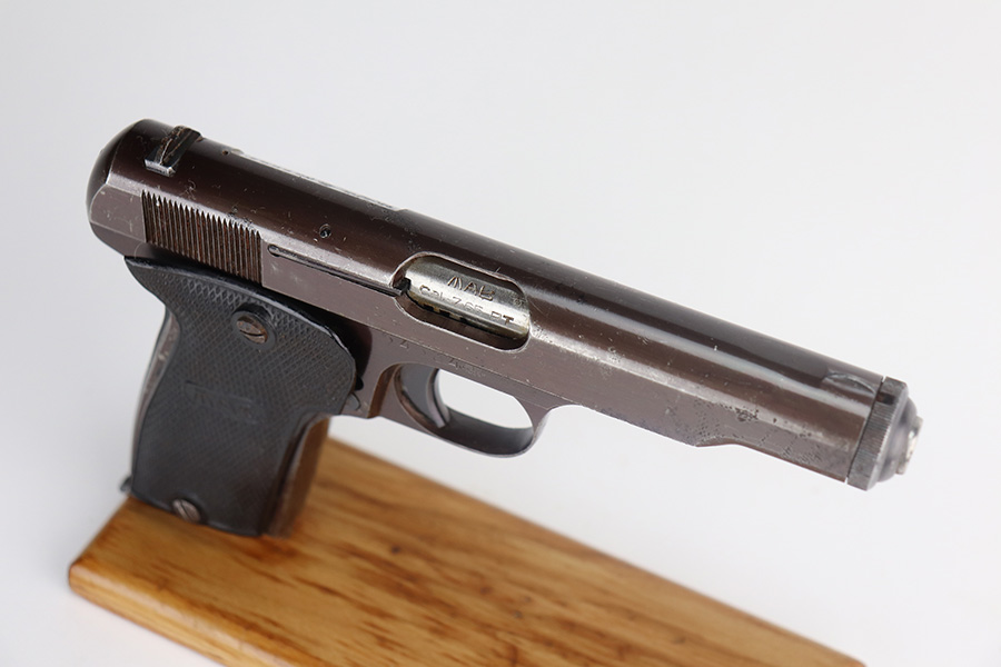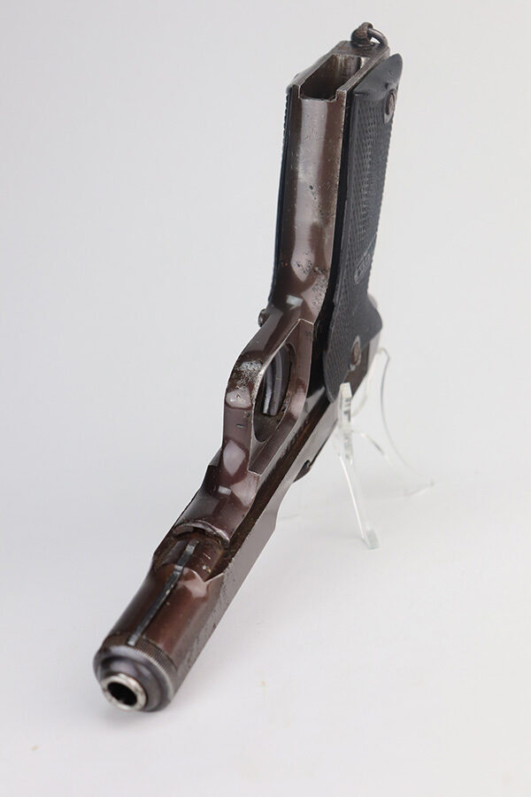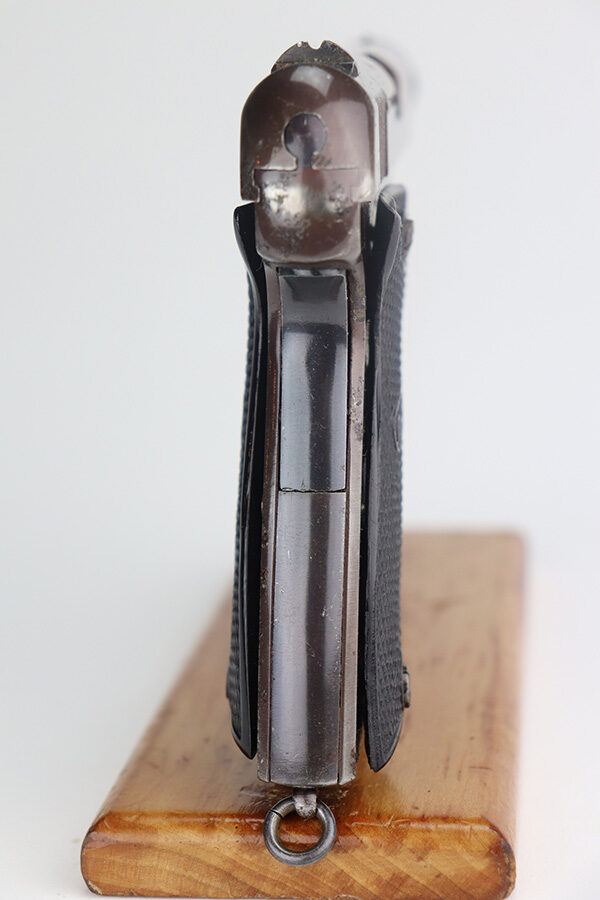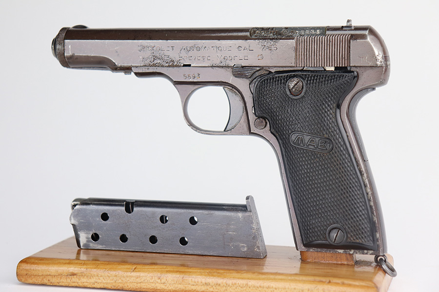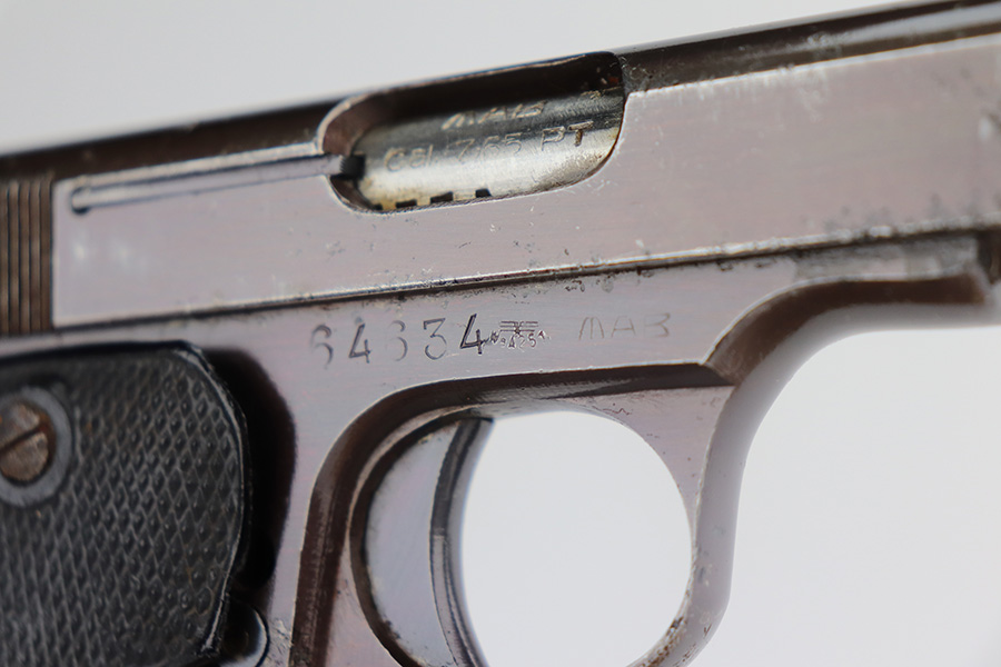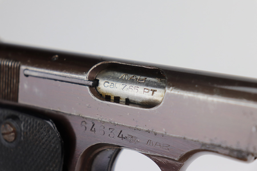 5/26/21 – This is a French MAB Model D issued to the Nazi military during WW2. It is matching and has the proper waffen proofs. There is also a “Politi Nr 5593” marking on the left side of the slide, indicating this gun was diverted to the Norwegian police. There is a matching police number on the left side of the frame. The gun has retained about 90% of its plumb-colored finish. There is minor wear on the front strap and high edges in general. While there isn’t much actual finish loss, there is significant pitting throughout. The grips are nice but slightly warped in the top corners. Comes with a correct magazine that is also pitted. Minty bore.