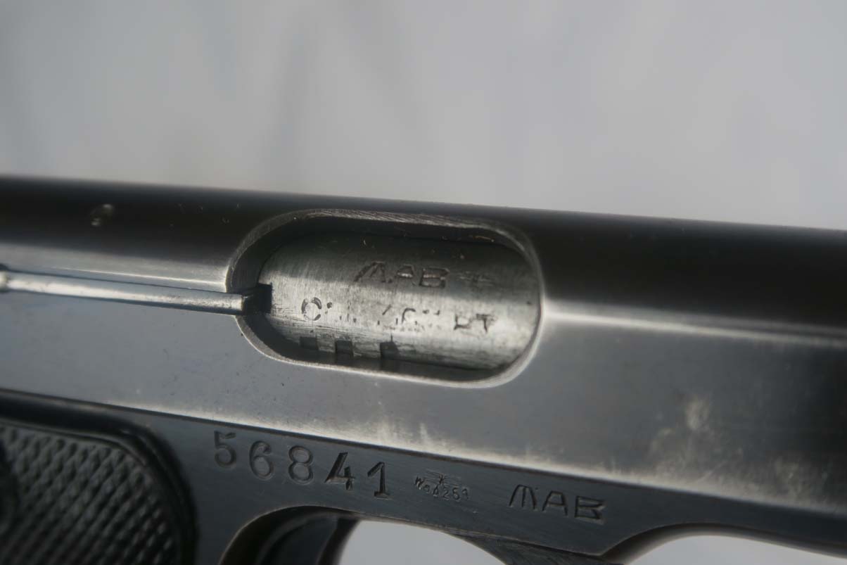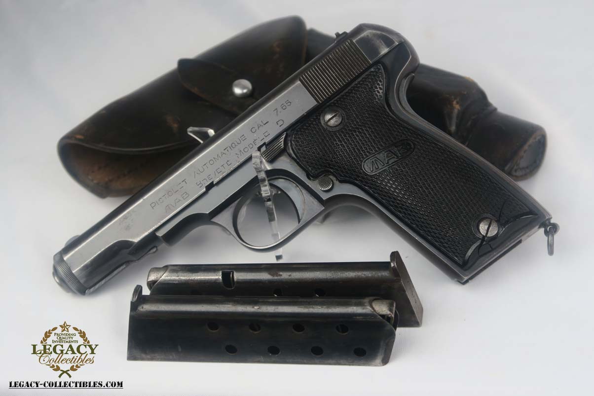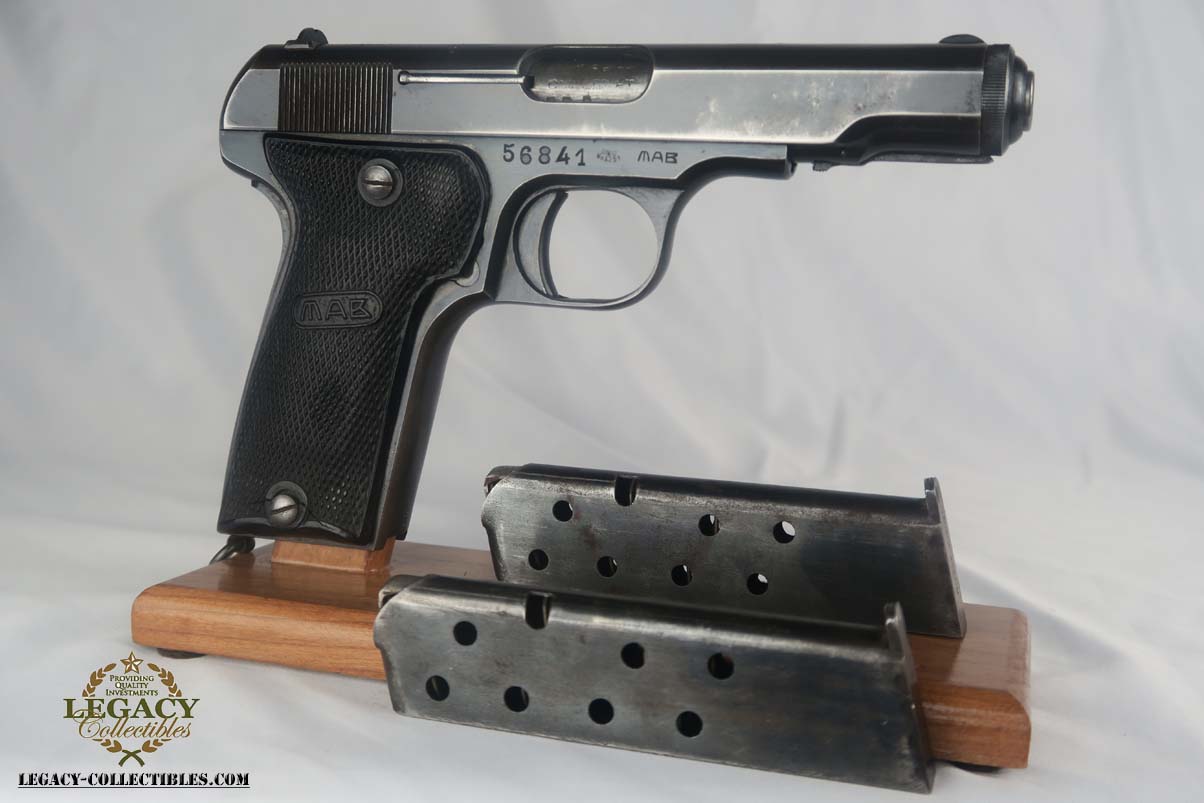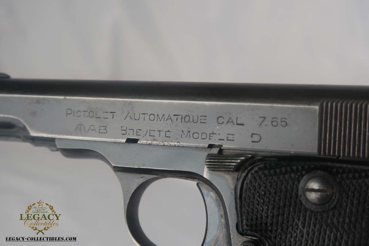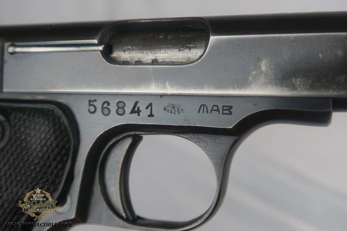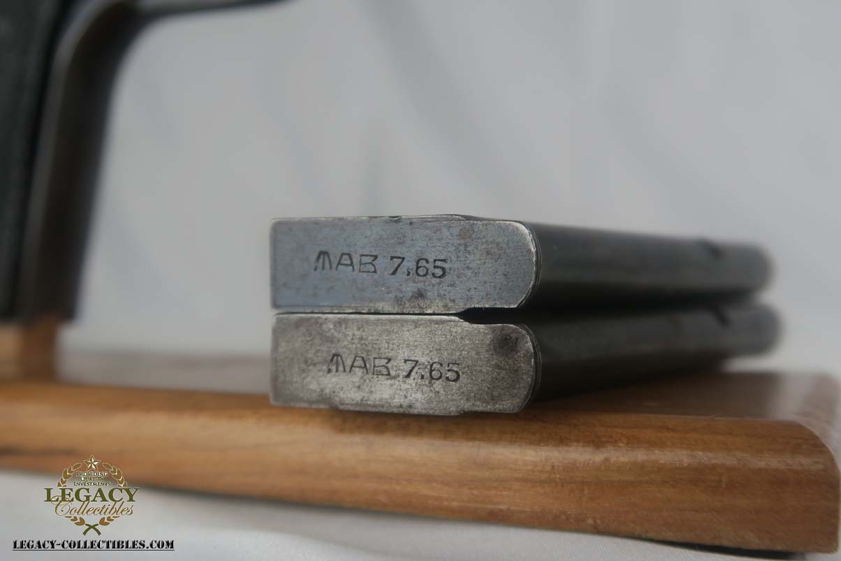 8/16/17 – This is a Nazi-issued French MAB model D rig, with correct holster and spare magazine.  The model D was produced by Manufacture D’Armes Des Bayonne for the German Army after the June 26th occupation of France.  Pistols in this serial range were E/WaA251 stamped.  This one has about 85% of its original finish left, with evenly spread thinning and patina throughout the straps.  The holster is in good condition, and properly E/WaAD20 proofed.  Magazines and grips are correct, but both grip panels have cracks that appear to have come from someone screwing the screws in too tight.  Nice bore, just a little cloudy.