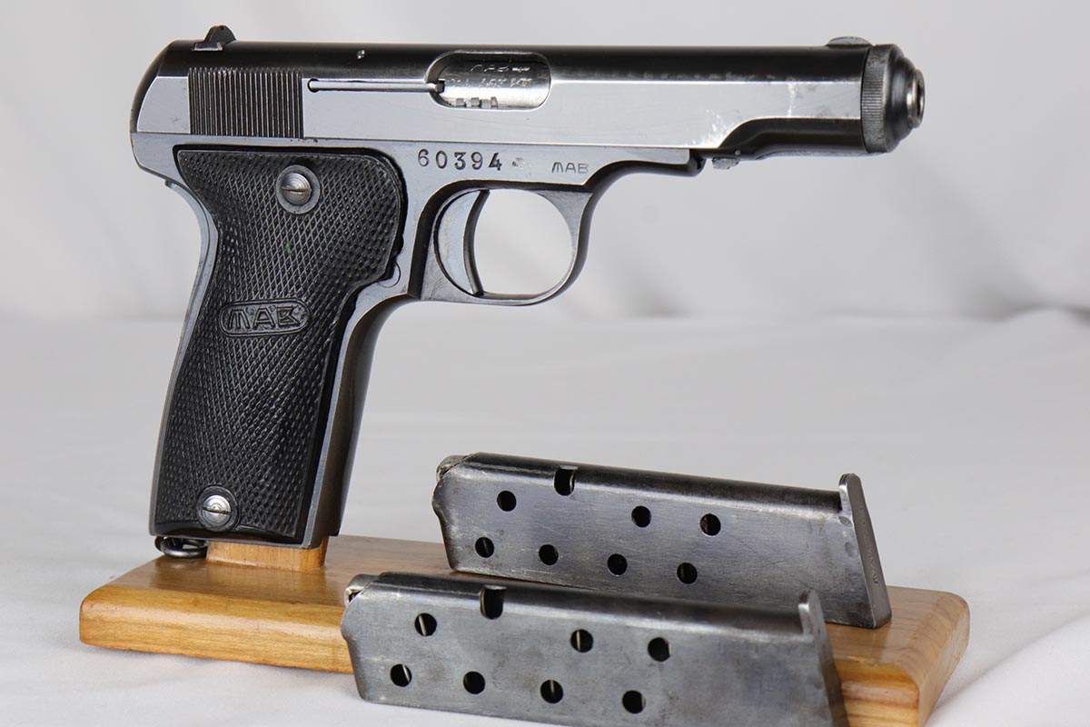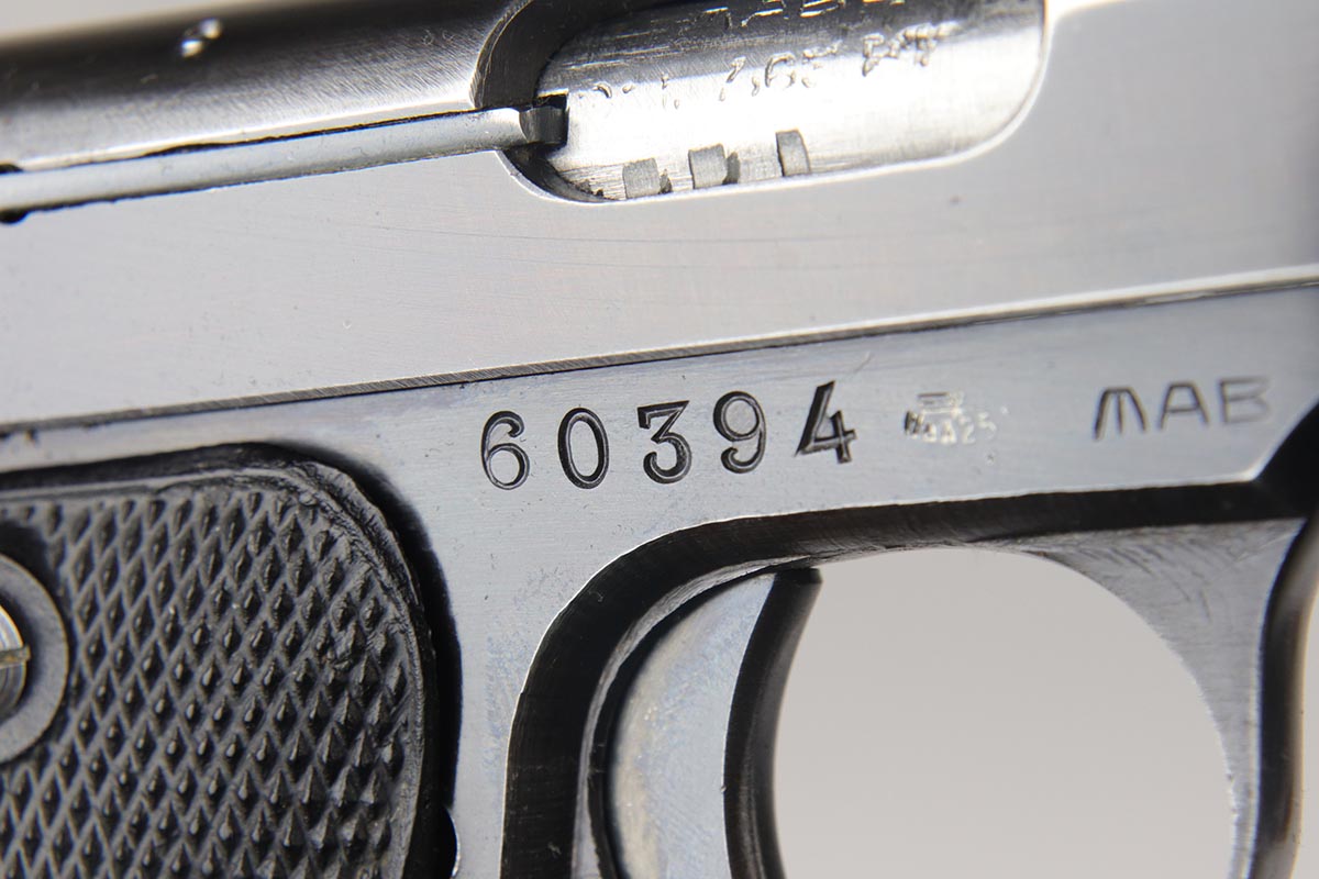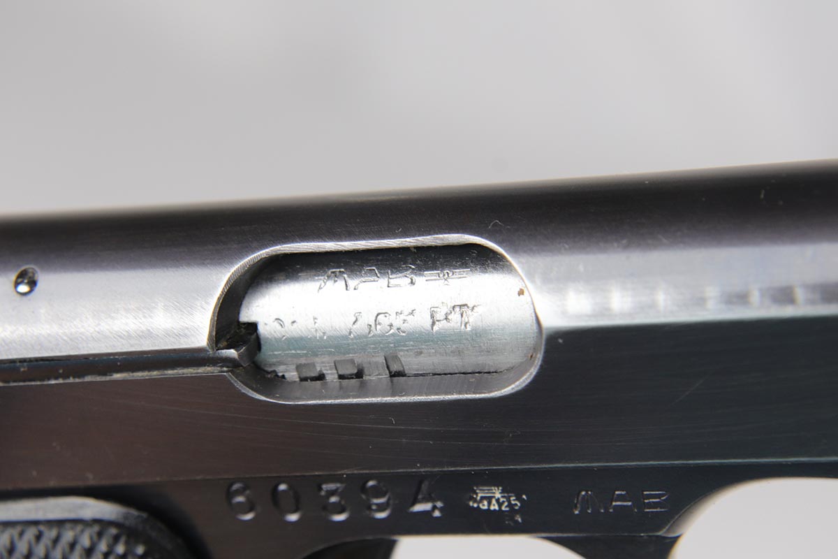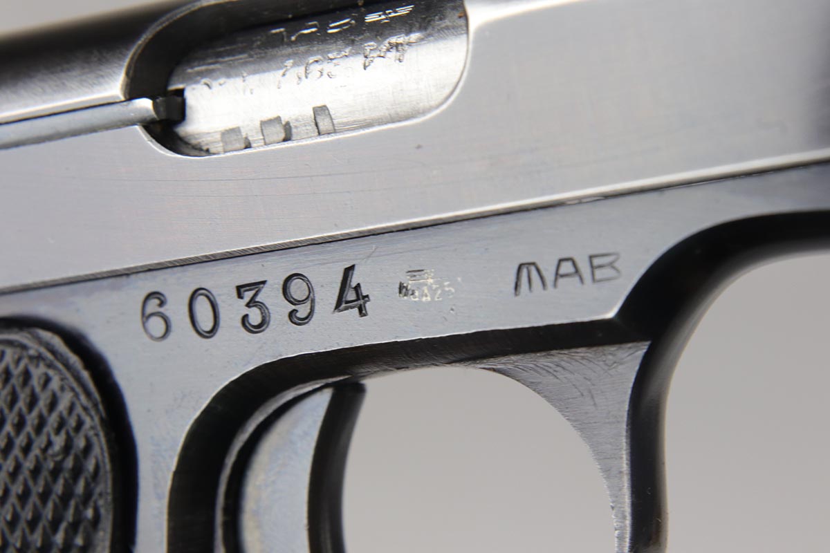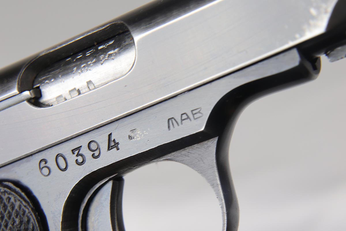 6/21/18 – This is a hard-to-find French MAB Model D rig that was manufactured for the German Army following their occupation of France.  It has proper WaA251 proofs on the frame, and comes with two total original magazines and an original holster that is waffen marked.  The bluing rates in the low 90s with holster wear on the edges, and some finish loss along the top edge of the right side slide.  The grips show some age but no chips or cracks.  Very nice bore with no major flaws.
