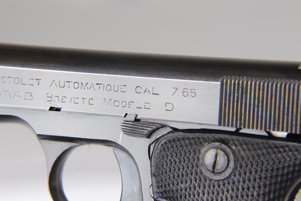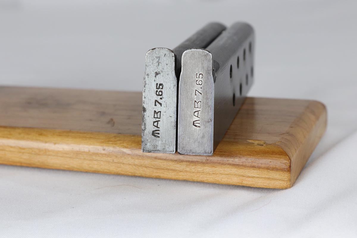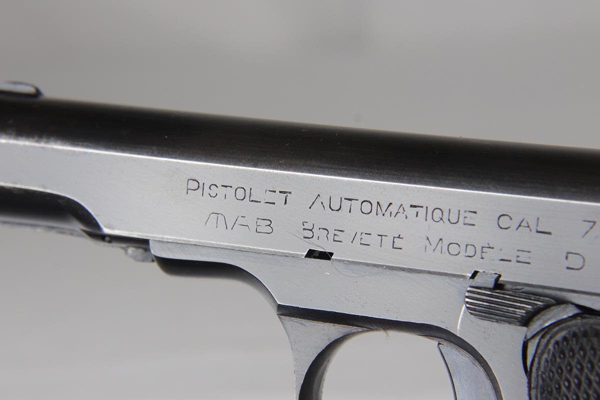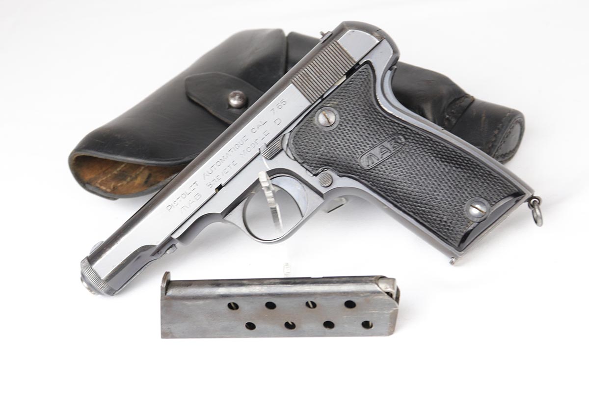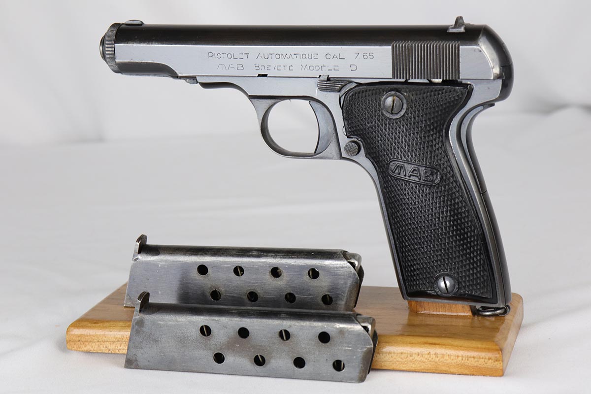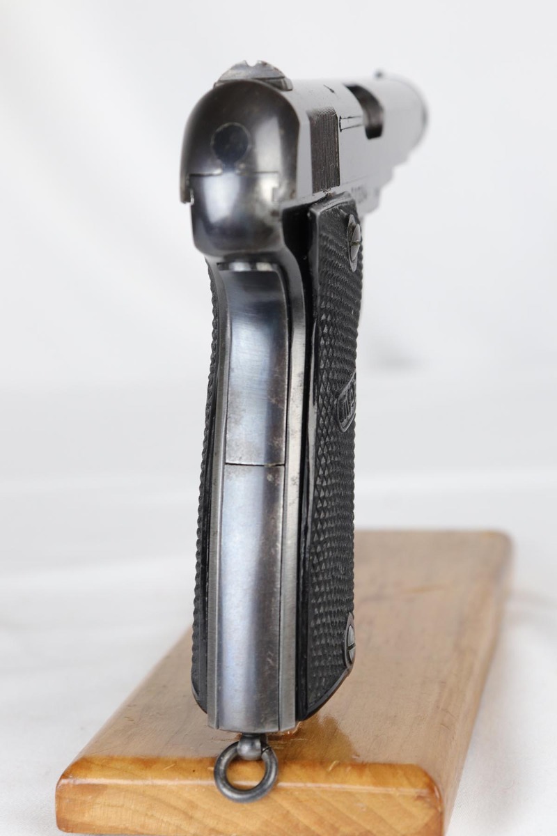 6/21/18 – This is a hard-to-find French MAB Model D rig that was manufactured for the German Army following their occupation of France.  It has proper WaA251 proofs on the frame, and comes with two total original magazines and an original holster that is waffen marked.  The bluing rates in the low 90s with holster wear on the edges, and some finish loss along the top edge of the right side slide.  The grips show some age but no chips or cracks.  Very nice bore with no major flaws.