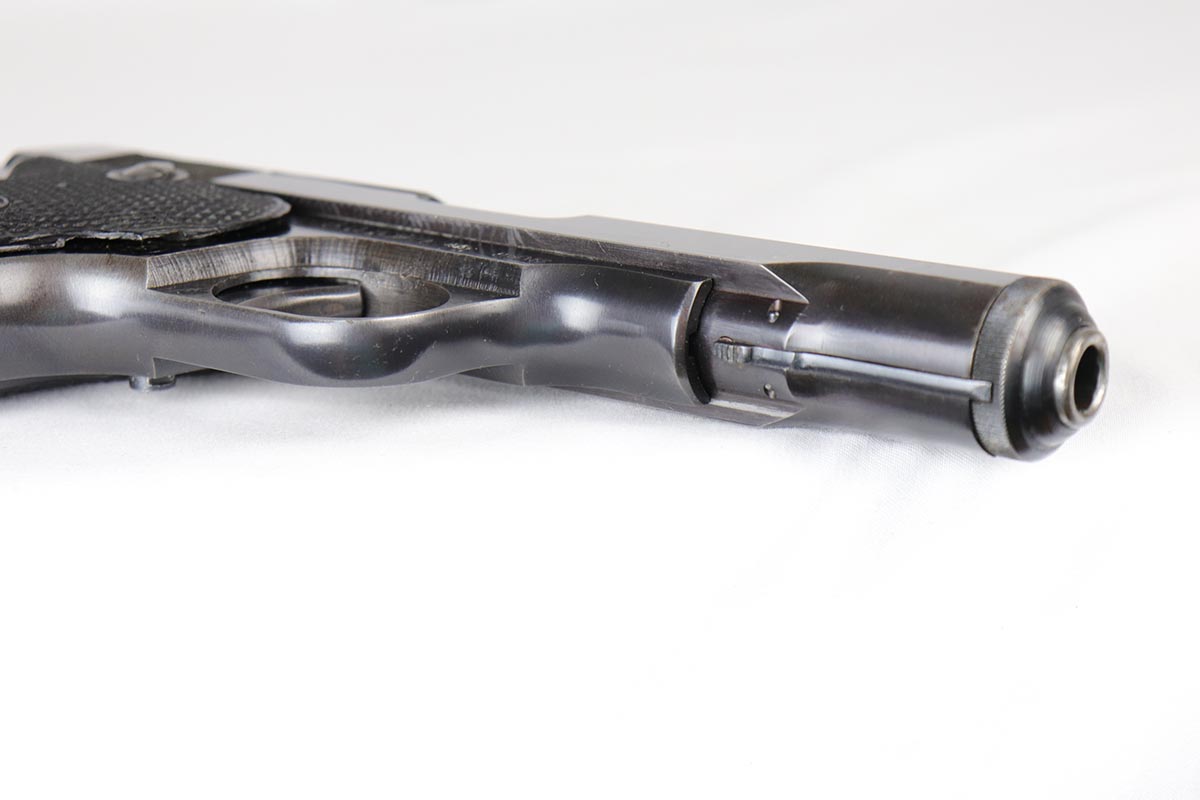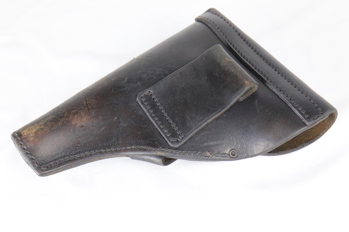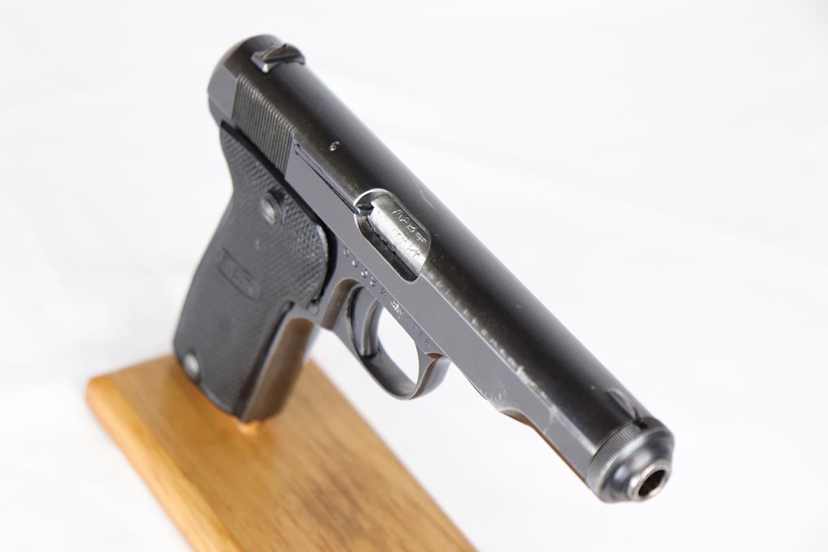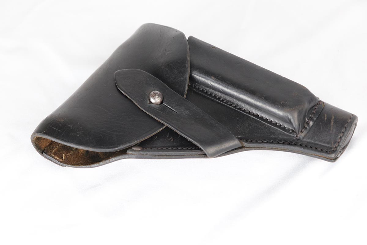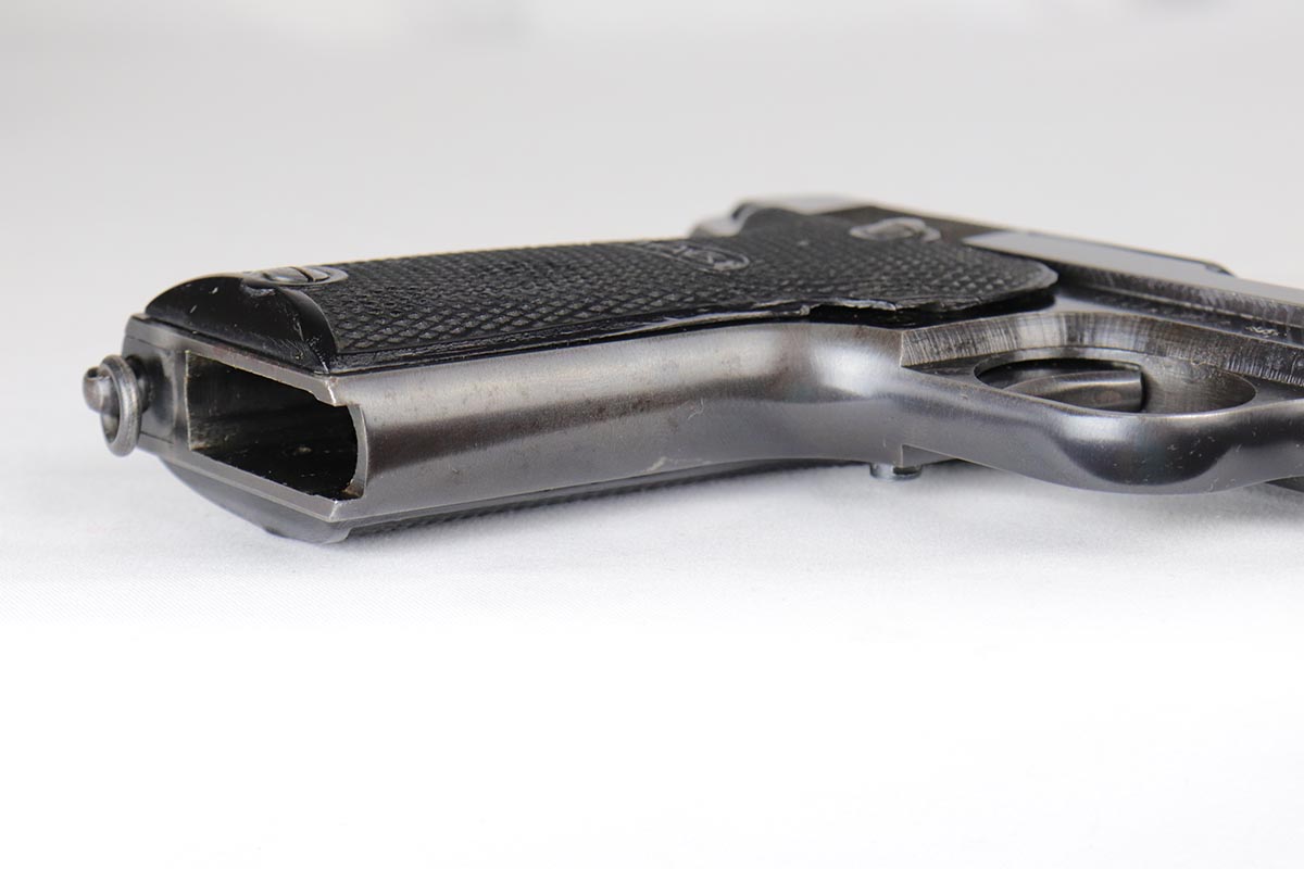 6/21/18 – This is a hard-to-find French MAB Model D rig that was manufactured for the German Army following their occupation of France.  It has proper WaA251 proofs on the frame, and comes with two total original magazines and an original holster that is waffen marked.  The bluing rates in the low 90s with holster wear on the edges, and some finish loss along the top edge of the right side slide.  The grips show some age but no chips or cracks.  Very nice bore with no major flaws.