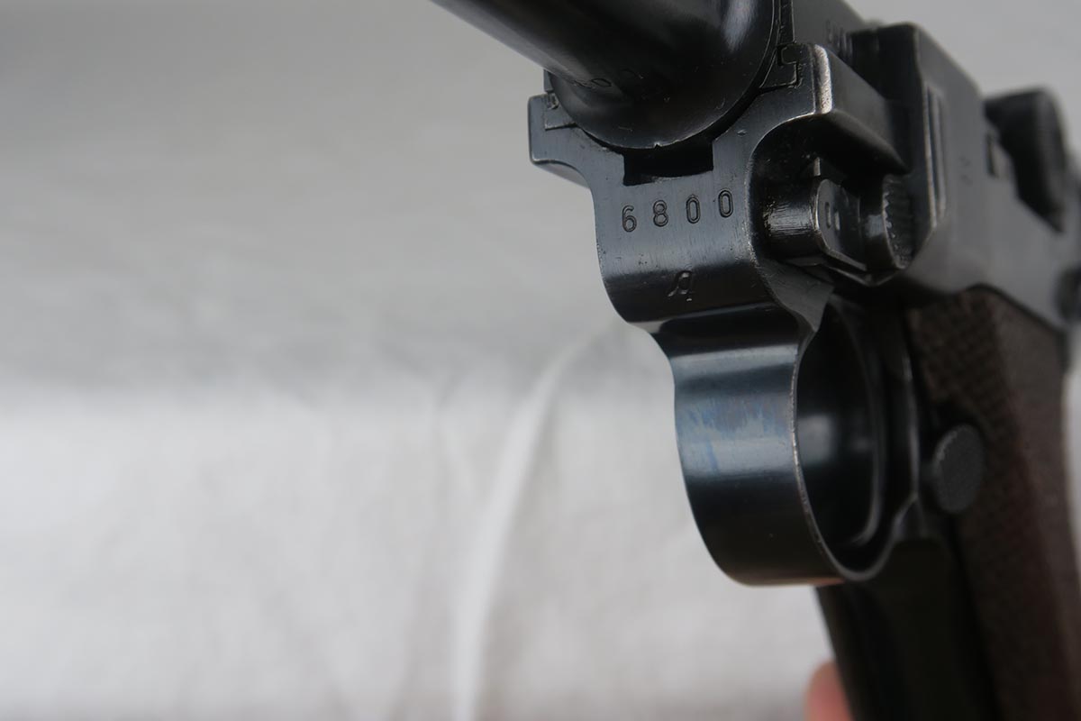 12/5/17 – This is a Mauser-made luger from 1941 with original matching magazine.  The pistol is all matching and correct with about 95% blue remaining.  There is holster wear on all the standard high edge areas.  The right grip panel is faintly numbered but matching to the gun, but the left panel is numbered top a different gun.  Pistol has excellent bore.