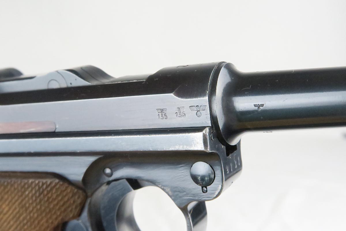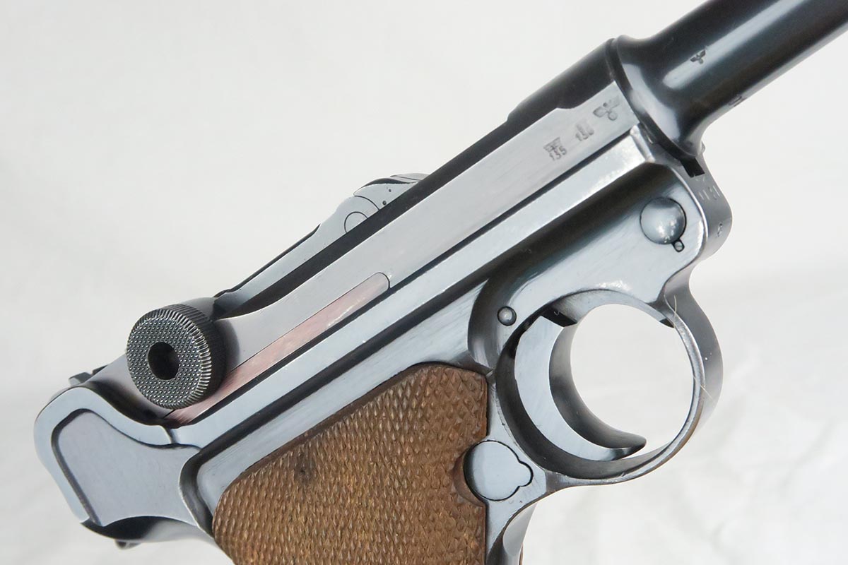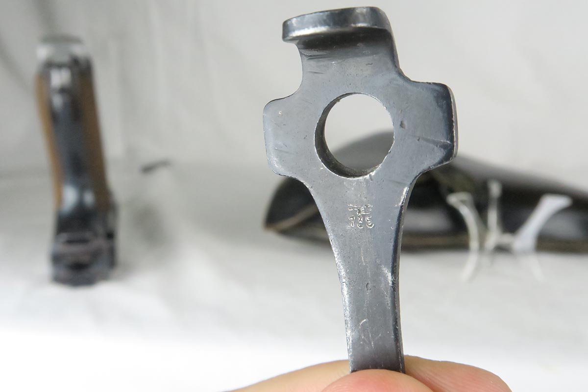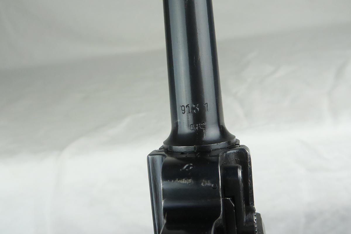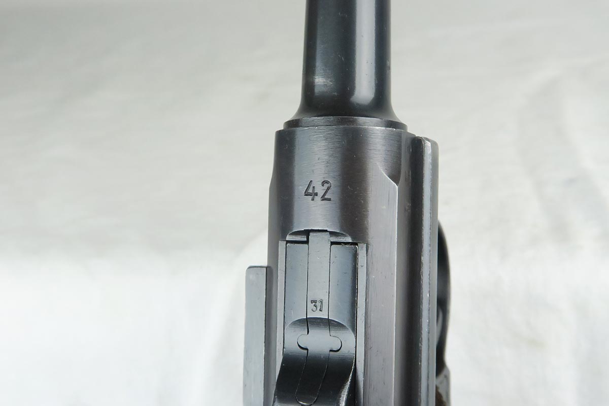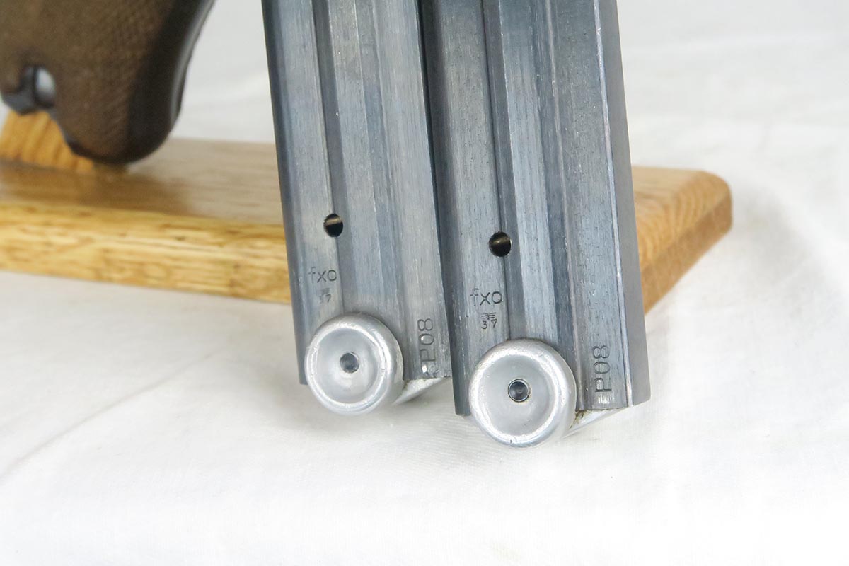12/19/17 – This is a very nice and complete Mauser Luger rig from 1942. The gun is all original and matching, including the grips but not the magazines. The magazines are scarce blank-bottom variants, with fxo proof on the body. The finish on the pistol rates at about 96% with most of the wear on the sideplate and left side muzzle. The rig includes a rare Eagle/135 proofed tool, and an excellent 1942 dated holster. It is maker marked (cey) and waffen proofed. The pistol bore is excellent and shiny.