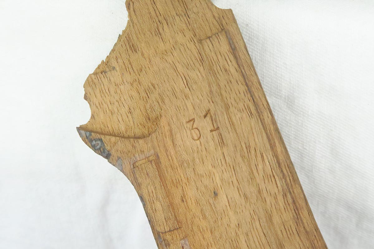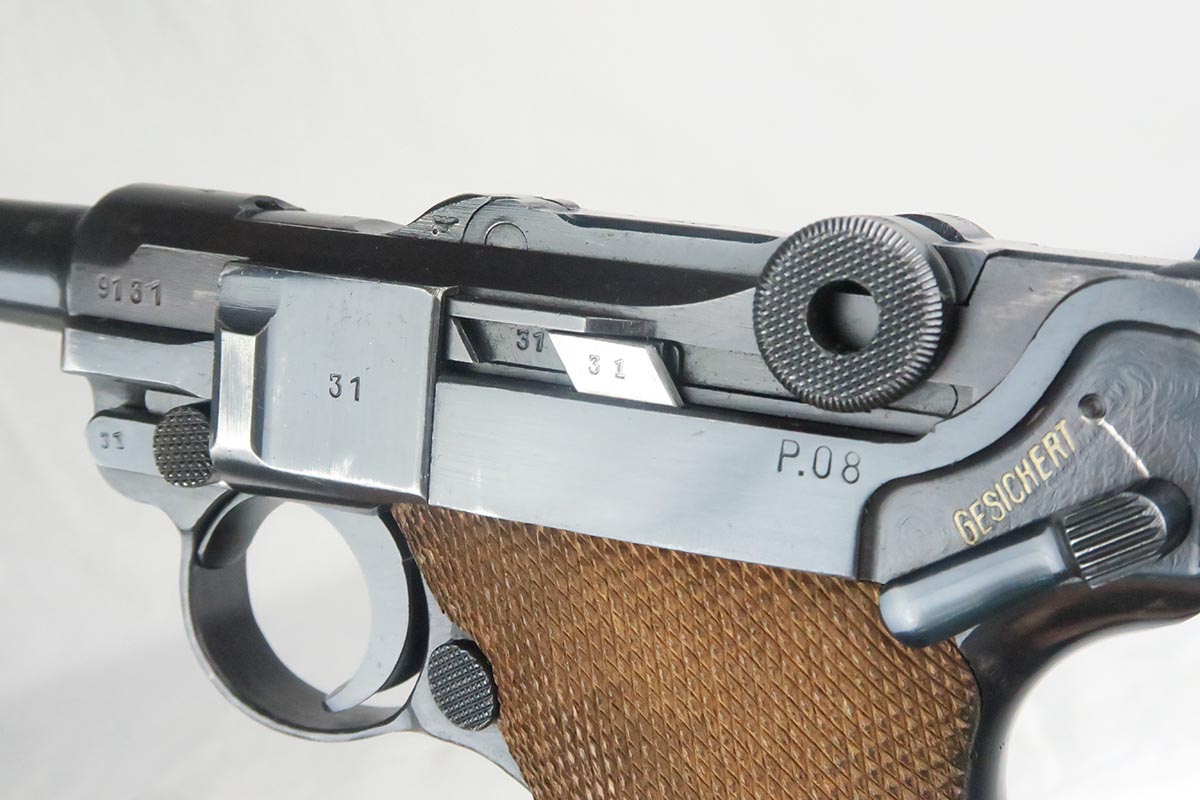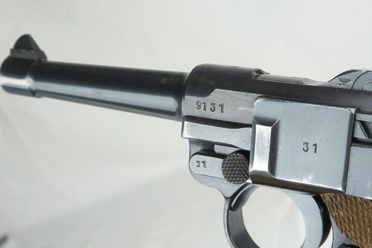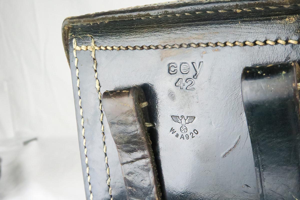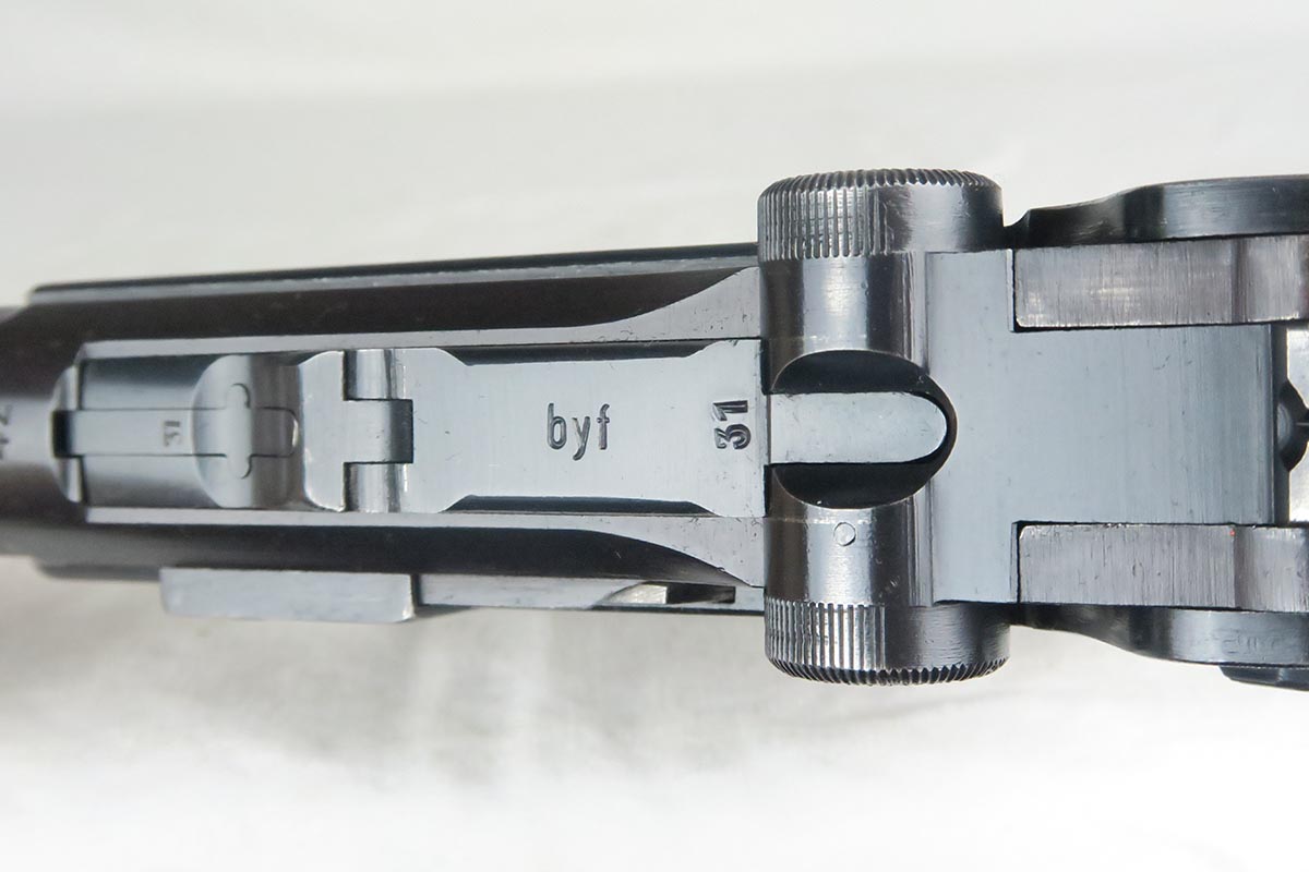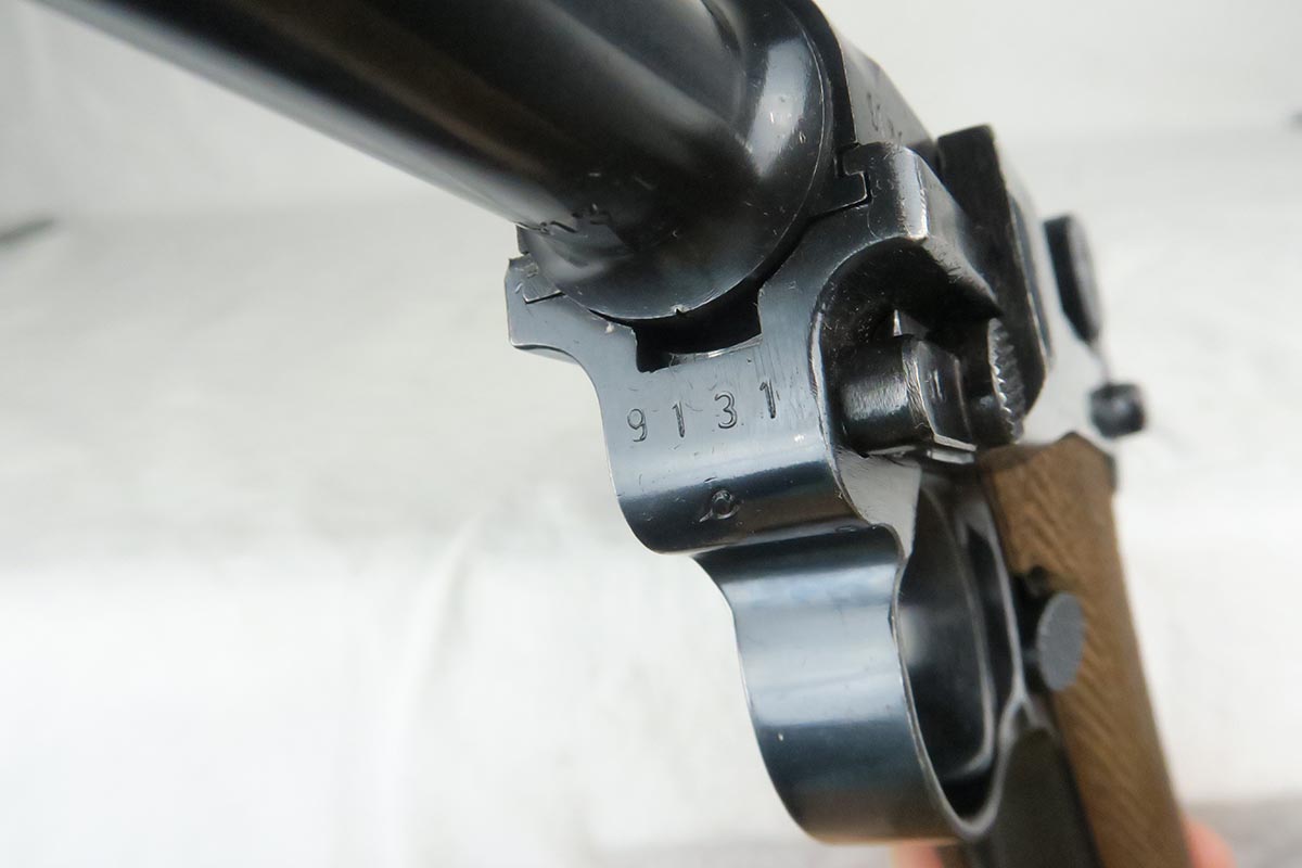 12/19/17 – This is a very nice and complete Mauser Luger rig from 1942. The gun is all original and matching, including the grips but not the magazines. The magazines are scarce blank-bottom variants, with fxo proof on the body. The finish on the pistol rates at about 96% with most of the wear on the sideplate and left side muzzle. The rig includes a rare Eagle/135 proofed tool, and an excellent 1942 dated holster. It is maker marked (cey) and waffen proofed. The pistol bore is excellent and shiny.