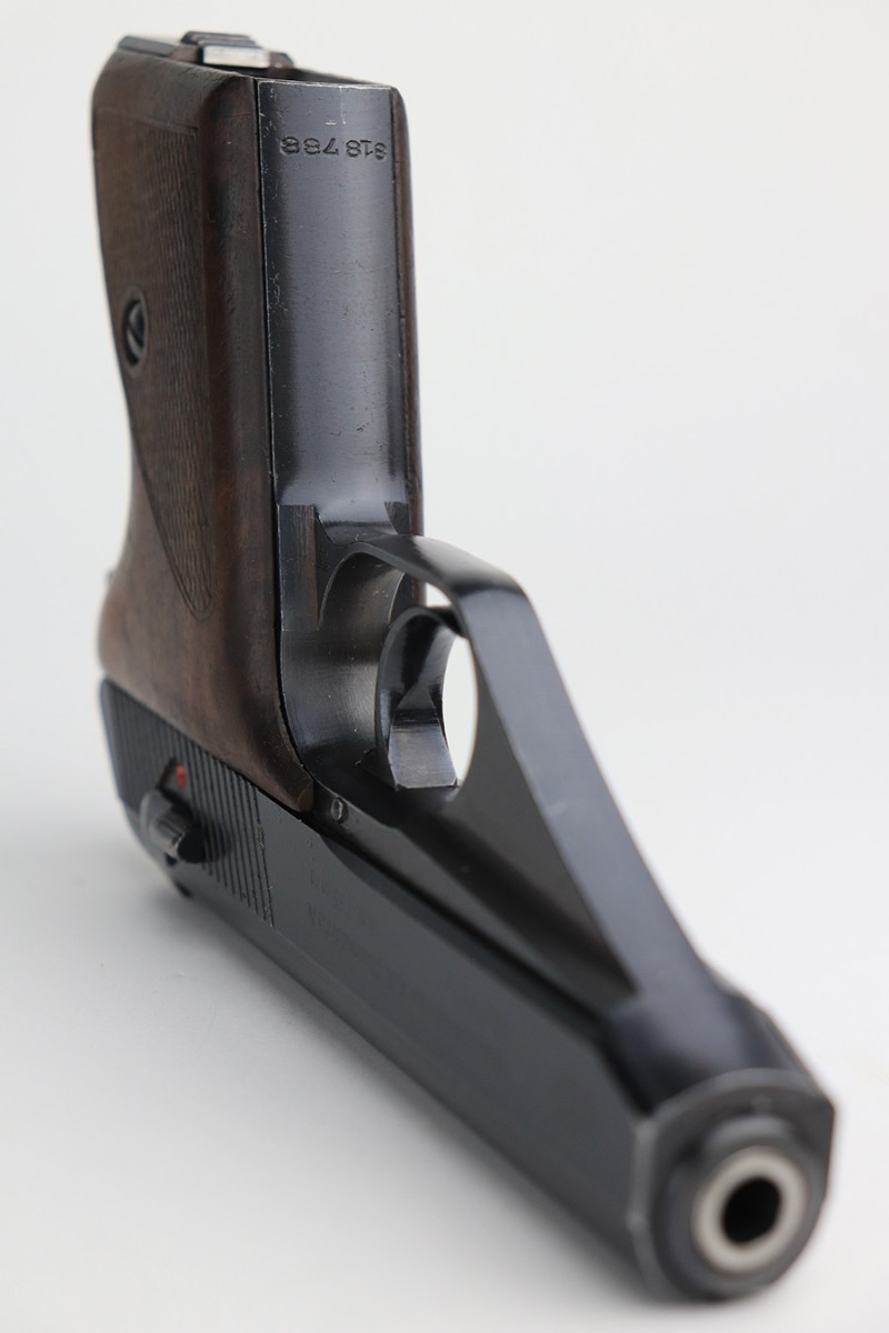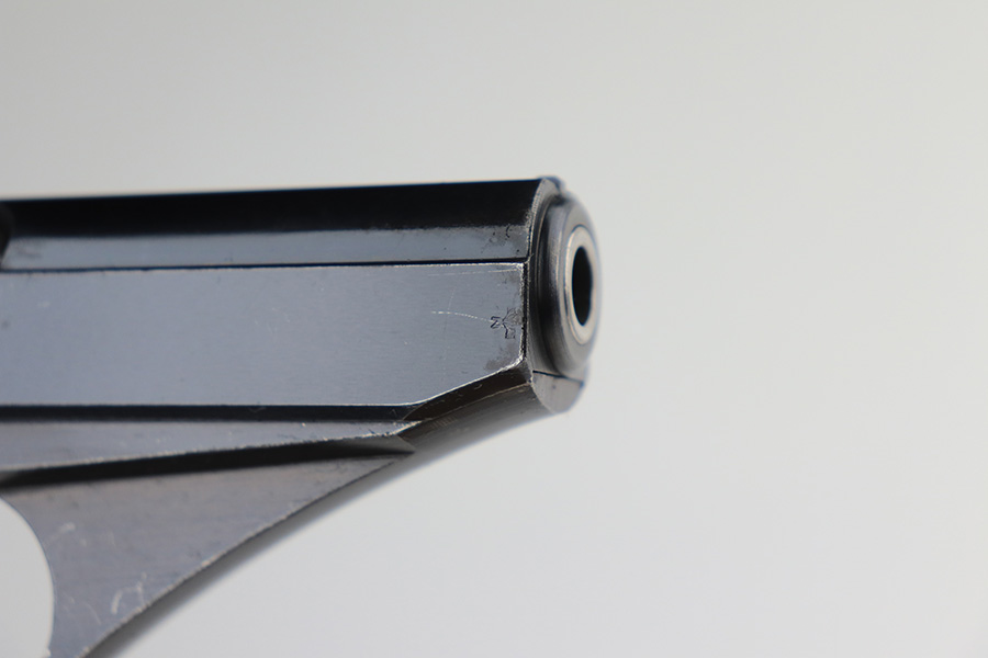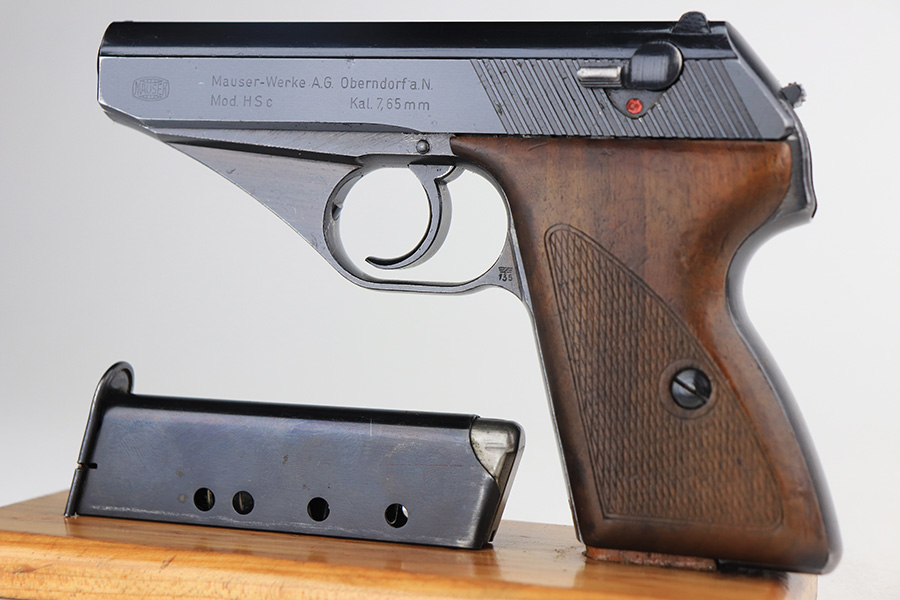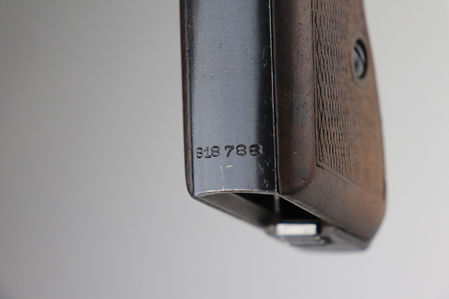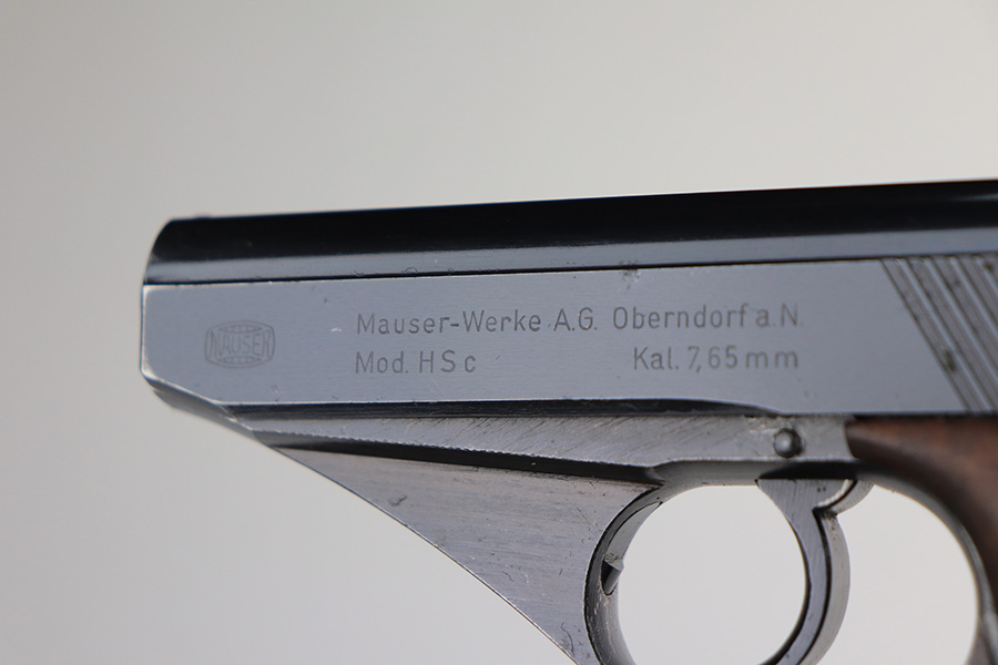 2/8/22 – This is an excellent example of a Mauser HSC issued to the Nazi military in 1943. It is all matching and has the proper “Eagle 135” Nazi military acceptance proof on the left side of the trigger guard. It has retained about 97% of its bluing. There is just a hint of thinning on the back strap, a hint of wear around the muzzle, and some spotty, streaky wear on the right side of the slide. There are a few very small scratches on the right side of the slide, right side of the frame, and on the front strap. Comes with slightly worn wood grips. There are small bruises here and there and a chip in the top corner of the right panel. Also comes with a post-war magazine. The bore is near-mint.