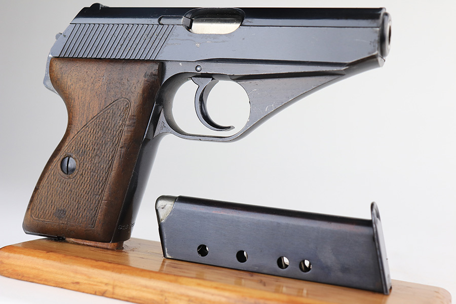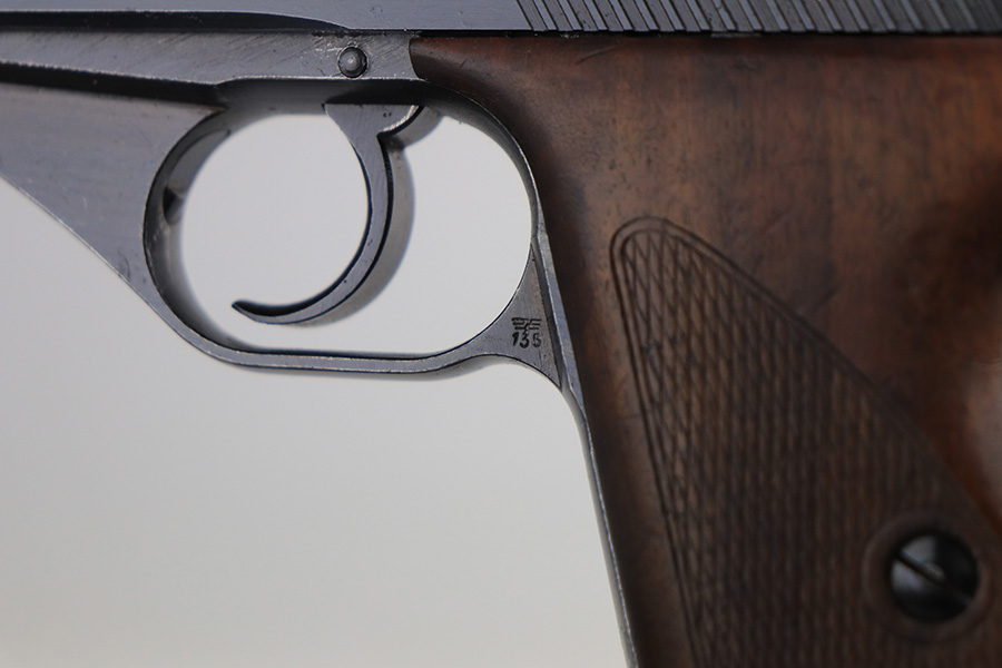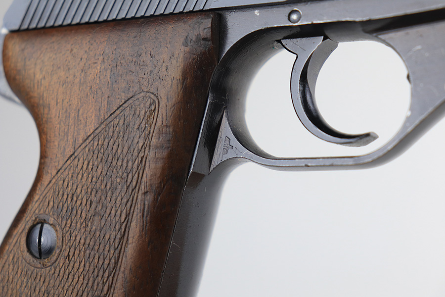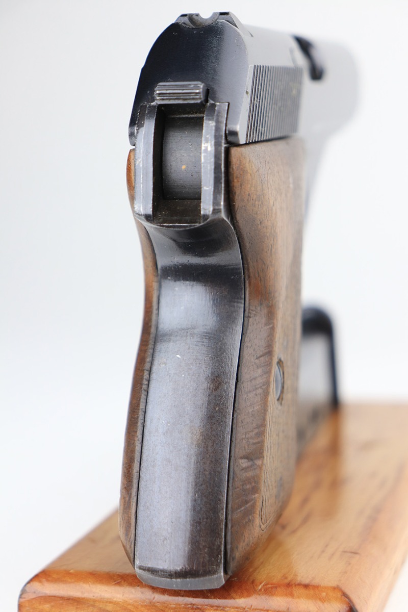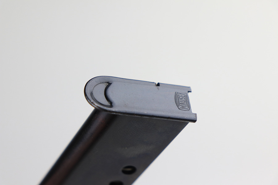 2/8/22 – This is an excellent example of a Mauser HSC issued to the Nazi military in 1943. It is all matching and has the proper “Eagle 135” Nazi military acceptance proof on the left side of the trigger guard. It has retained about 97% of its bluing. There is just a hint of thinning on the back strap, a hint of wear around the muzzle, and some spotty, streaky wear on the right side of the slide. There are a few very small scratches on the right side of the slide, right side of the frame, and on the front strap. Comes with slightly worn wood grips. There are small bruises here and there and a chip in the top corner of the right panel. Also comes with a post-war magazine. The bore is near-mint.