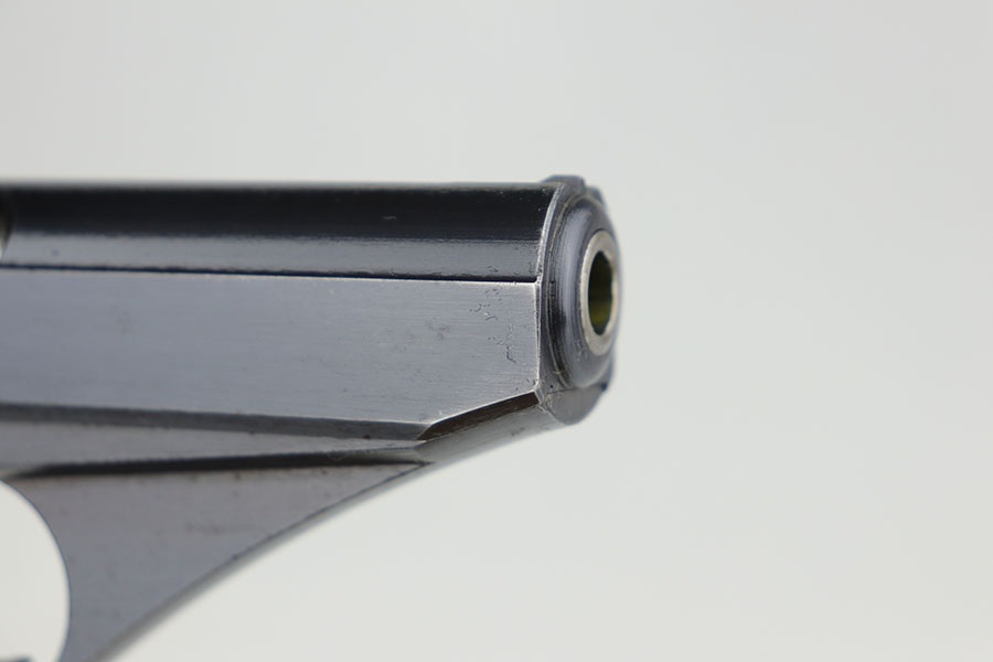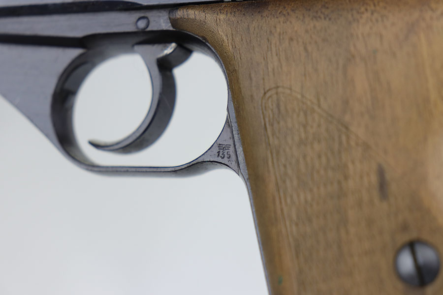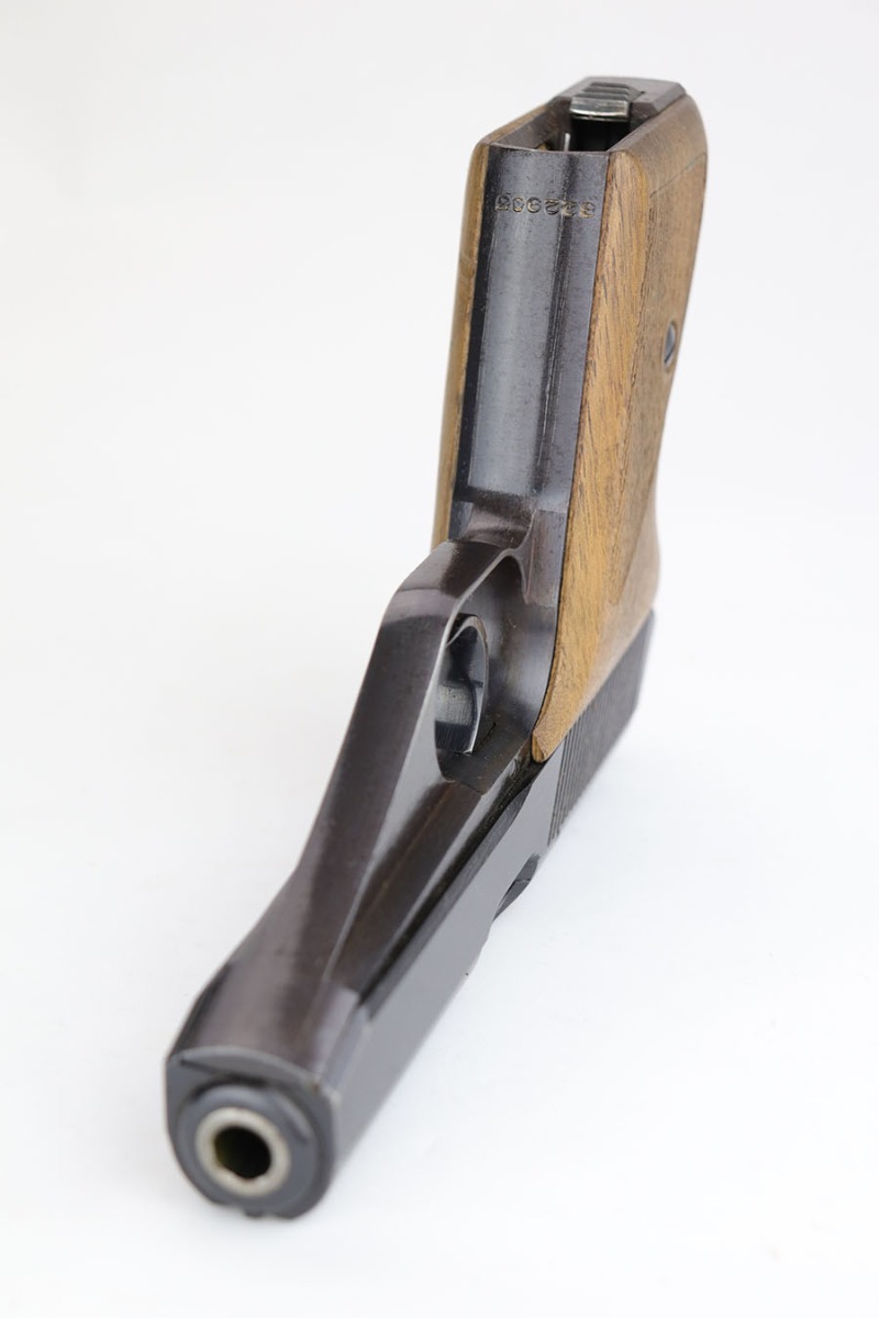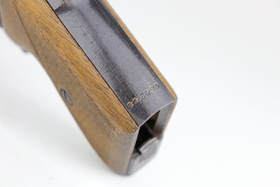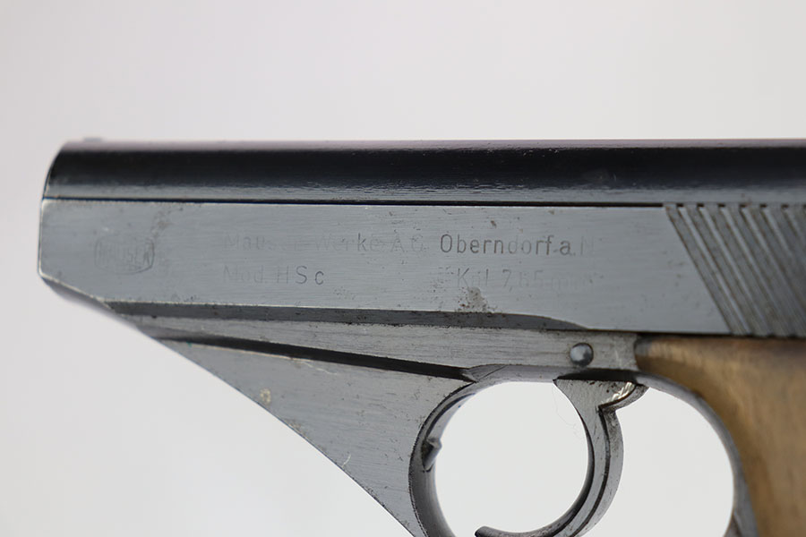 4/15/20 – This is an all matching and original Nazi Mauser HSc from early 1943. The pistol has minimal bluing loss, with just a bit of muzzle wear and a little finish loss on the bottom of the back strap. There is some surface freckling on the left side of the slide though, and some oxidation on the straps. Excellent bore and grips. Blank bottom magazine.