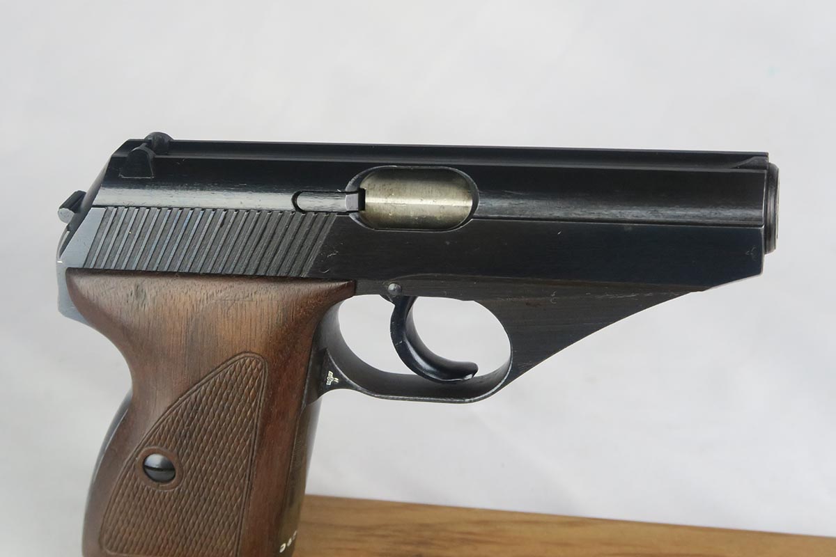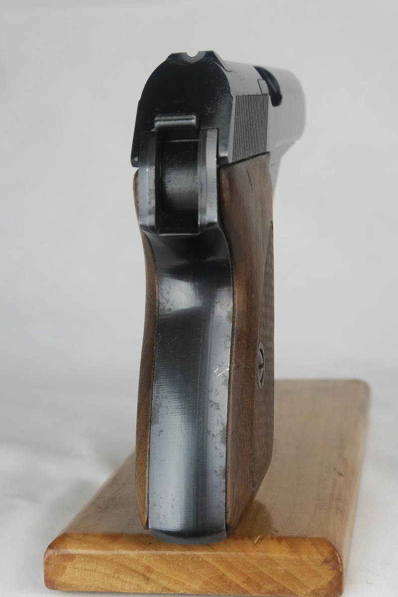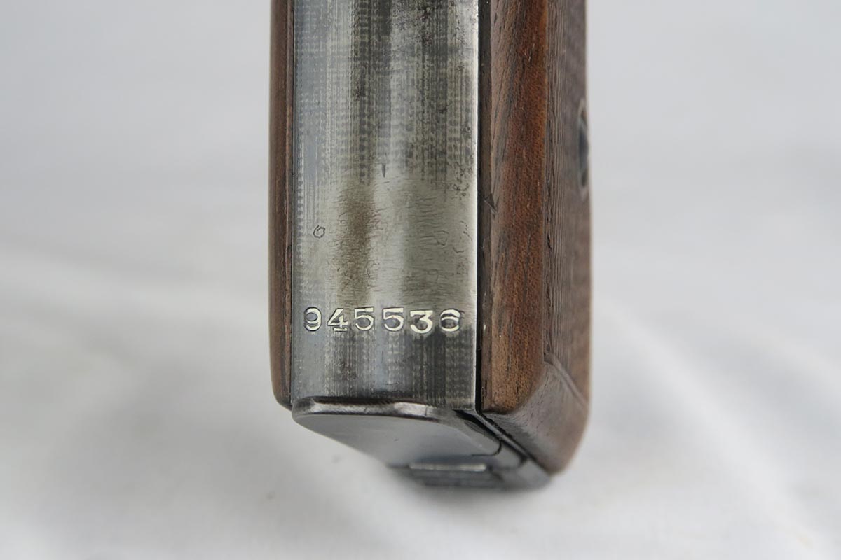 3/30/18 – 3/30/18 – This is a nice example of a Nazi issued Mauser HSc from the very end of the war. The original finish rates at about 92%, with a near-mint profile but a thin front strap. The trigger guard is WaA135 proofed and the serial dates this pistol to very late in the war. The grips and magazine are excellent, as is the bore.