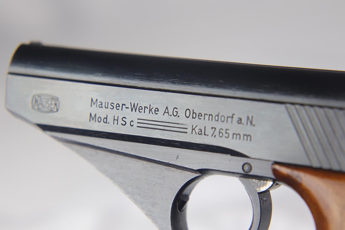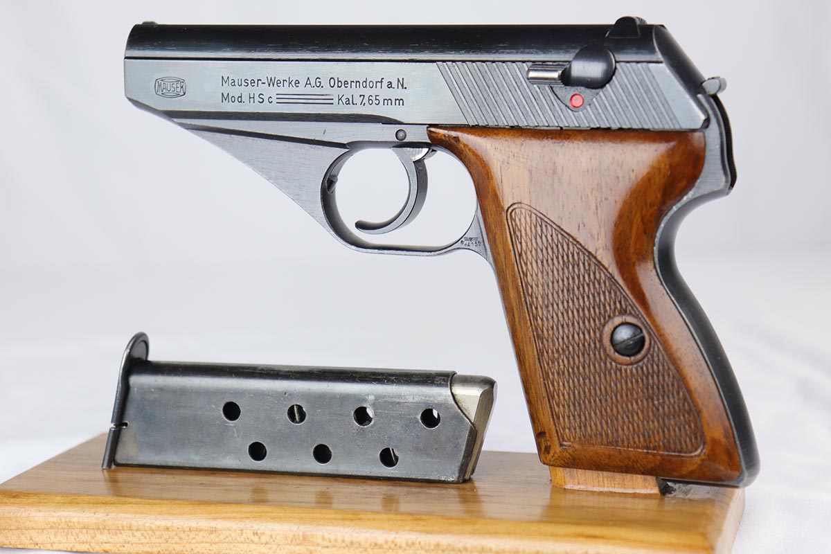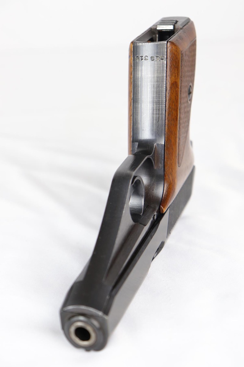 10/2/18 – This is an original and matching Nazi issued Mauser HSc from 1944. This is an interesting example in that the gun is mint aside from a patterned thinning of the straps, suggesting it may have left the factory as such. The slide is mint and so is the bore. Excellent grips, half-moon magazine.