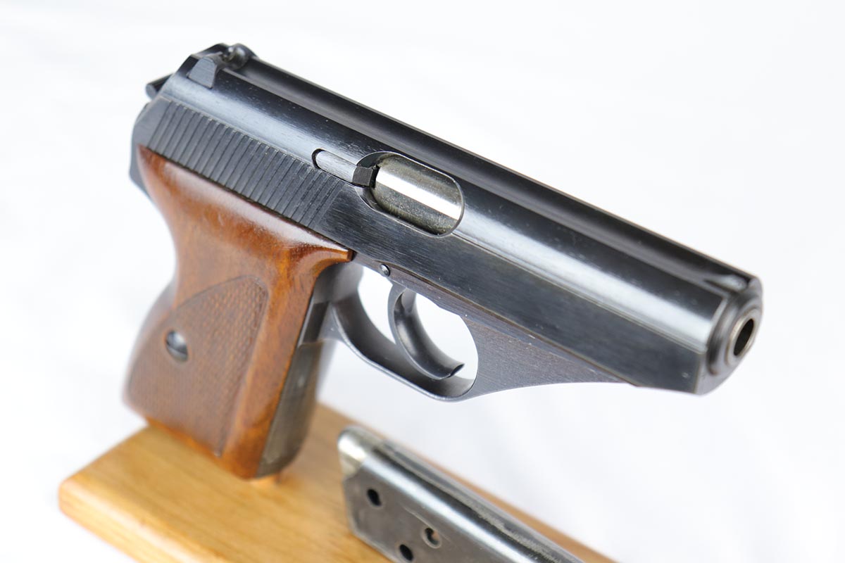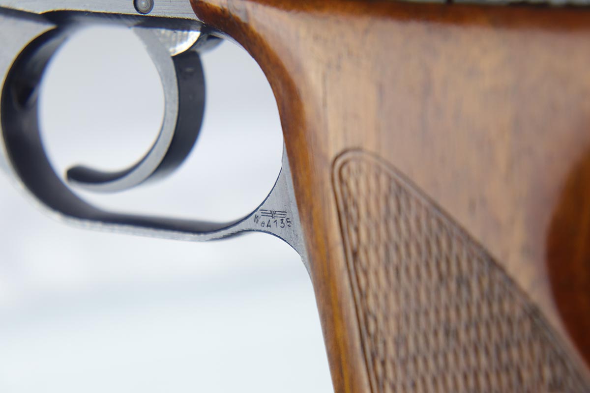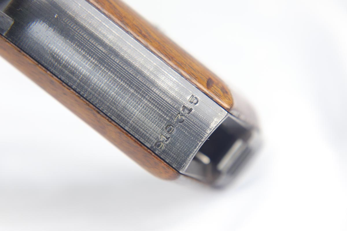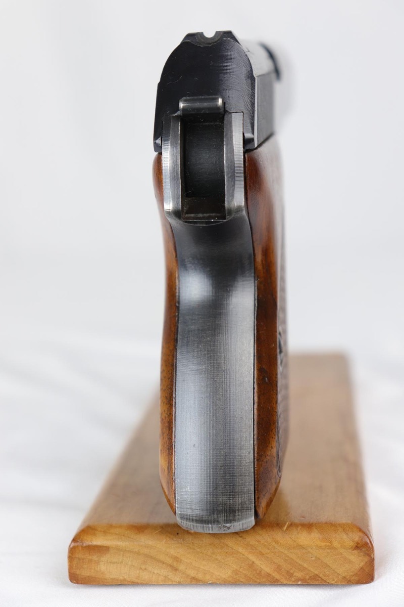 10/2/18 – This is an original and matching Nazi issued Mauser HSc from 1944. This is an interesting example in that the gun is mint aside from a patterned thinning of the straps, suggesting it may have left the factory as such. The slide is mint and so is the bore. Excellent grips, half-moon magazine.