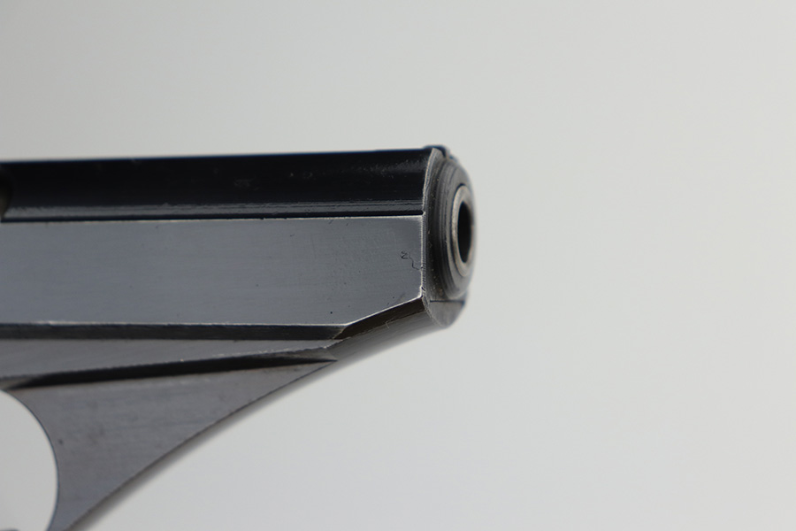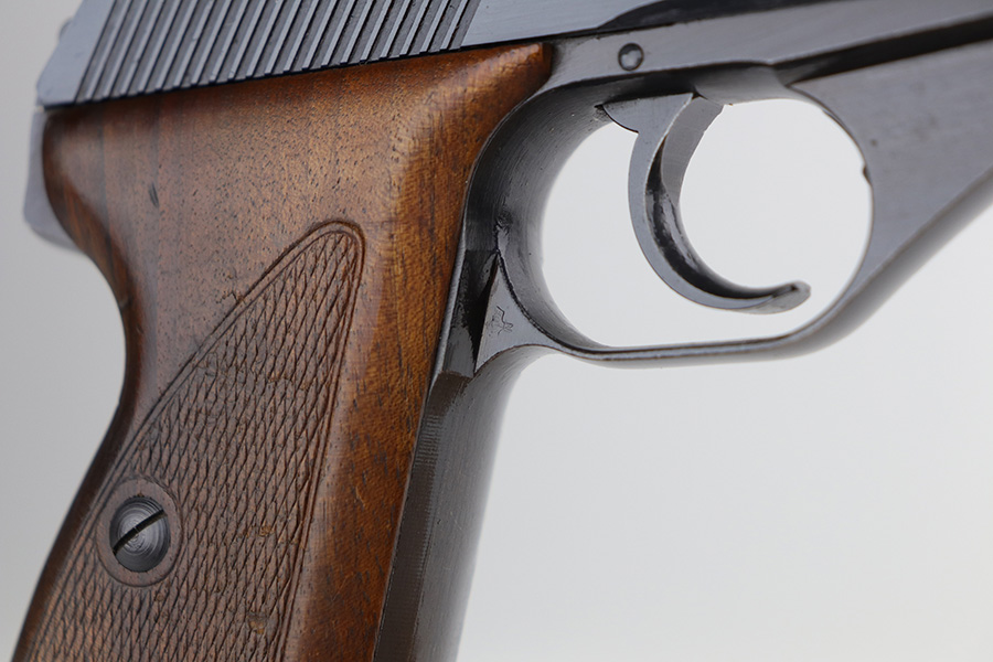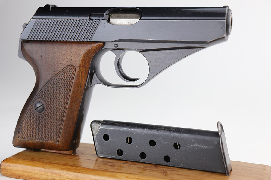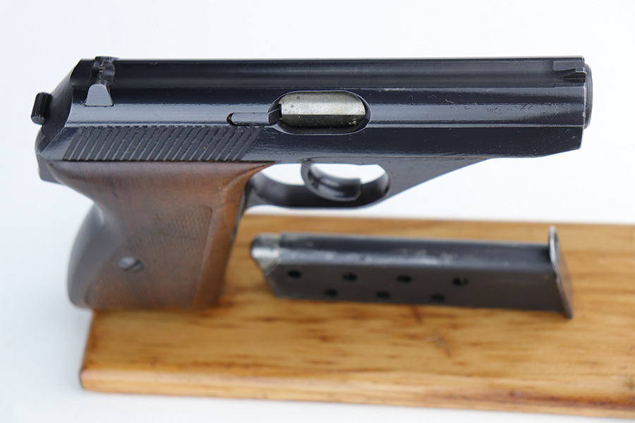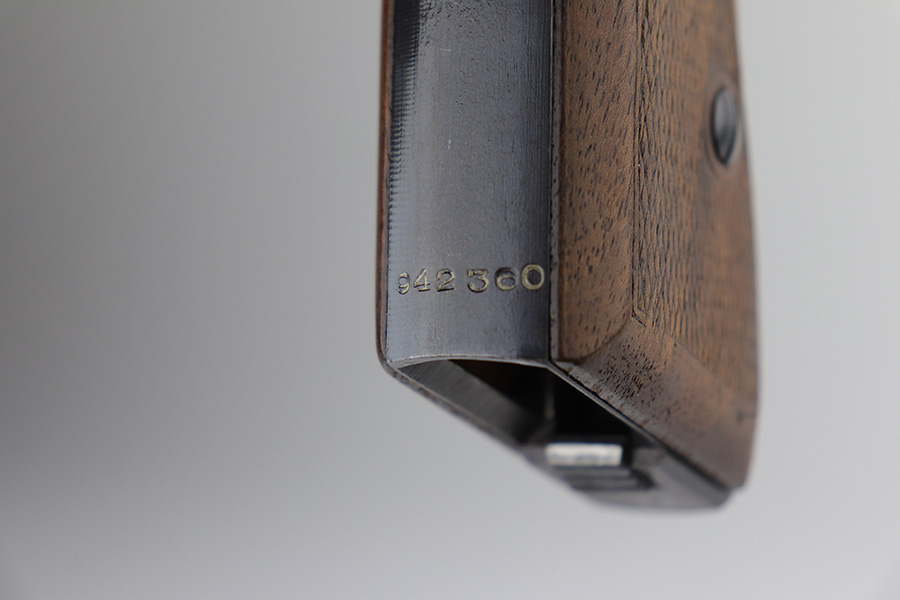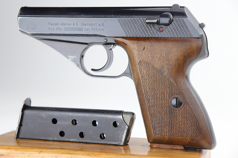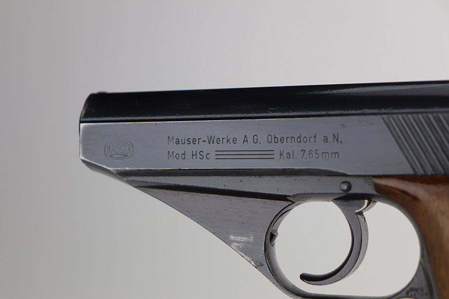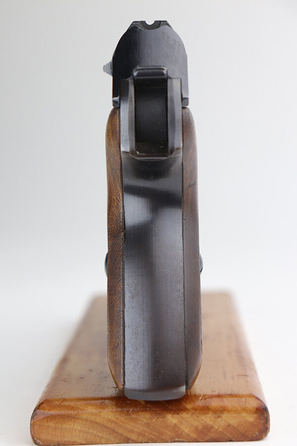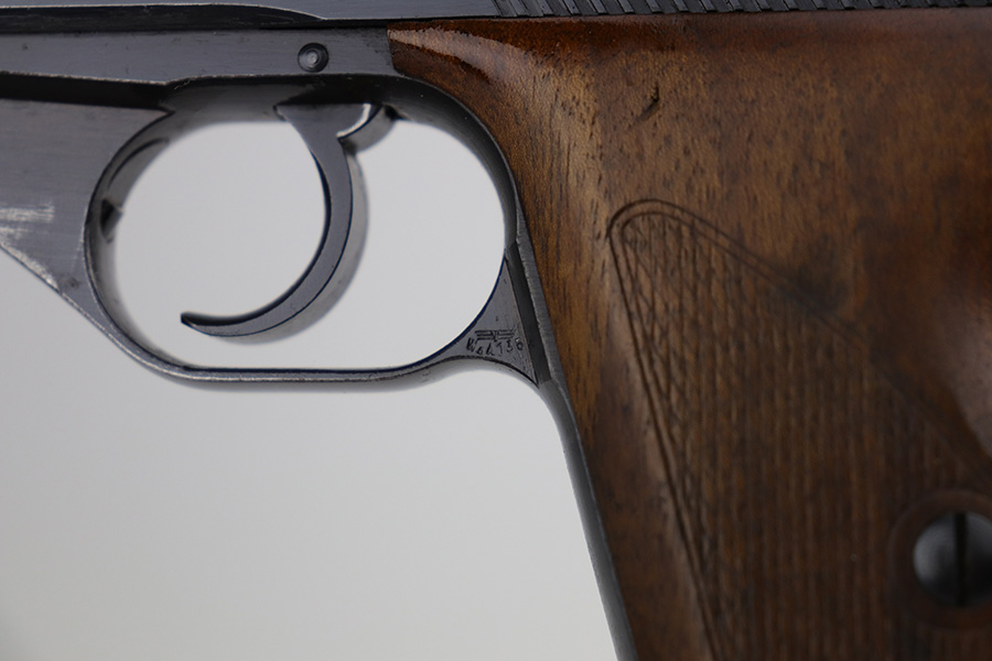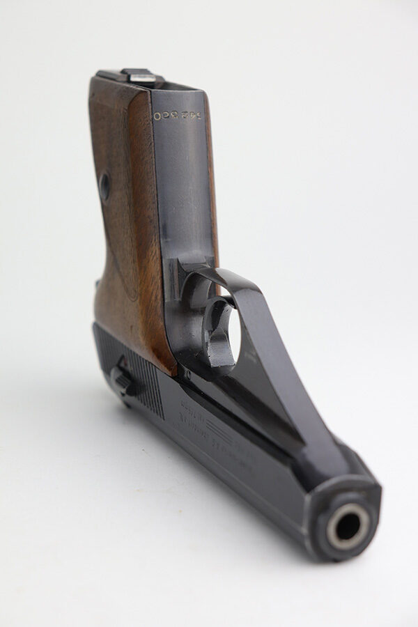 11/24/21 – This is a minty example of a Mauser HSC issued to the Nazi military in 1944. It is all matching and has the proper “Waffen 135” military proof on the left side of the trigger guard. Comes with excellent wood grips and a proper magazine. It has retained about 97% of its original finish. Very minor wear around the muzzle, a few tiny spots of wear on the stop of the slide, and one small spot of wear on the left side of the frame. Minor patina on the straps. Mint bore.