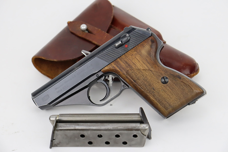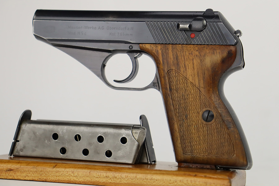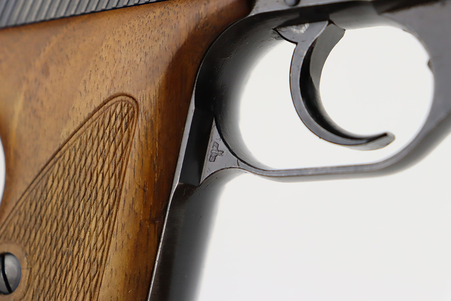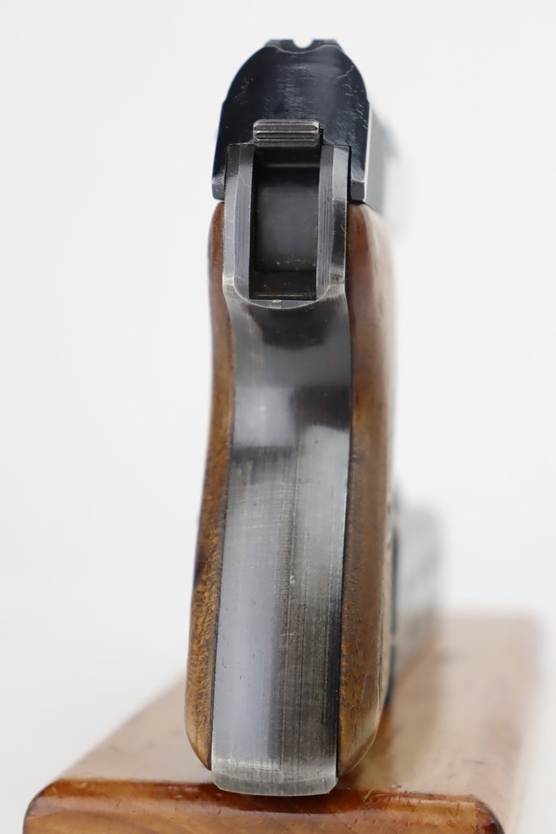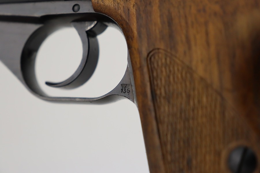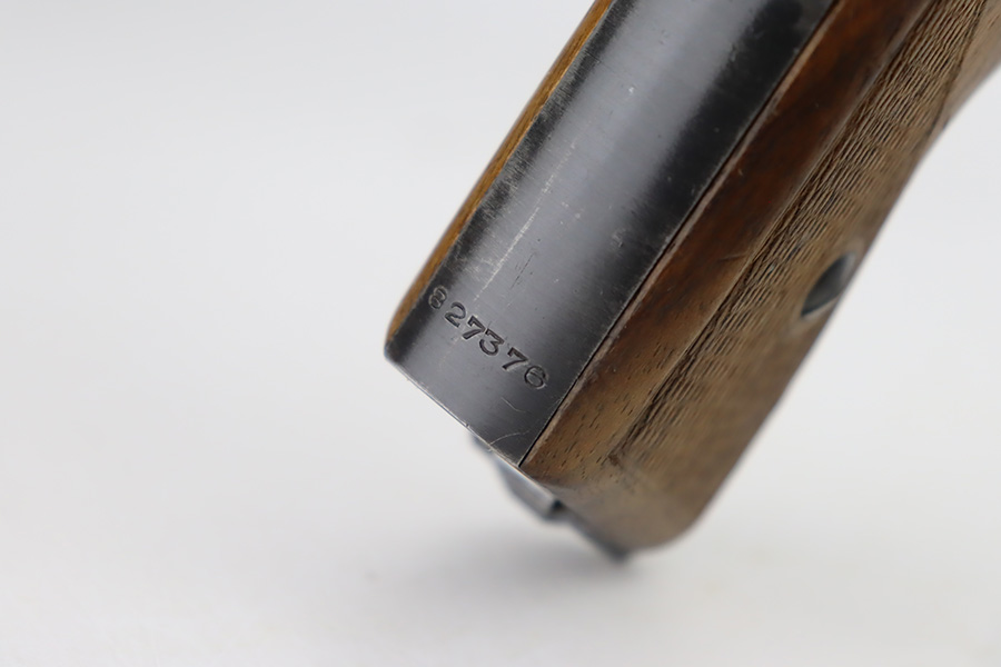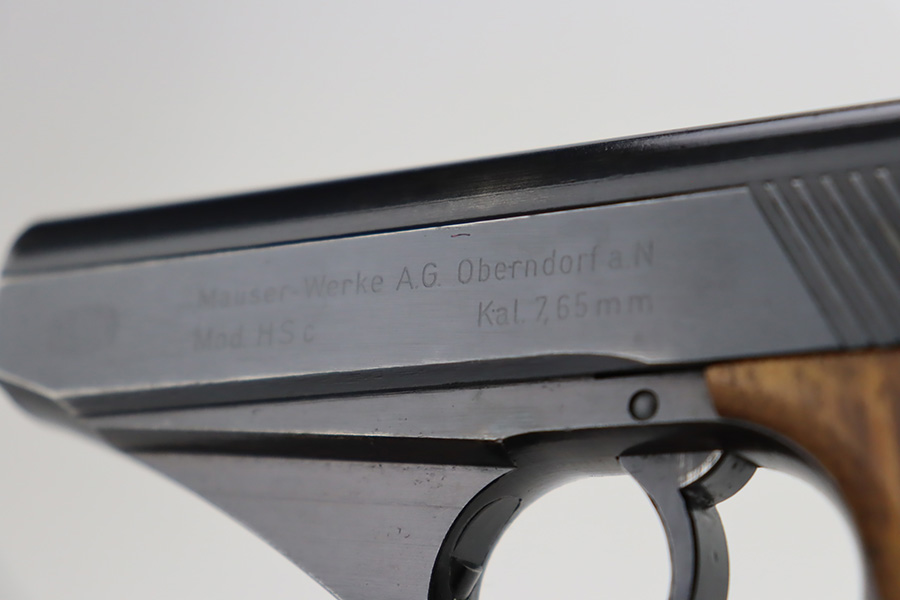 9/25/23 – This is a very nice example of a Mauser HSC issued to the Nazi military in 1943. It is all matching and has the proper “Eagle 135” military acceptance proof on the trigger guard. It comes as a rig with a nice period-correct un-marked leather holster and two proper magazines. The gun itself has retained somewhere between 85-90% of its original finish. There is wear on both grip straps, a couple of scratches on the front strap, and minor wear around the muzzle and high edges of the slide. Fitted with excellent period-correct wood grips. Excellent bore with great rifling.