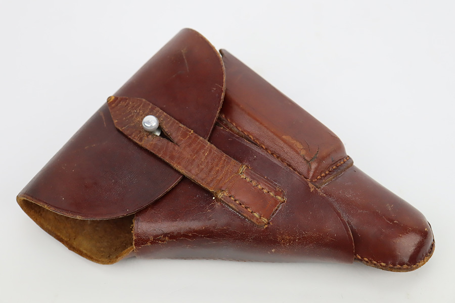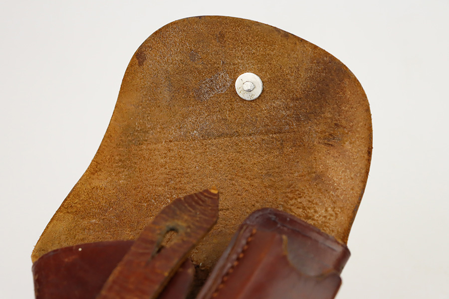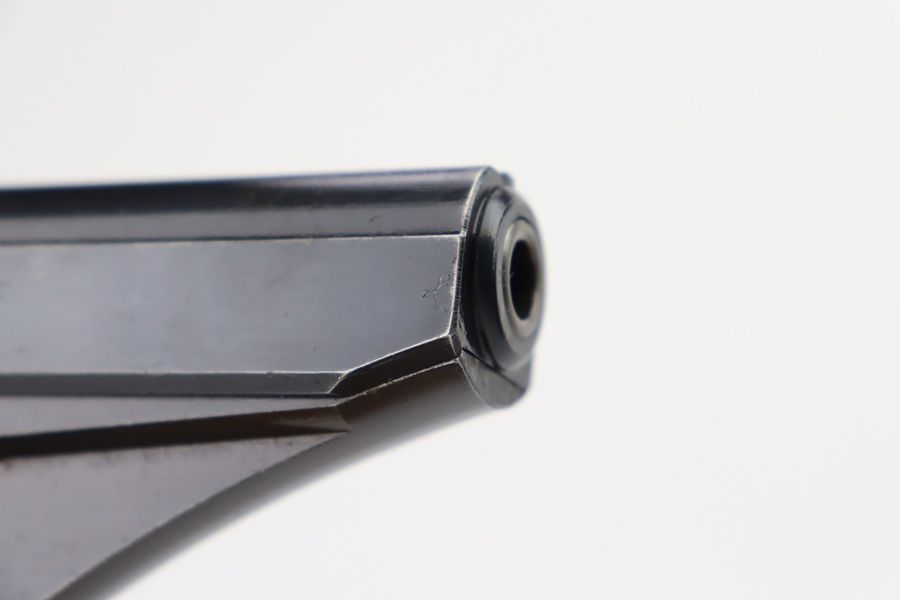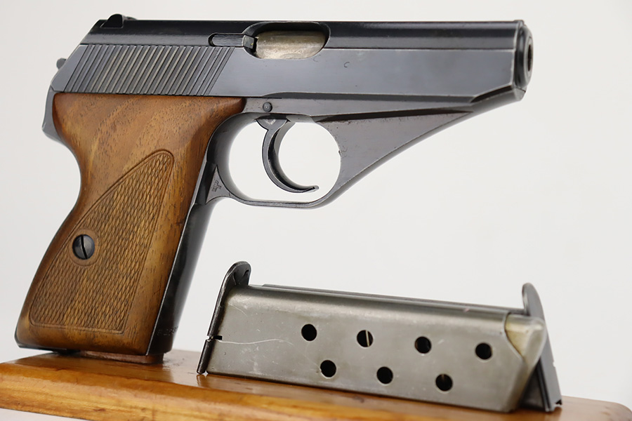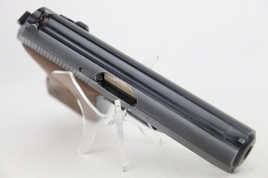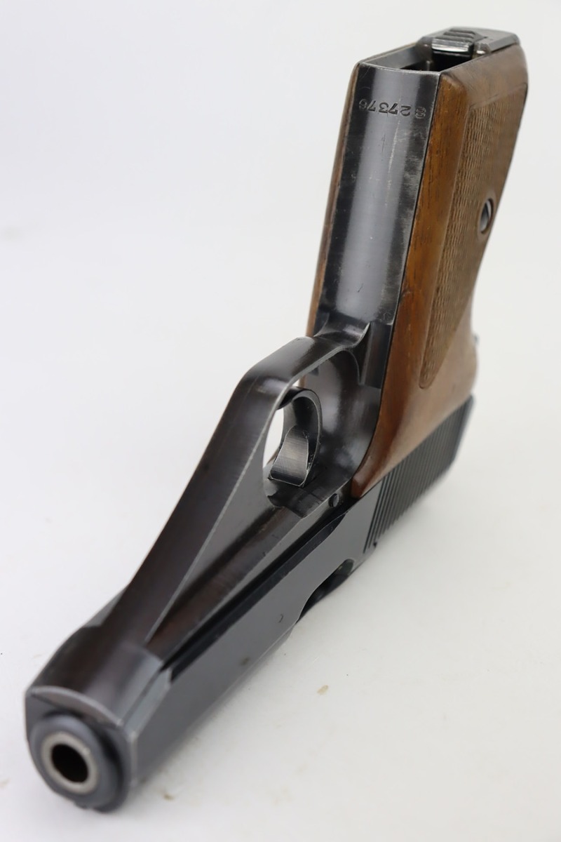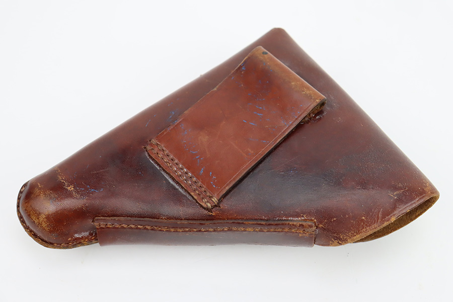 9/25/23 – This is a very nice example of a Mauser HSC issued to the Nazi military in 1943. It is all matching and has the proper “Eagle 135” military acceptance proof on the trigger guard. It comes as a rig with a nice period-correct un-marked leather holster and two proper magazines. The gun itself has retained somewhere between 85-90% of its original finish. There is wear on both grip straps, a couple of scratches on the front strap, and minor wear around the muzzle and high edges of the slide. Fitted with excellent period-correct wood grips. Excellent bore with great rifling.