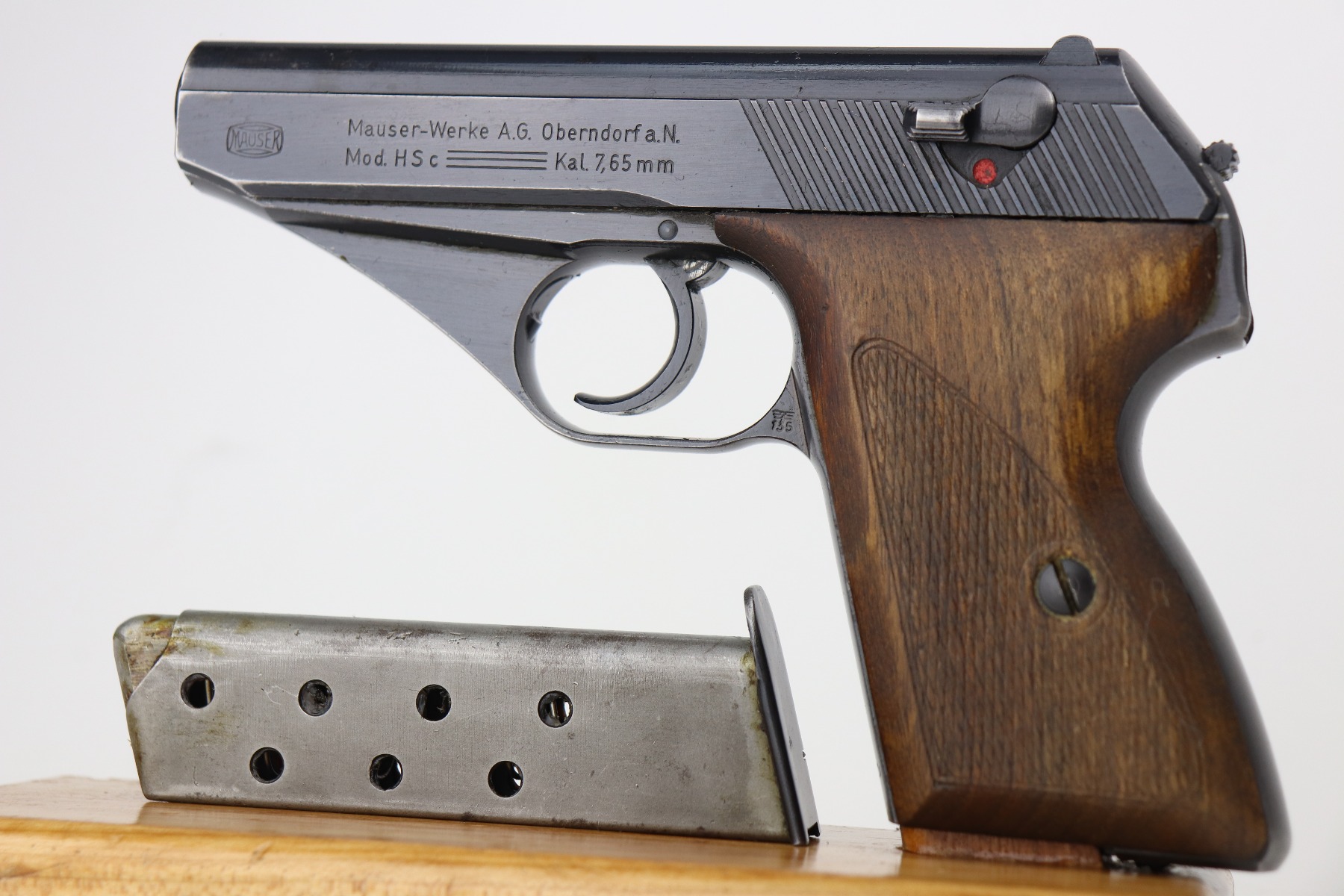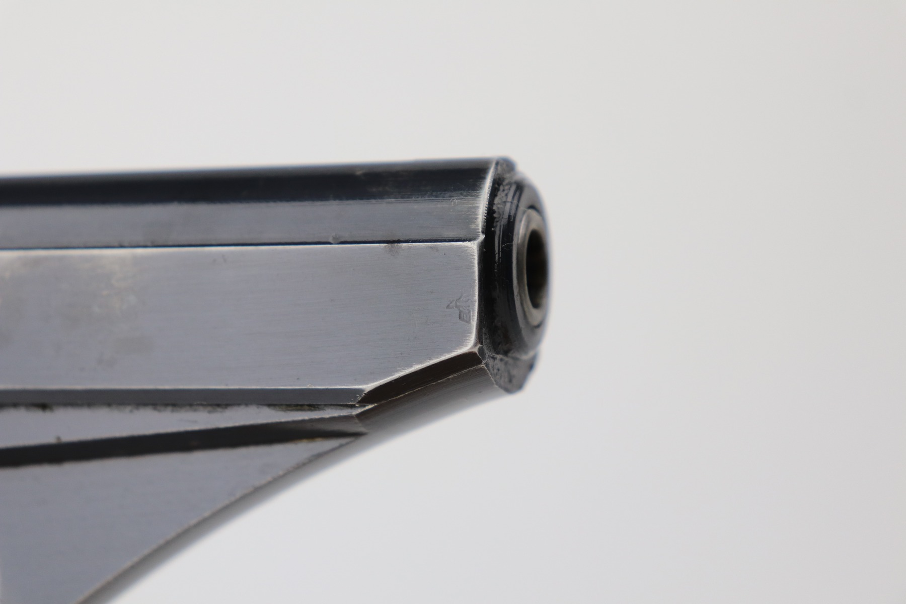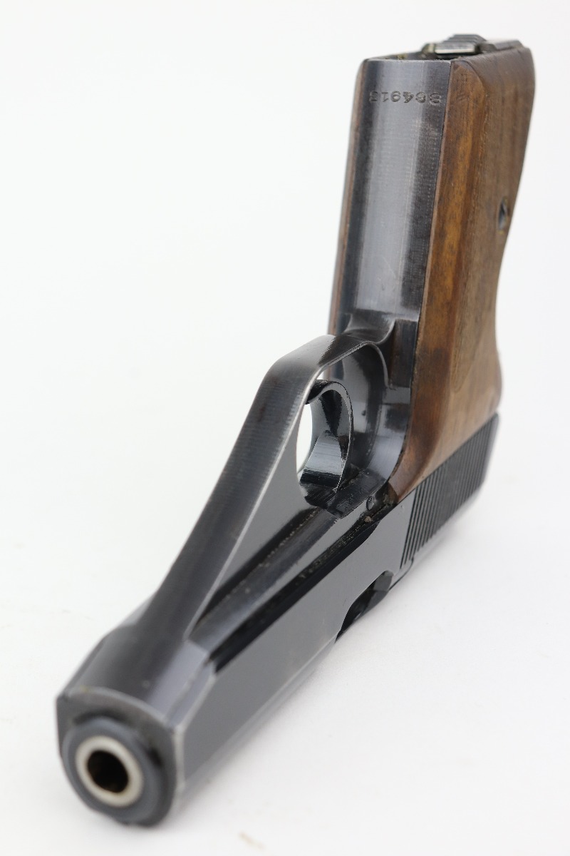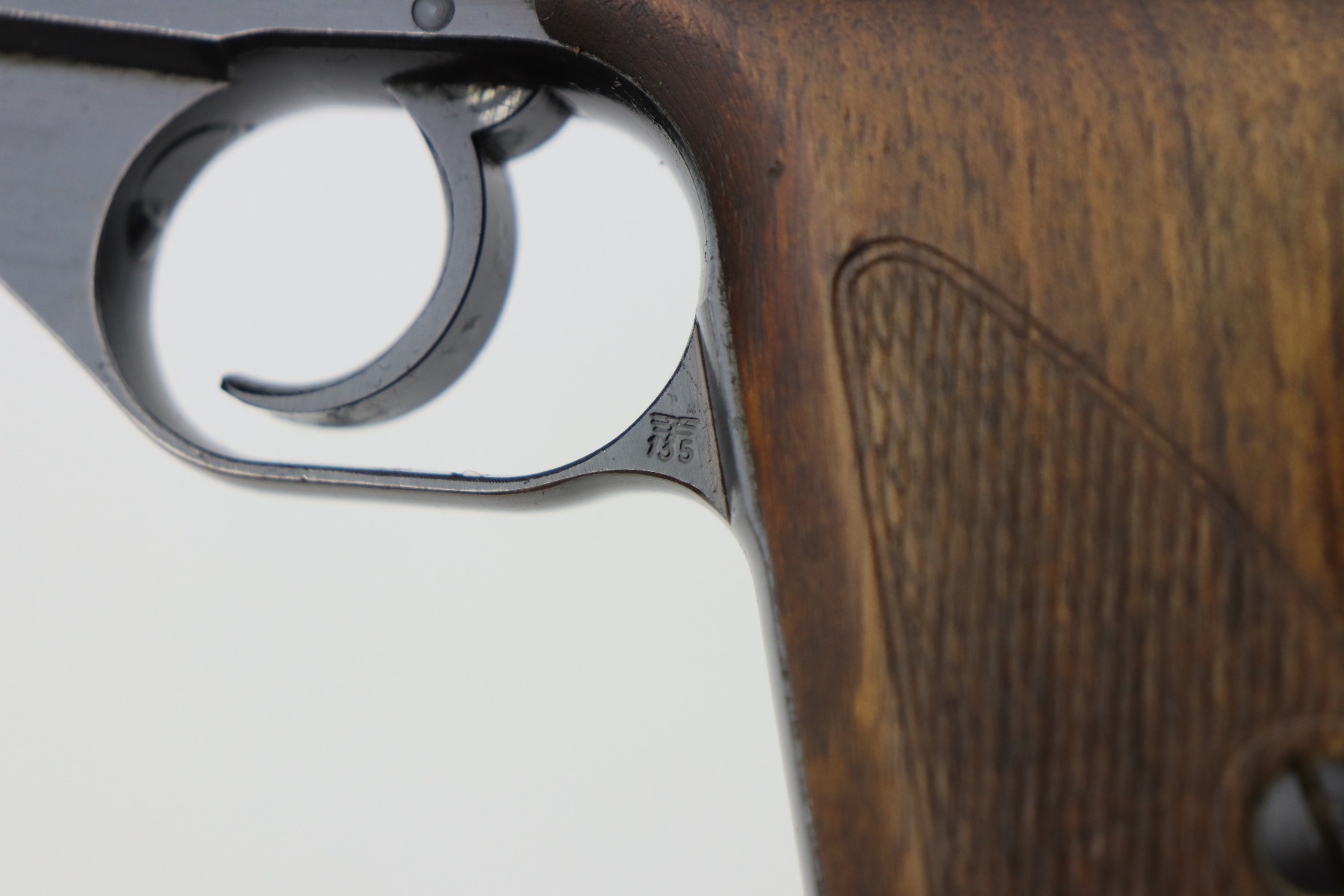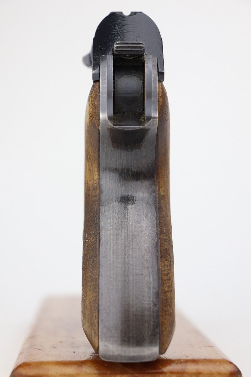 3/31/21 – This is a very nice example of a Mauser HSC rig issued to the Nazi military in 1943. The gun is all matching and has the proper “Eagle 135” military proof. The gun comes with a nice black leather holster and a period-correct magazine. The gun has retained about 93% of its original finish. The profile views are excellent as most of the wear is on the straps. There are also areas of minor wear around the muzzle, high edges of the slide, and a couple of areas on the right side of the slide. Comes with excellent wood grips. The bore is excellent – shiny with strong rifling.