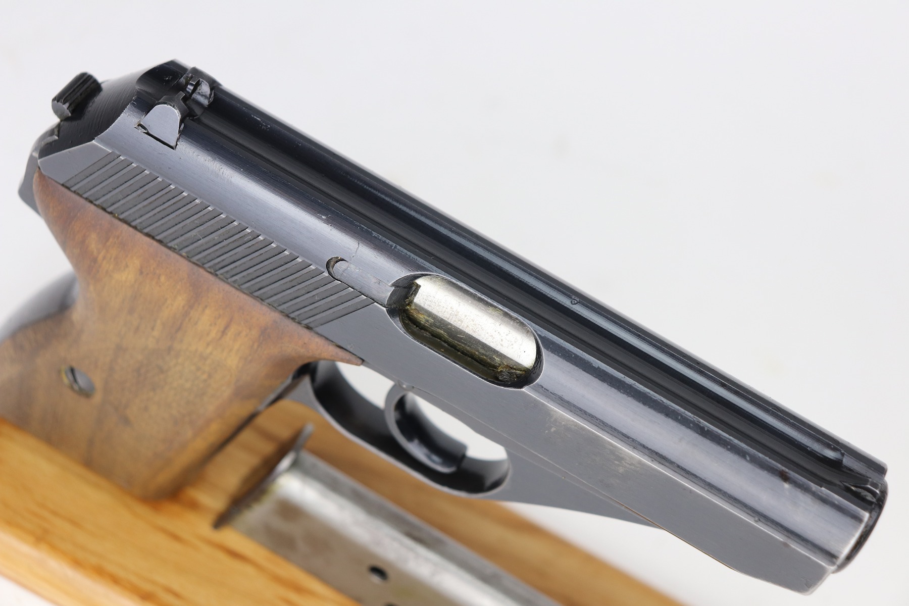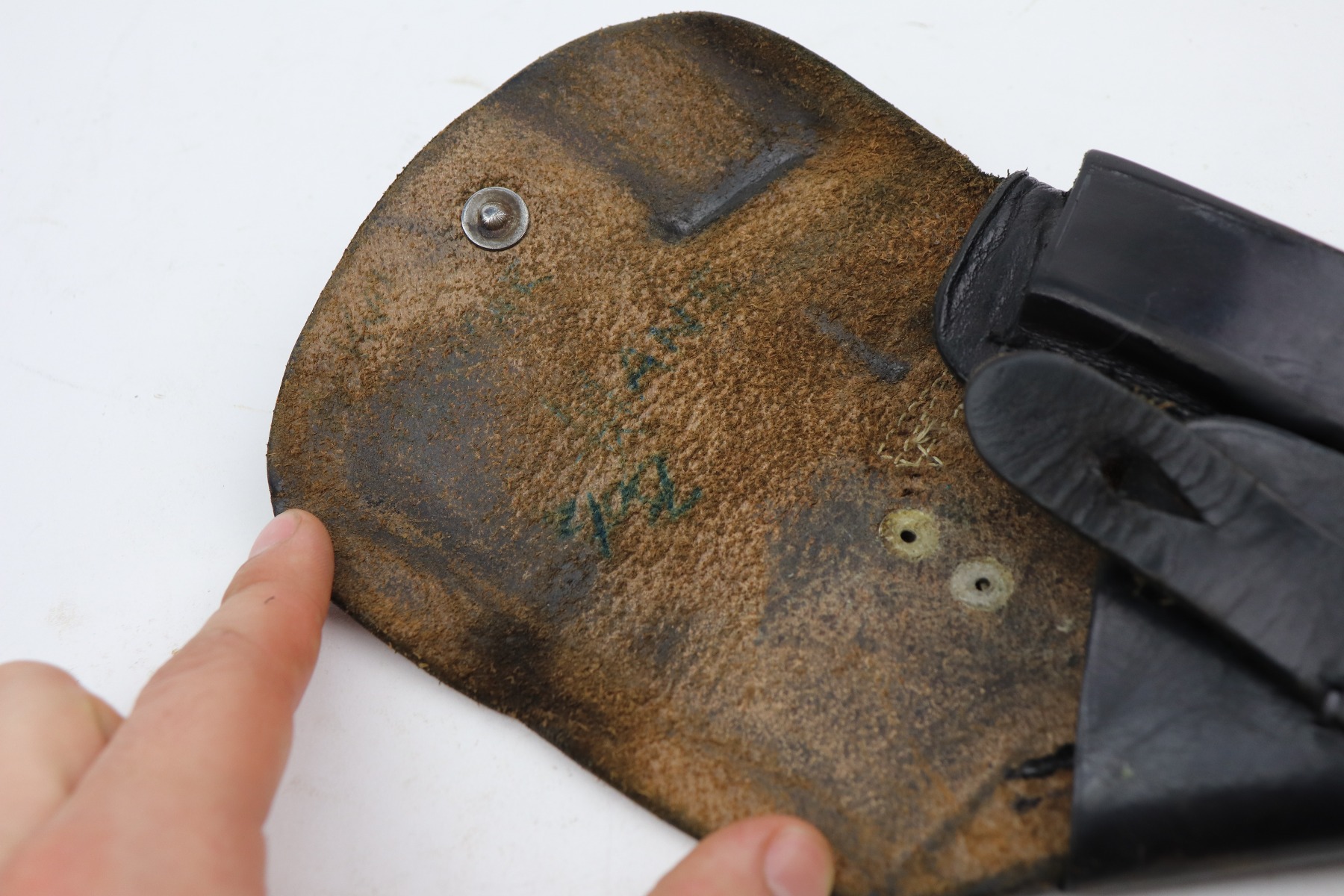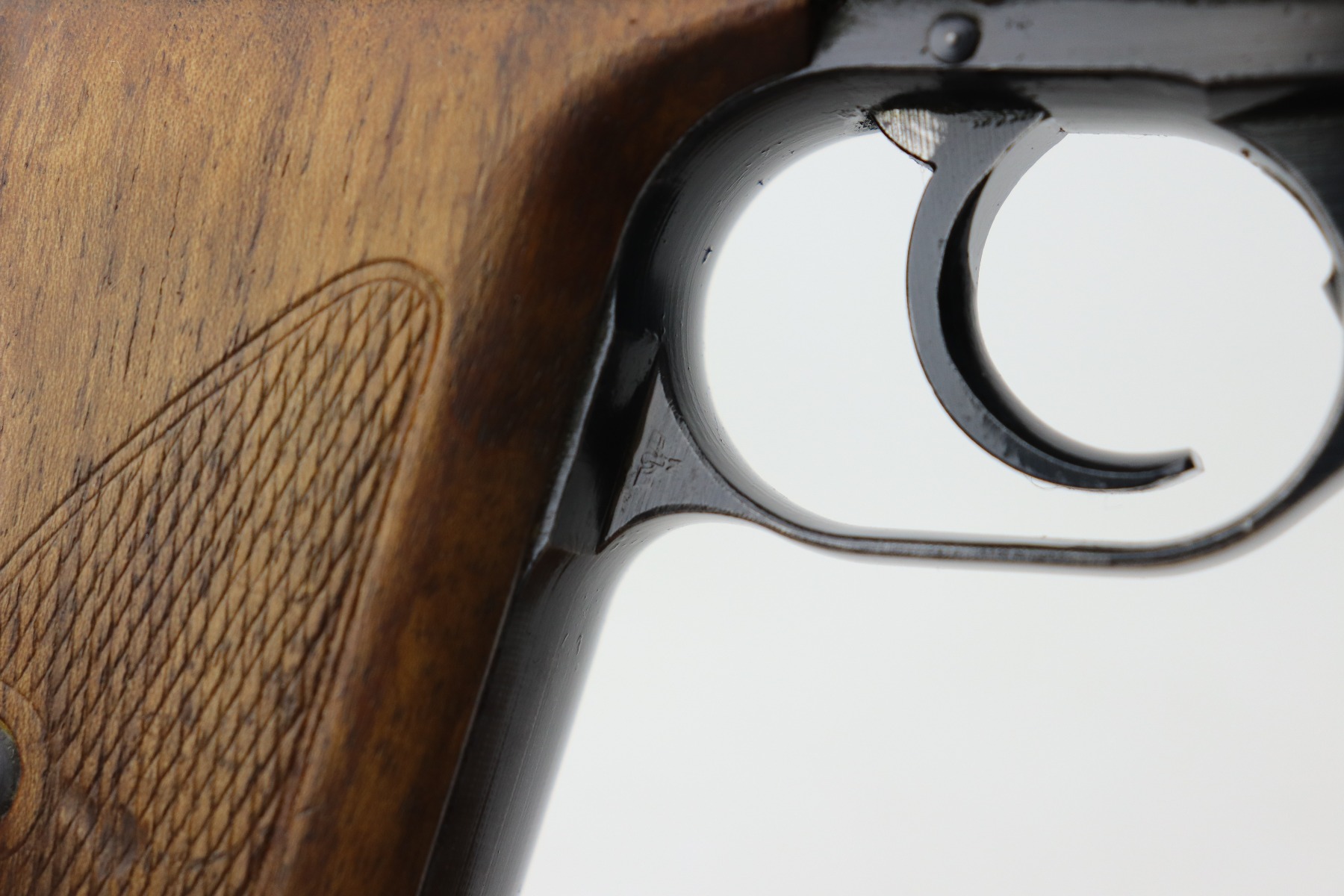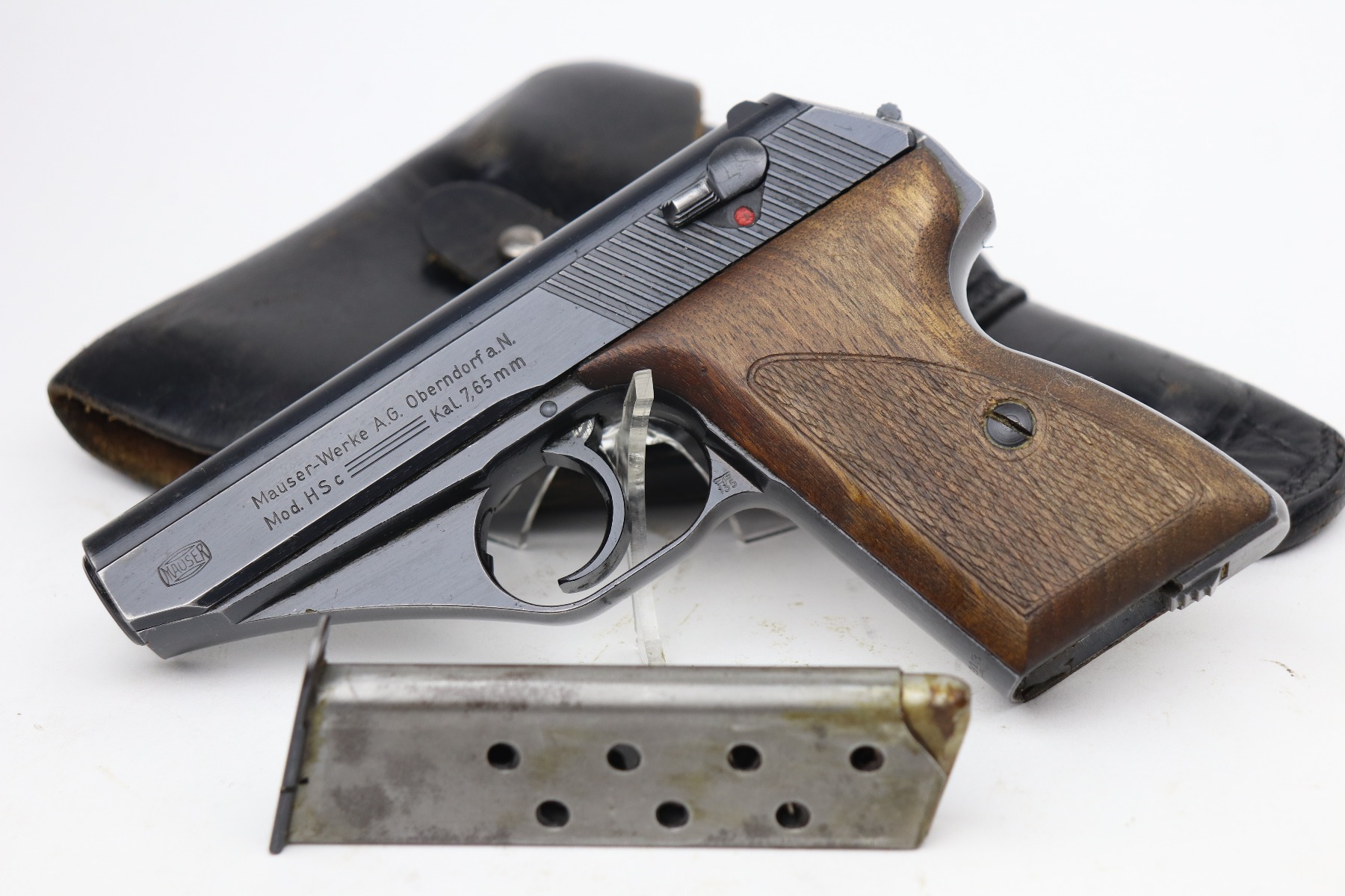 3/31/21 – This is a very nice example of a Mauser HSC rig issued to the Nazi military in 1943. The gun is all matching and has the proper “Eagle 135” military proof. The gun comes with a nice black leather holster and a period-correct magazine. The gun has retained about 93% of its original finish. The profile views are excellent as most of the wear is on the straps. There are also areas of minor wear around the muzzle, high edges of the slide, and a couple of areas on the right side of the slide. Comes with excellent wood grips. The bore is excellent – shiny with strong rifling.