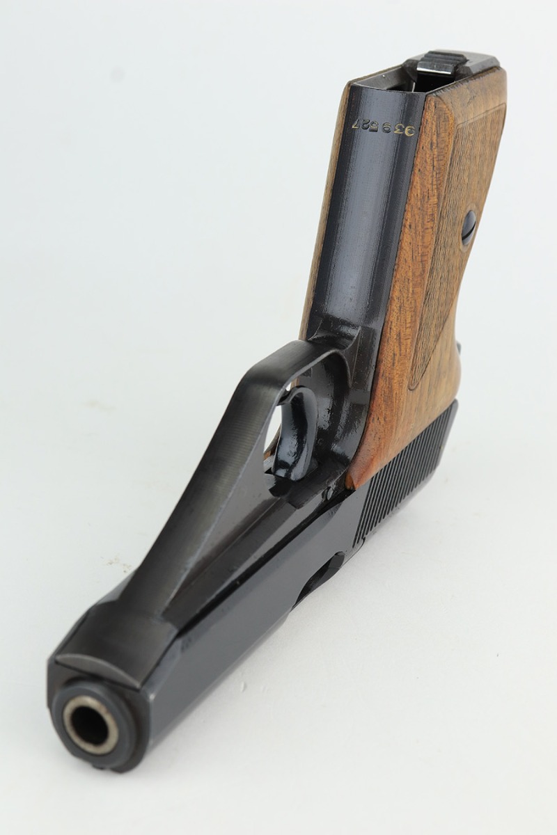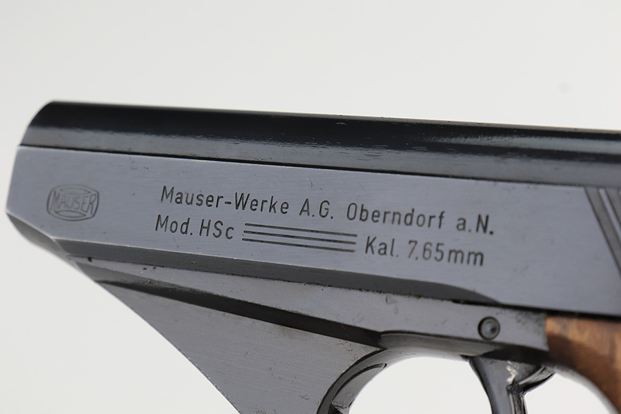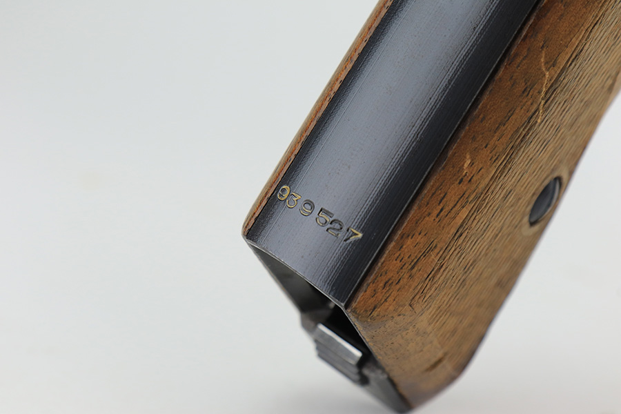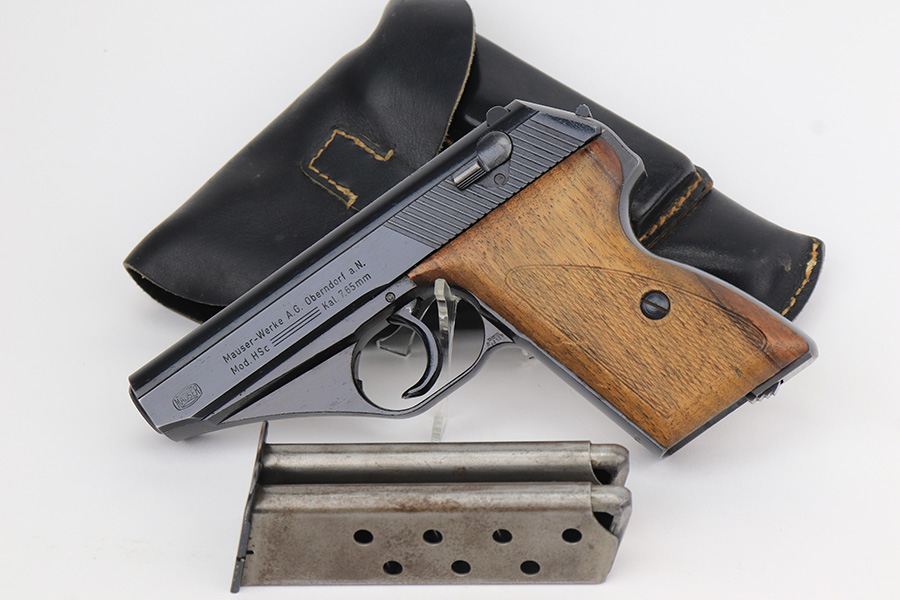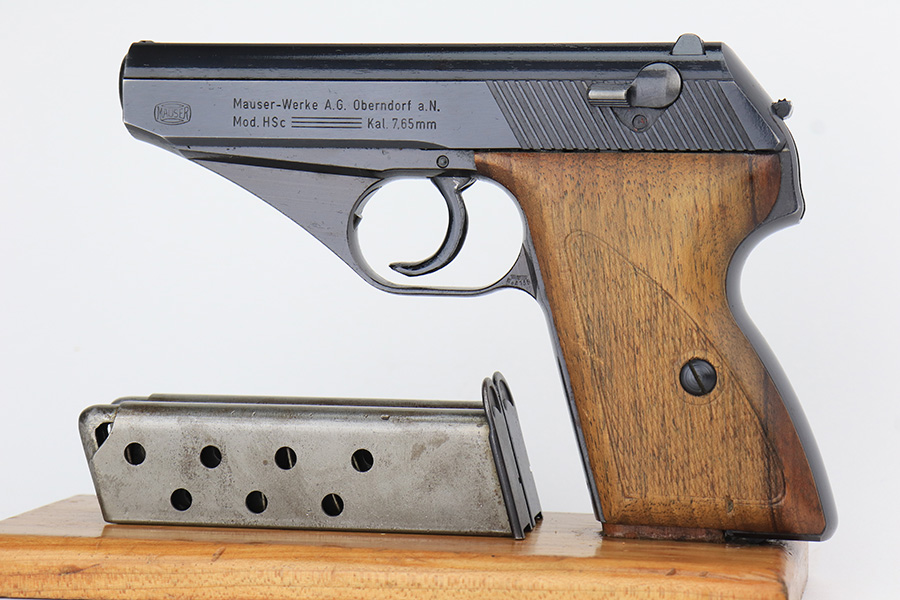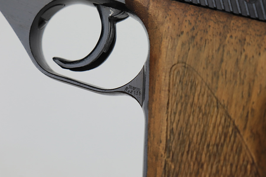 1/30/23 – This is a beautiful example of a Mauser HSC issued to the Nazi military in 1944. It is all matching and has the proper “Waffen 135” military acceptance proof on the left side of the trigger guard. It comes as a rig with two period-correct half moon magazines and a nice black leather holster that is very faintly maker marked and dated 1944 on the back. The gun itself is near-mint, retaining virtually all of its original finish with a hint of freckling on the back strap. Fitted with excellent period-correct wood grips. The bore is excellent with great rifling.