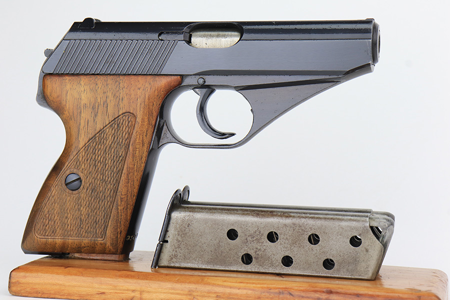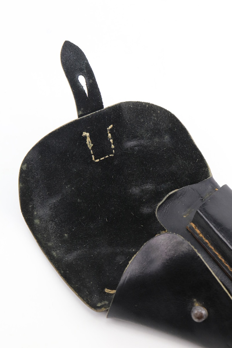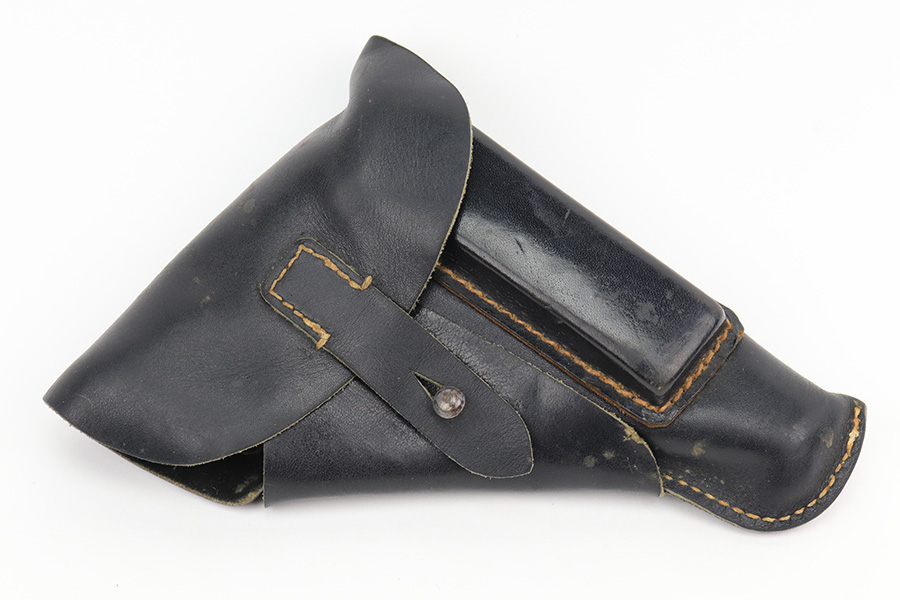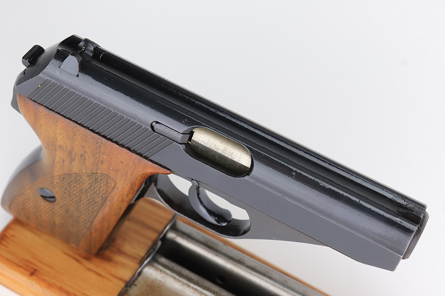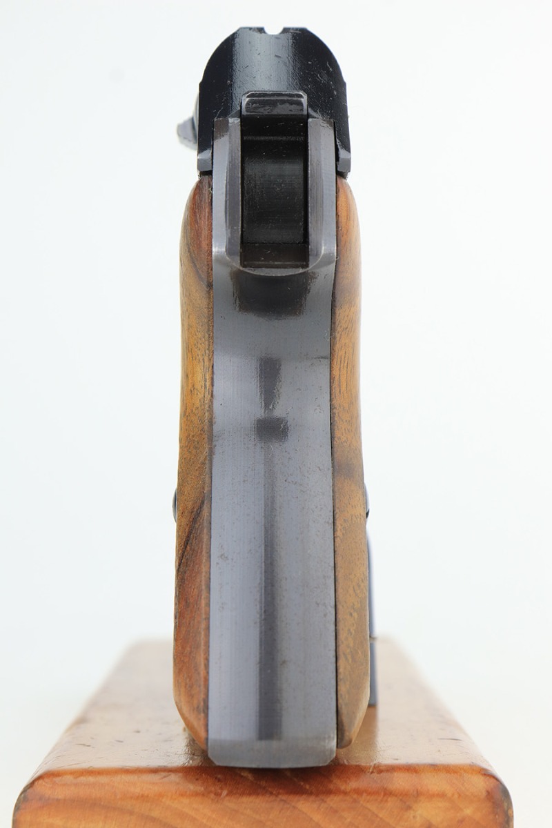 1/30/23 – This is a beautiful example of a Mauser HSC issued to the Nazi military in 1944. It is all matching and has the proper “Waffen 135” military acceptance proof on the left side of the trigger guard. It comes as a rig with two period-correct half moon magazines and a nice black leather holster that is very faintly maker marked and dated 1944 on the back. The gun itself is near-mint, retaining virtually all of its original finish with a hint of freckling on the back strap. Fitted with excellent period-correct wood grips. The bore is excellent with great rifling.