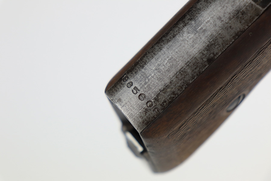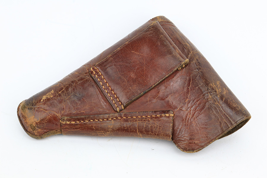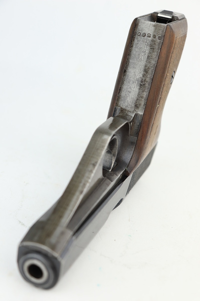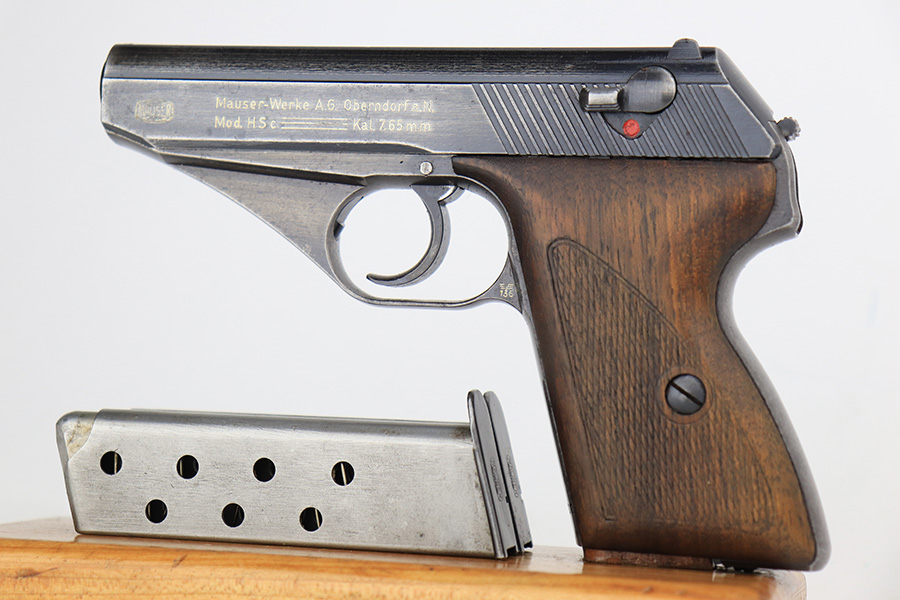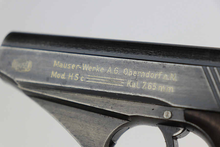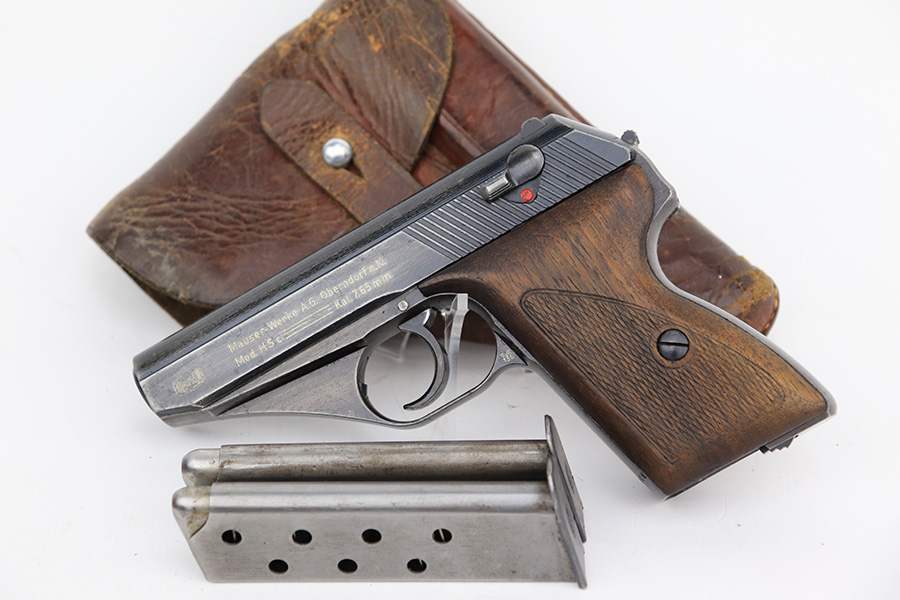 4/13/23 – This is a nice Mauser HSC issued to the Nazi military in 1942. It is all matching and has the proper “Eagle 135” military acceptance proof on the left side of the trigger guard. It comes as a rig with two correct Mauser banner magazines and a fairly worn leather holster. The gun itself has retained roughly 40-50% of its original finish with obvious finish loss and spotty oxidation throughout. Fitted with excellent period-correct wood grips. Excellent bore with strong rifling.
