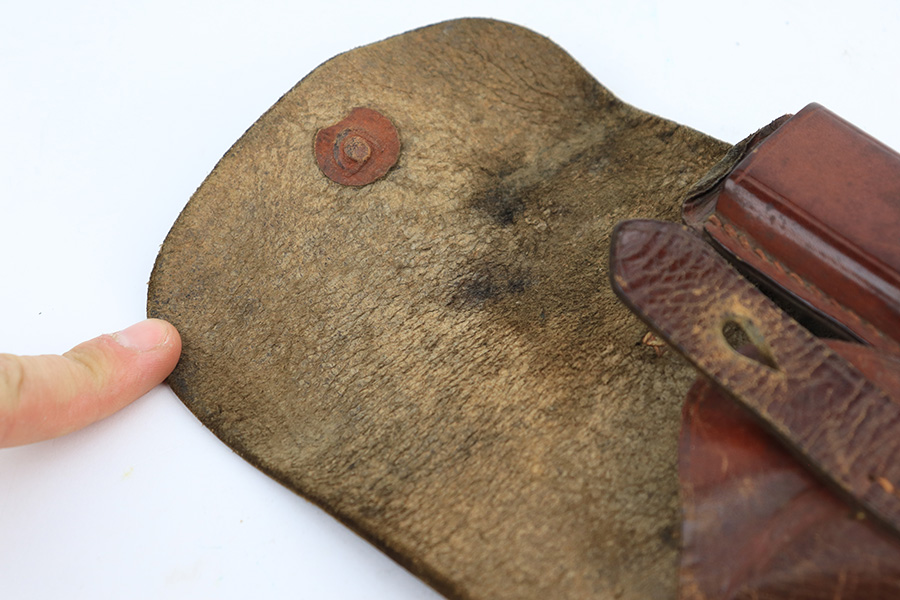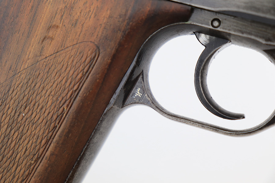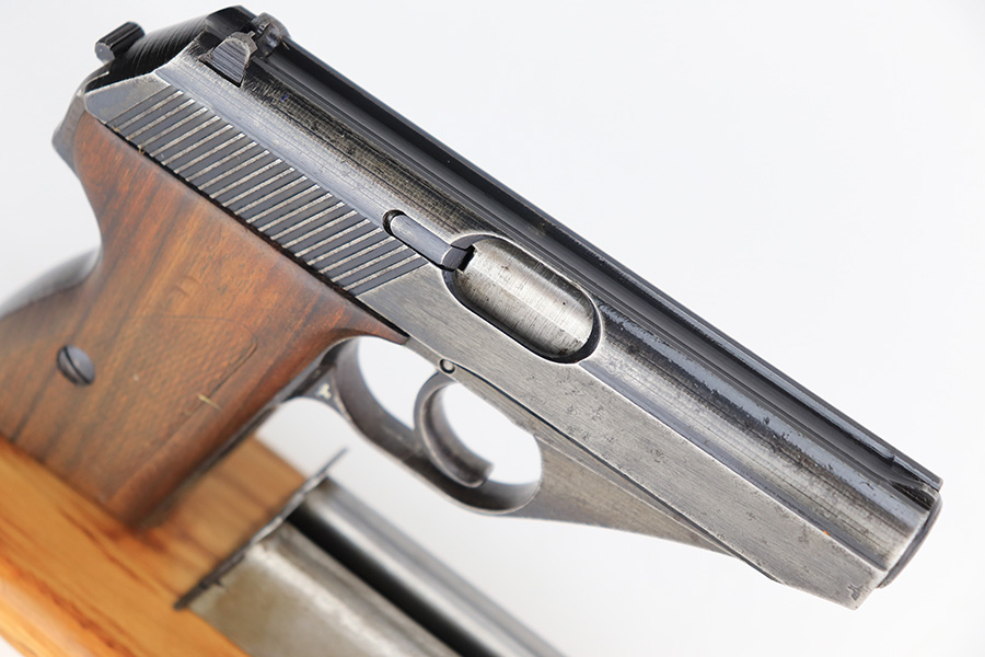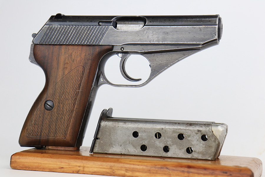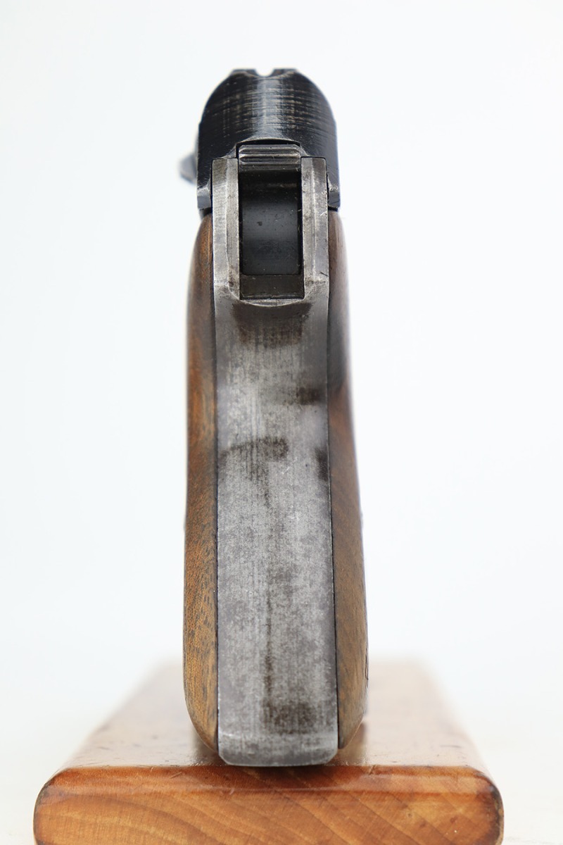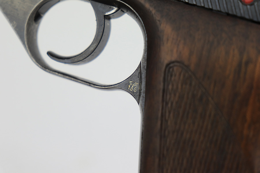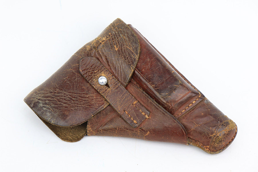 4/13/23 – This is a nice Mauser HSC issued to the Nazi military in 1942. It is all matching and has the proper “Eagle 135” military acceptance proof on the left side of the trigger guard. It comes as a rig with two correct Mauser banner magazines and a fairly worn leather holster. The gun itself has retained roughly 40-50% of its original finish with obvious finish loss and spotty oxidation throughout. Fitted with excellent period-correct wood grips. Excellent bore with strong rifling.