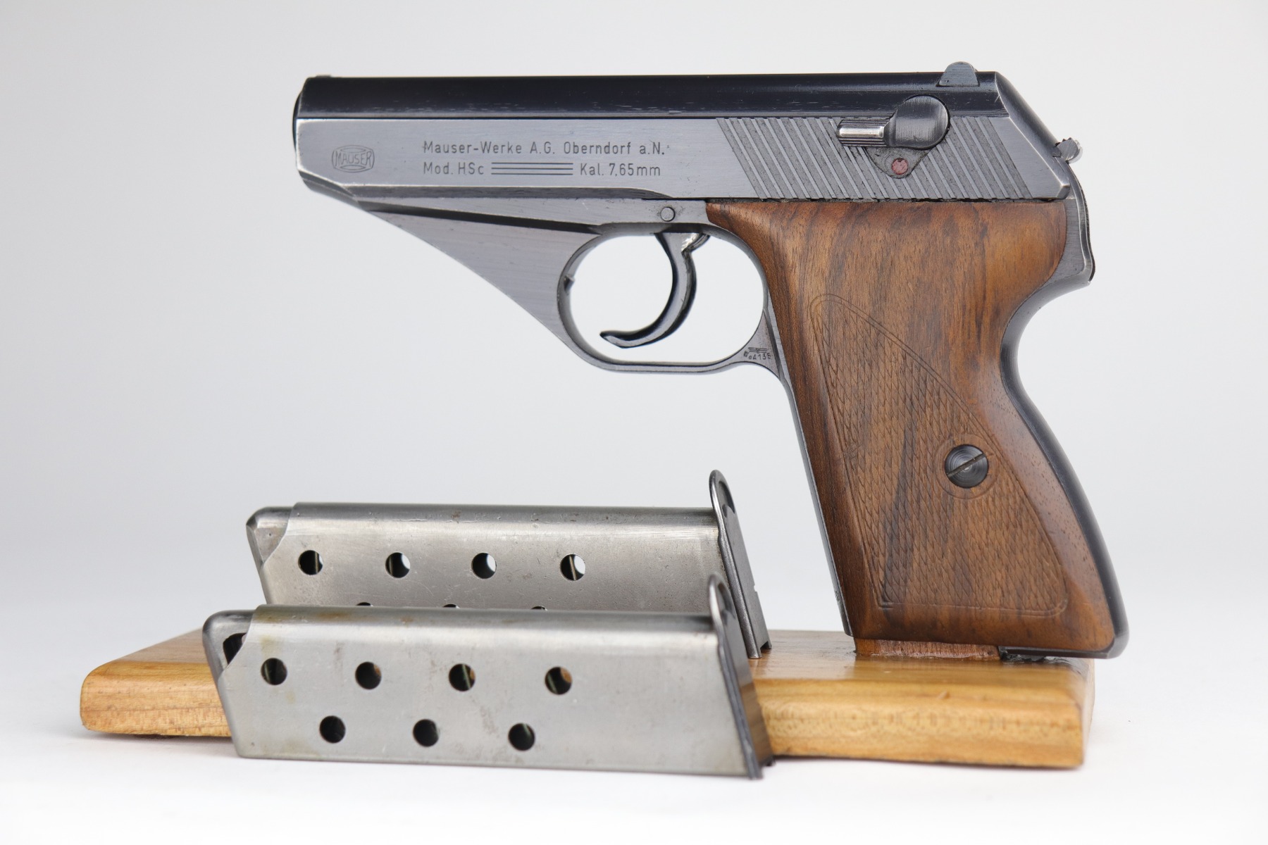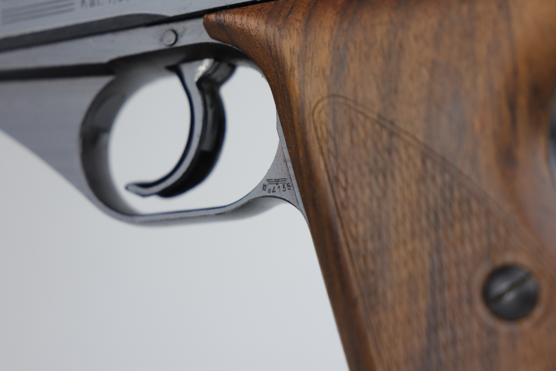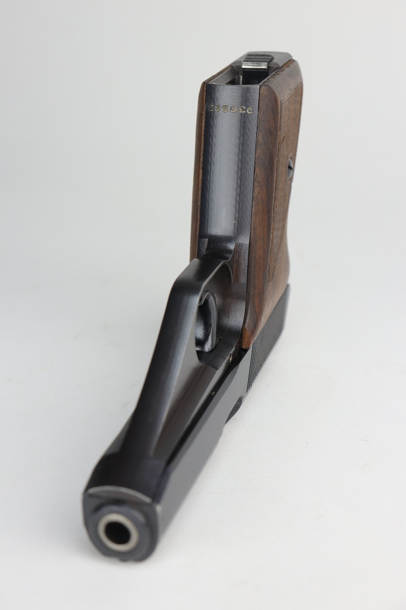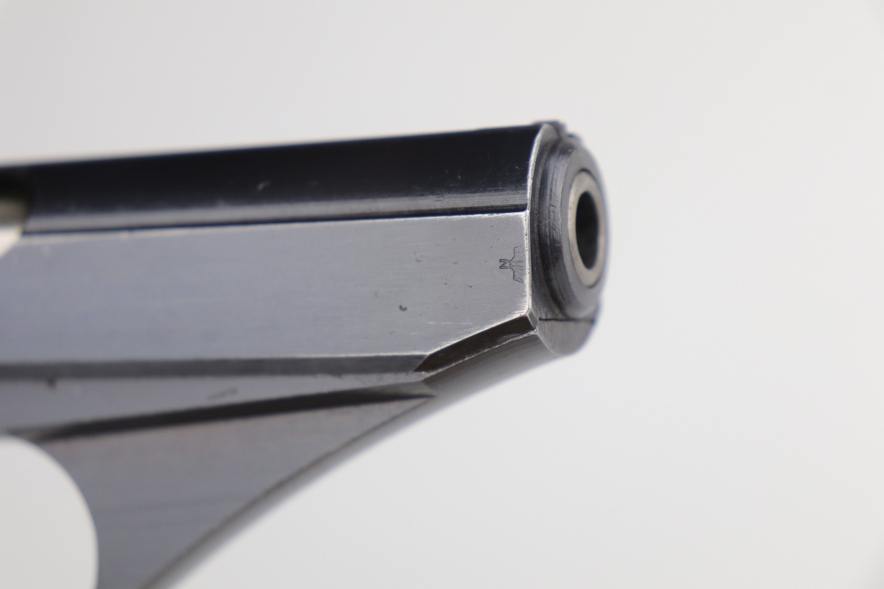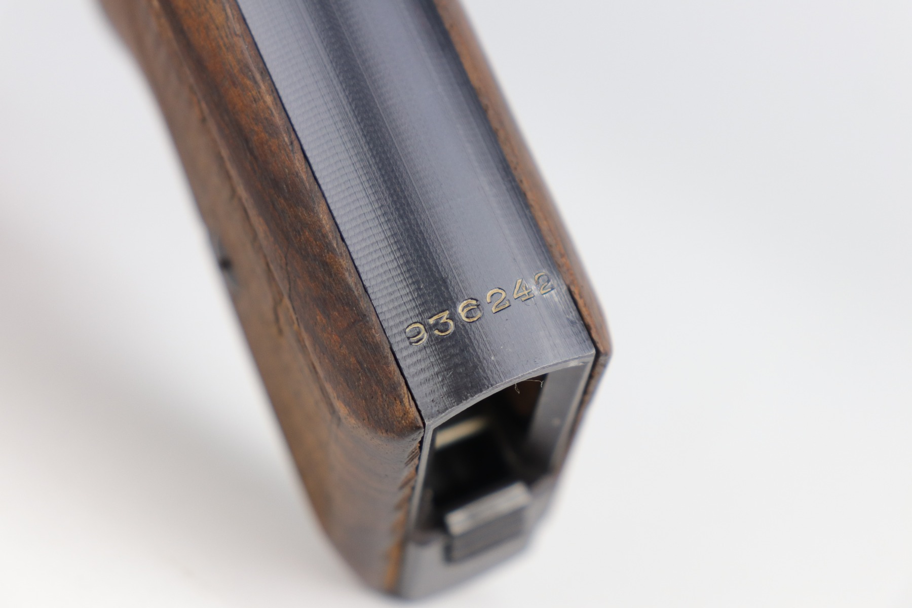 9/10/20 – This is an original Mauser HSC rig issued to the Nazi military in 1944. This rig comes with a black leather holster, two original magazines, and the original capture document. It has the proper “Waffen 135” Nazi military proof on the trigger guard. The gun is in excellent condition, retaining a little more than 98% of its original bluing. There is just very minor muzzle wear, an area of minor wear at the base of the back strap, very minor high edge wear on the tang. The bore is very shiny with strong rifling – just a few very small areas of freckling. Otherwise, it would be near-mint. The grips are excellent and original. The holster is dated 1944 and in excellent condition. The capture paperwork is original and has a matching serial to the gun.