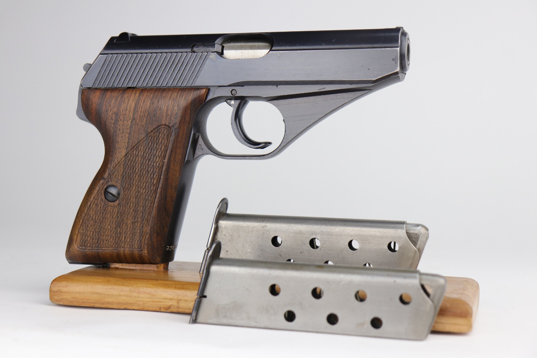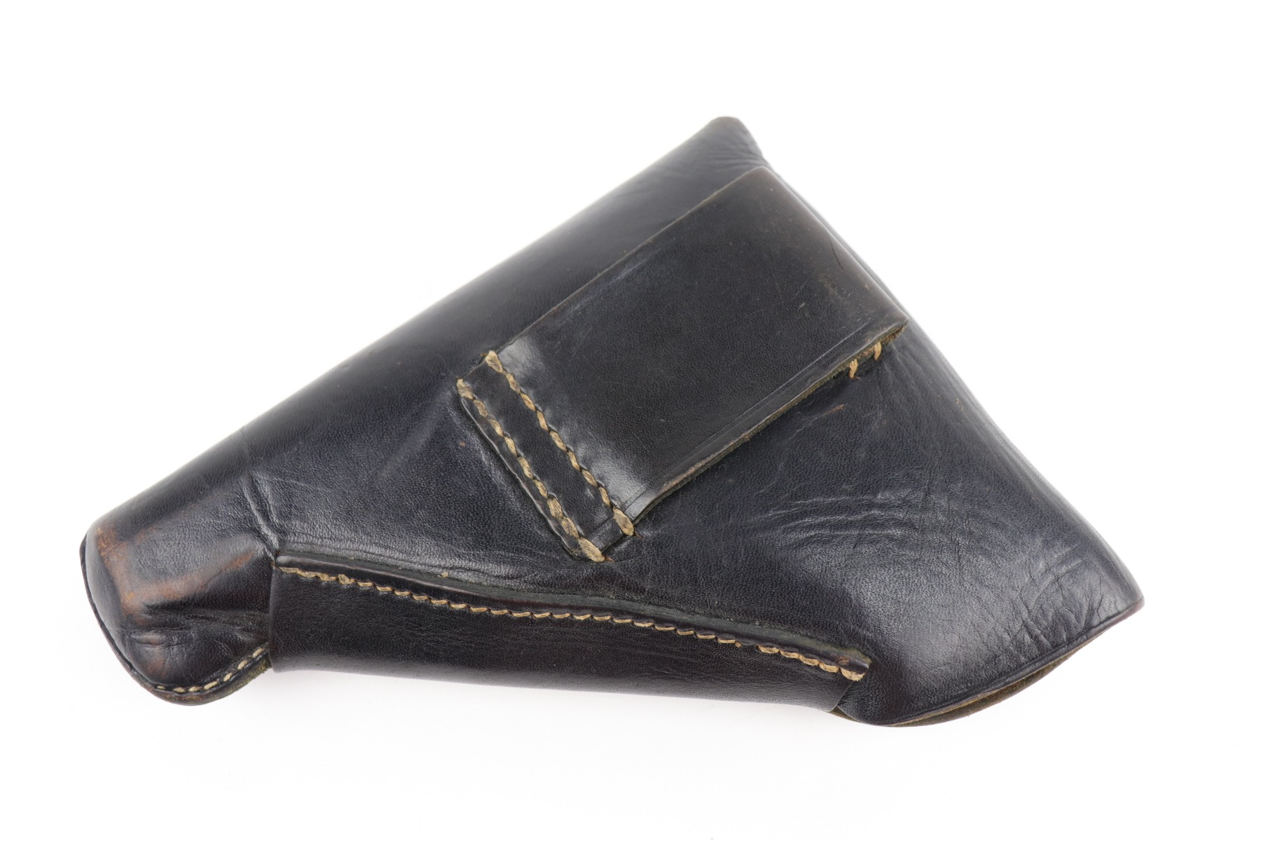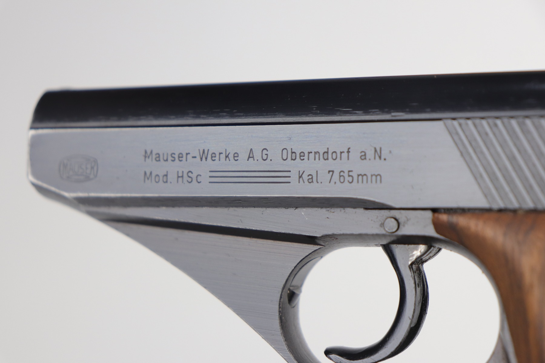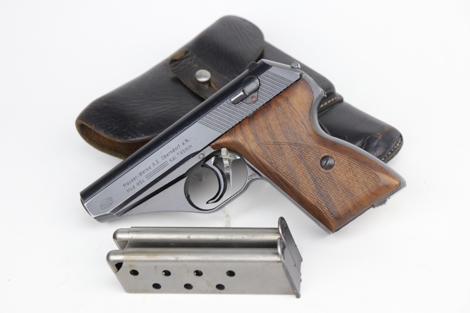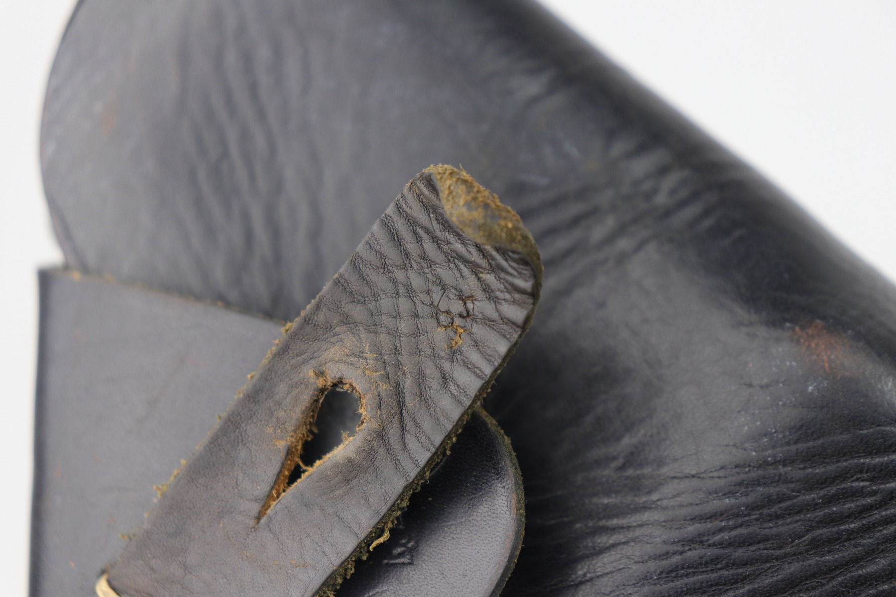 9/10/20 – This is an original Mauser HSC rig issued to the Nazi military in 1944. This rig comes with a black leather holster, two original magazines, and the original capture document. It has the proper “Waffen 135” Nazi military proof on the trigger guard. The gun is in excellent condition, retaining a little more than 98% of its original bluing. There is just very minor muzzle wear, an area of minor wear at the base of the back strap, very minor high edge wear on the tang. The bore is very shiny with strong rifling – just a few very small areas of freckling. Otherwise, it would be near-mint. The grips are excellent and original. The holster is dated 1944 and in excellent condition. The capture paperwork is original and has a matching serial to the gun.