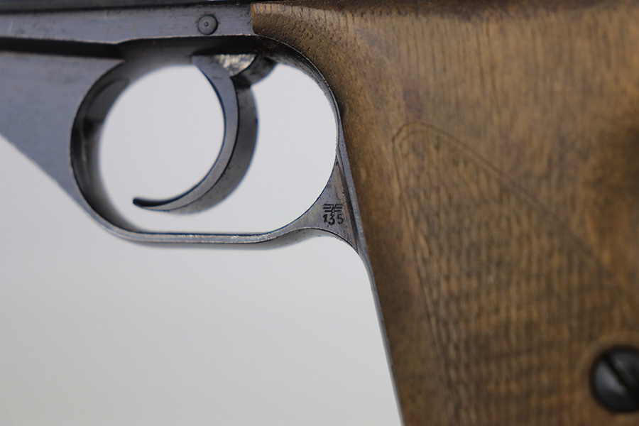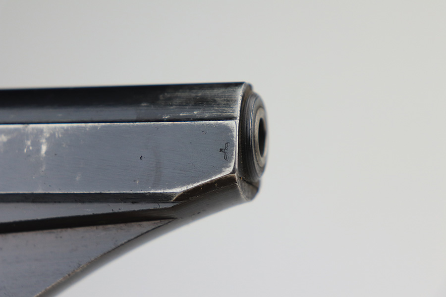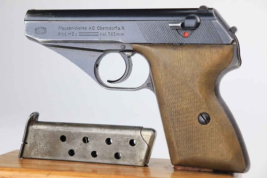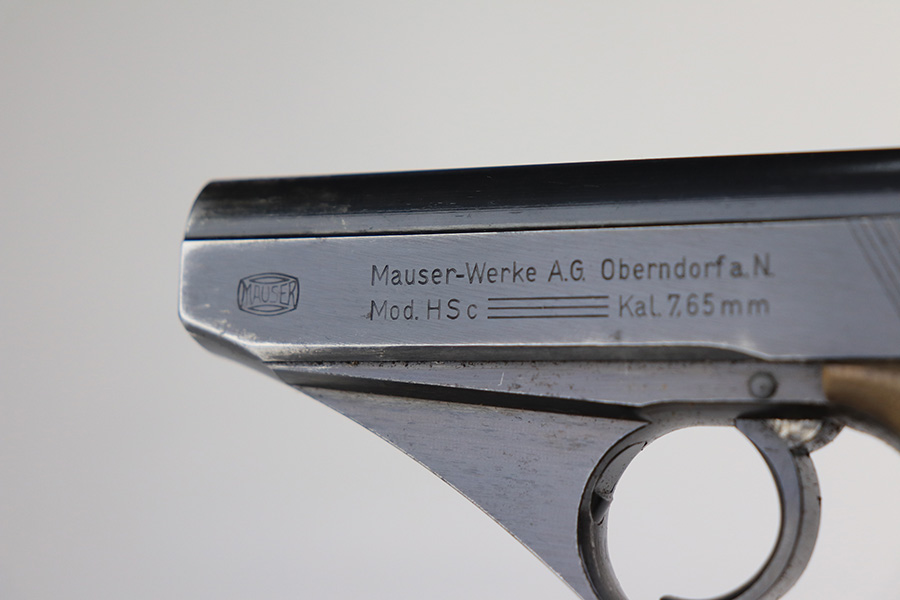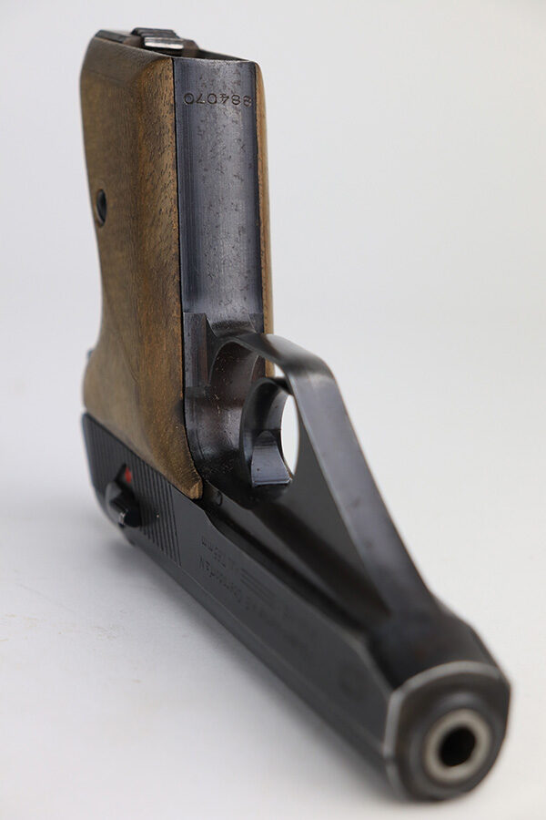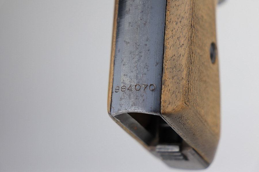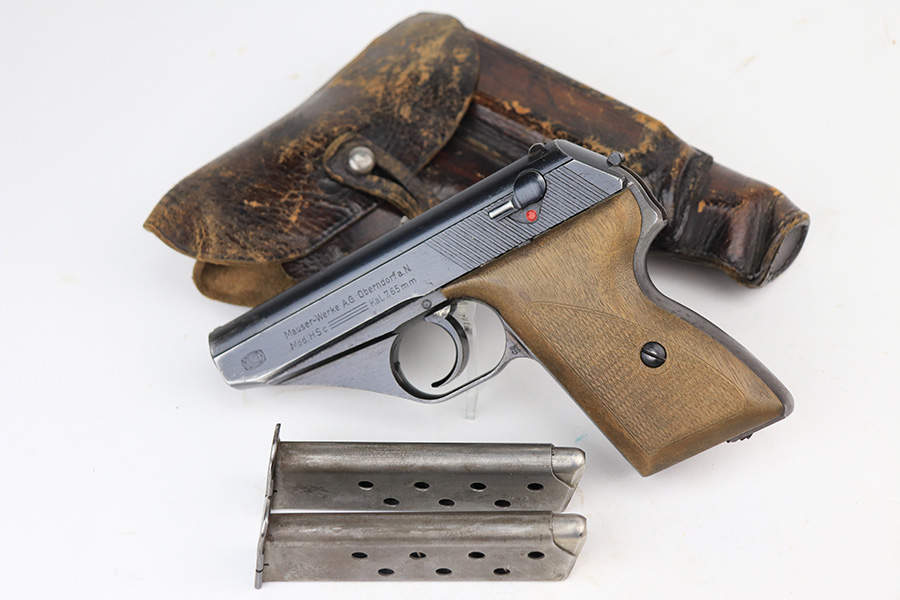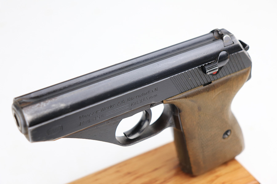1/11/22 – This is a very nice example of a Mauser HSC issued to the Nazi military in 1944. It is all matching and has the proper “Eagle 135” Nazi military acceptance proof on the left side of the trigger guard. The gun comes as a rig with a worn generic holster (fits the gun well), two period-correct magazines, and the original capture paperwork that lists this gun by serial number. The gun has retained about 93-94% of its original finish. There is minor wear around the muzzle and an area of somewhat spotty wear on the right side of the slide. Just a hint of thinning and very light freckling on both grip straps. Comes with nice period-correct wood grips – light bruising on the left side. The bore is mint.