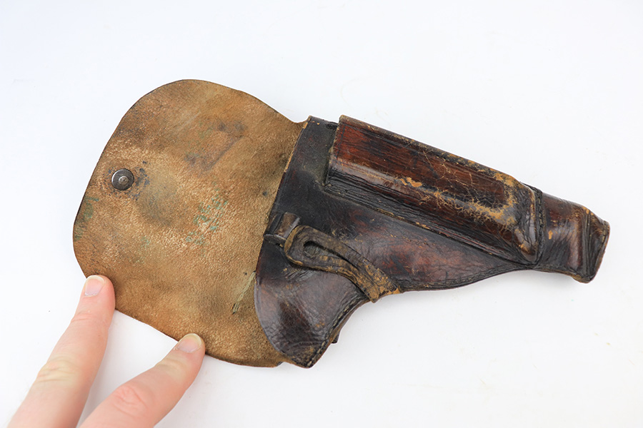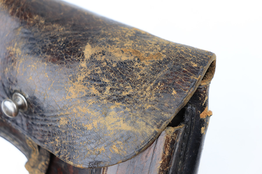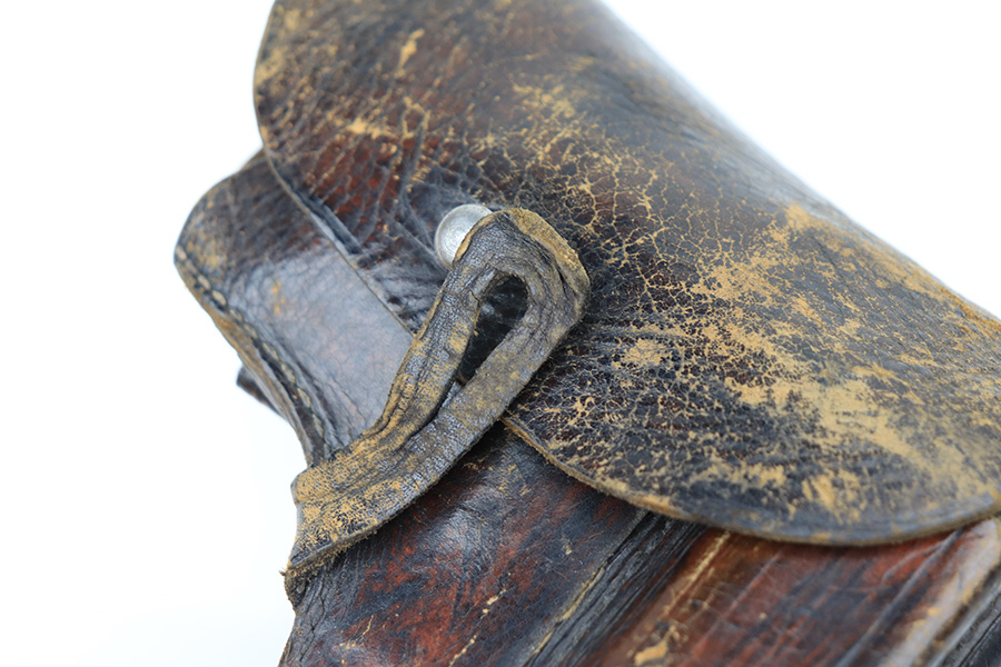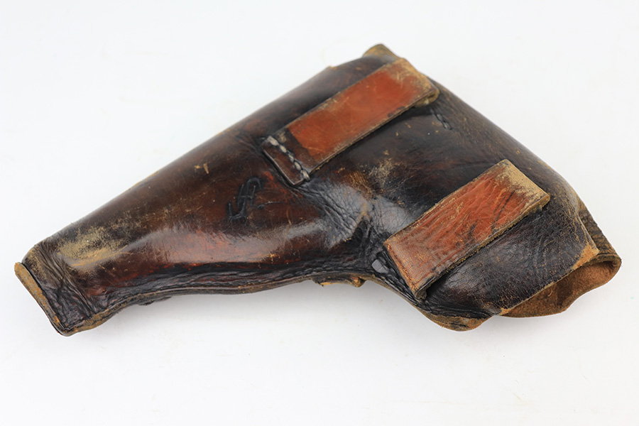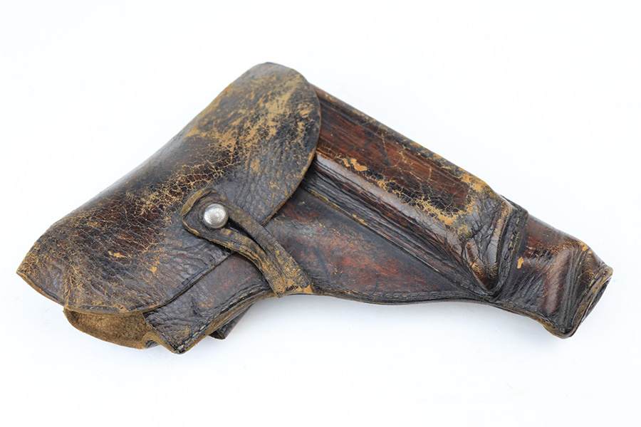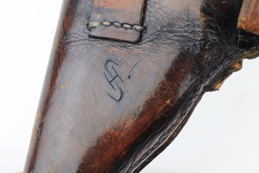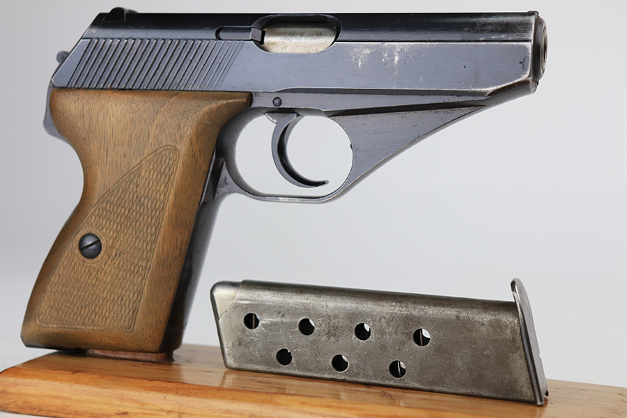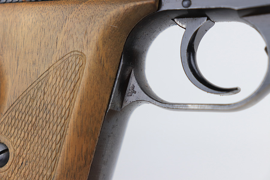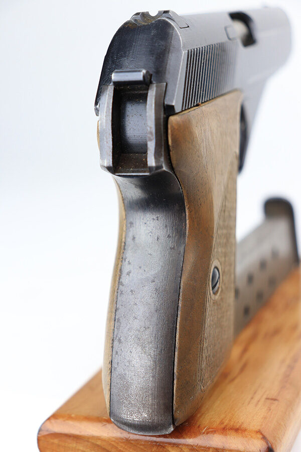 1/11/22 – This is a very nice example of a Mauser HSC issued to the Nazi military in 1944. It is all matching and has the proper “Eagle 135” Nazi military acceptance proof on the left side of the trigger guard. The gun comes as a rig with a worn generic holster (fits the gun well), two period-correct magazines, and the original capture paperwork that lists this gun by serial number. The gun has retained about 93-94% of its original finish. There is minor wear around the muzzle and an area of somewhat spotty wear on the right side of the slide. Just a hint of thinning and very light freckling on both grip straps. Comes with nice period-correct wood grips – light bruising on the left side. The bore is mint.