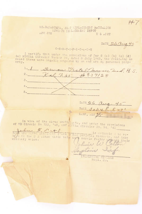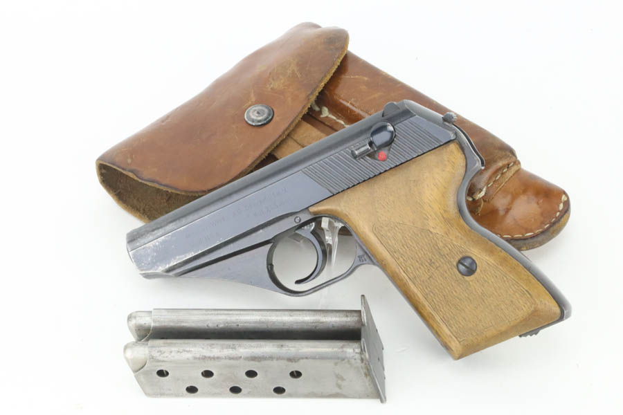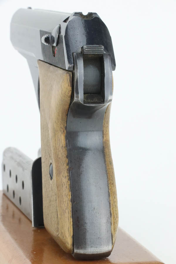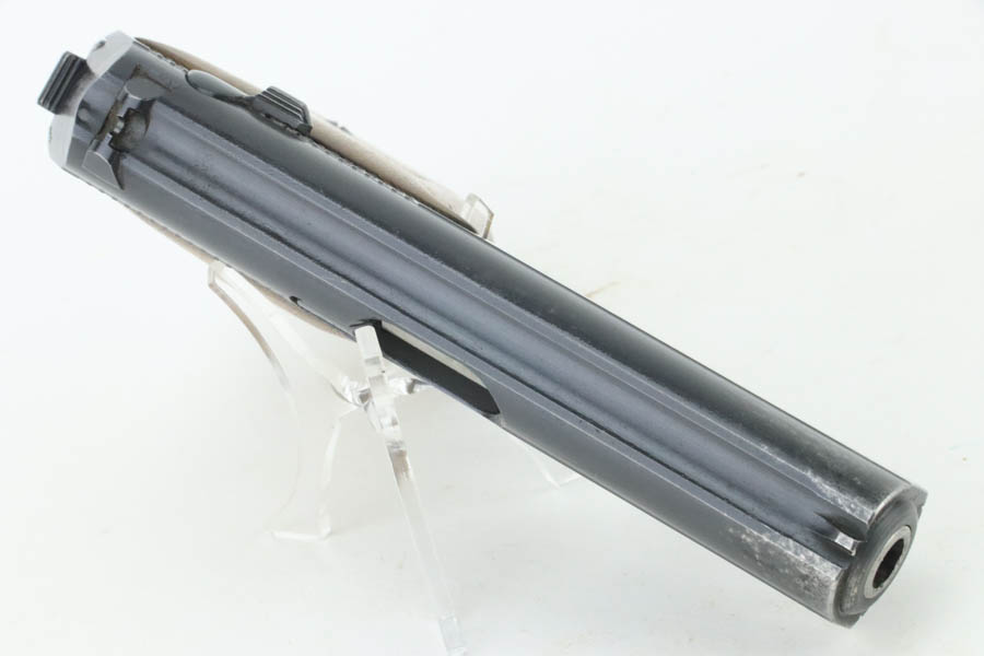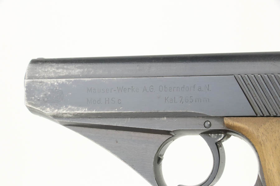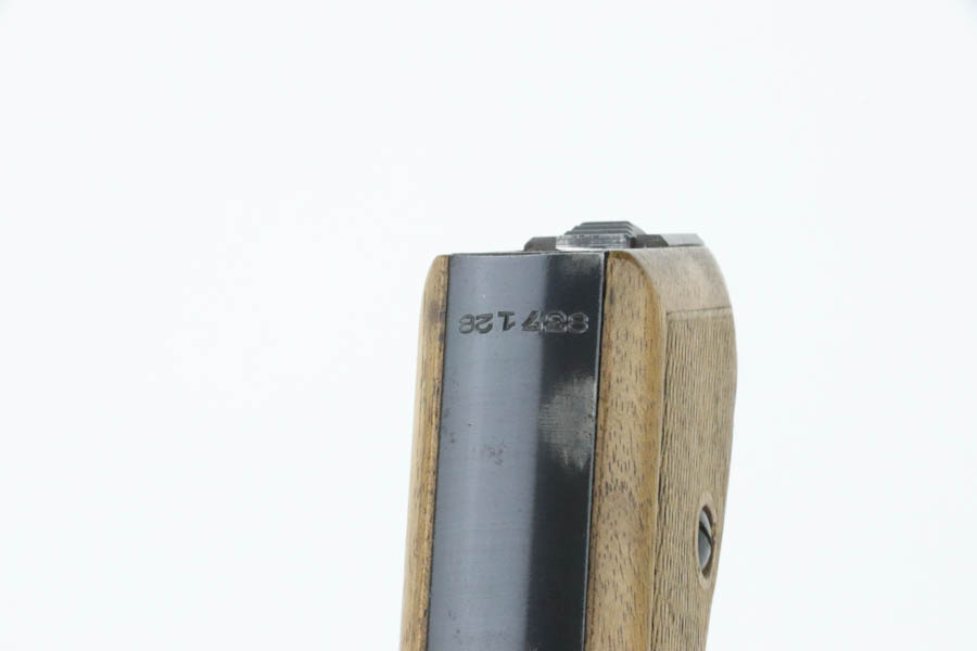 8/16/24 – This is a very nice example of a Mauser HSC issued to the Nazi military in 1943. All matching with the proper “Eagle 135” military acceptance proof on the trigger guard. It comes as a rig with a period-correct CZ 27-style tan leather holster and two proper magazines. It also comes with two original copies of the WW2-capture paperwork that list this exact gun by serial number. The gun itself has retained about 93% of its original finish with muzzle wear, an area of wear on the right side of the slide, and a small spot of wear on the front strap. Fitted with excellent period-correct blond wood grips. Minty bore.