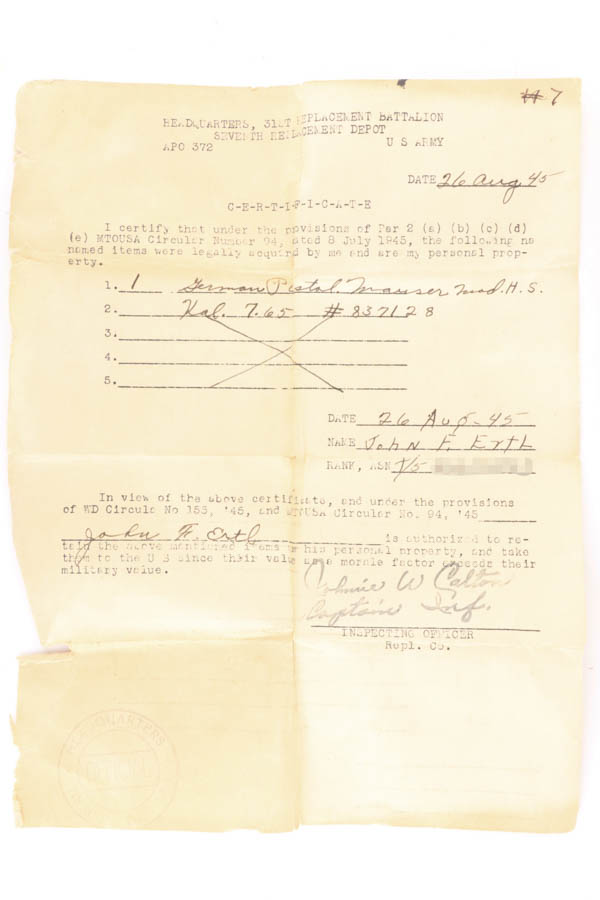 SOLD – Nazi Mauser HSC Rig – With Capture Docs