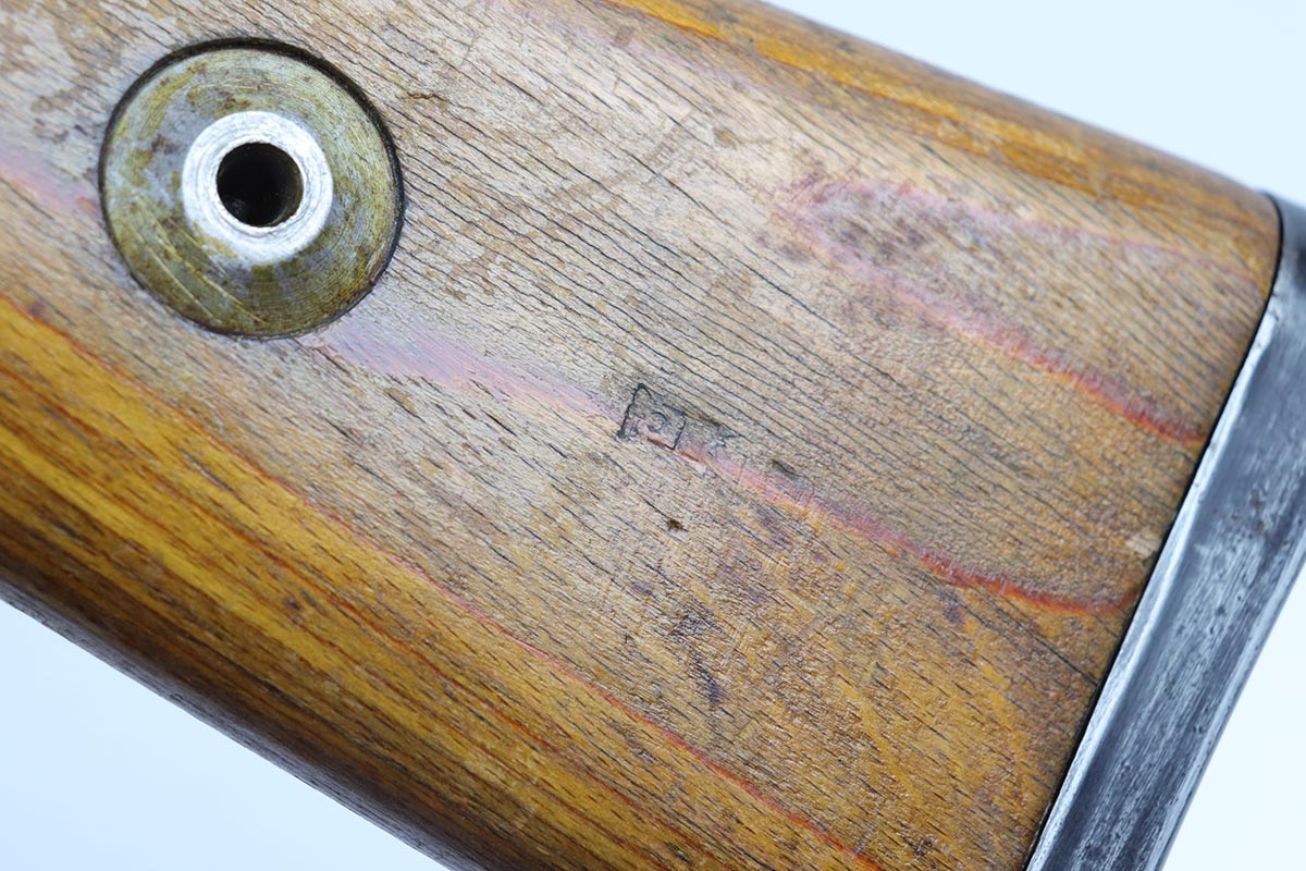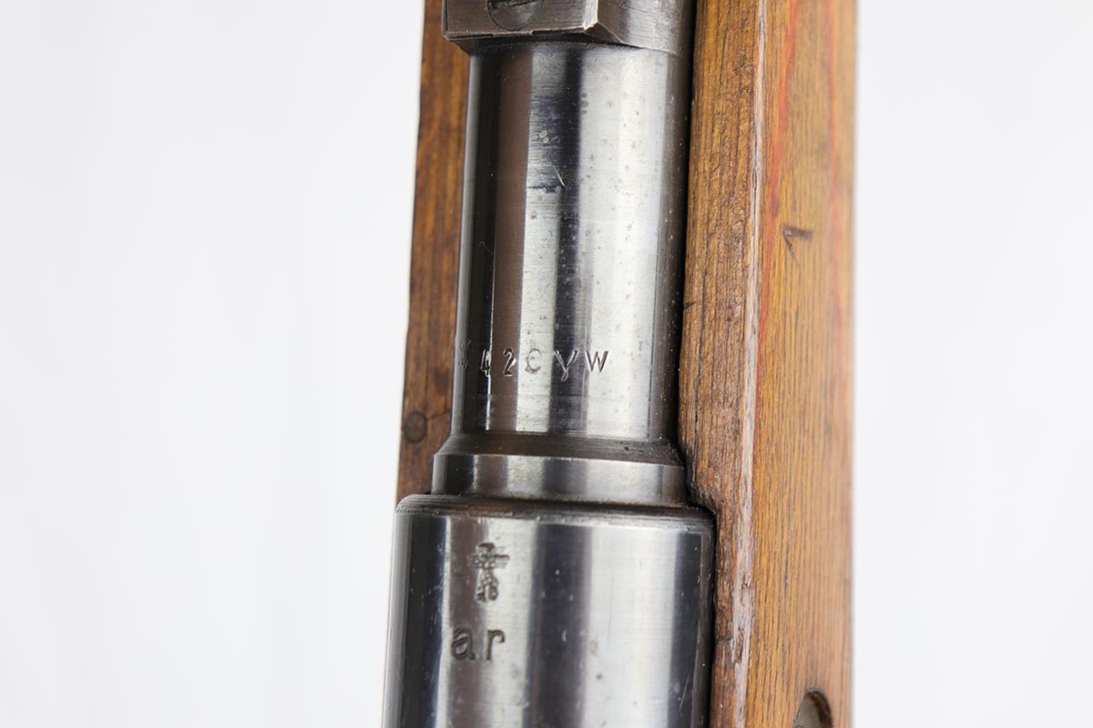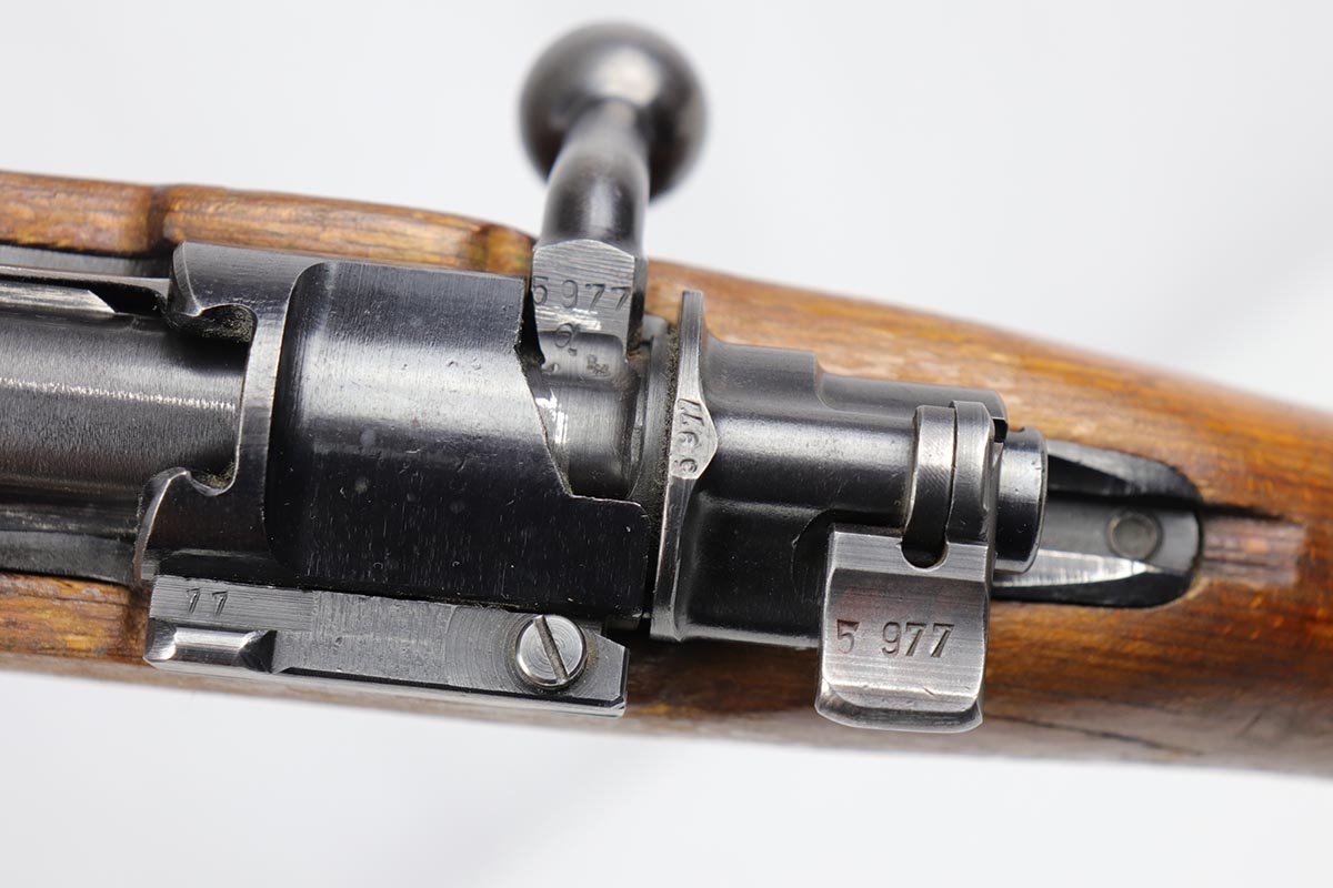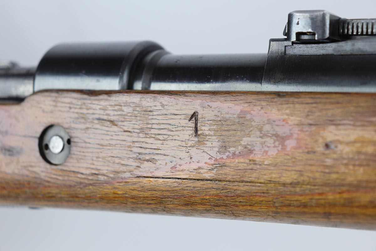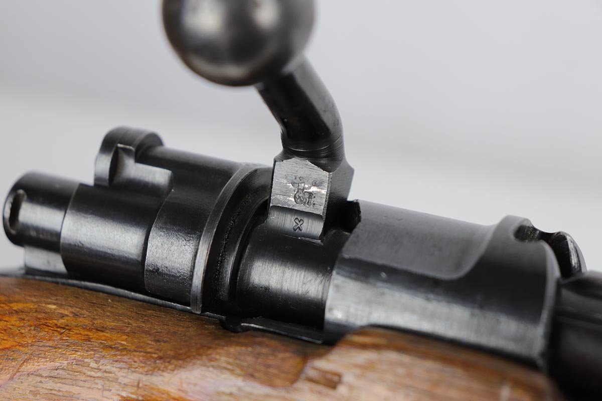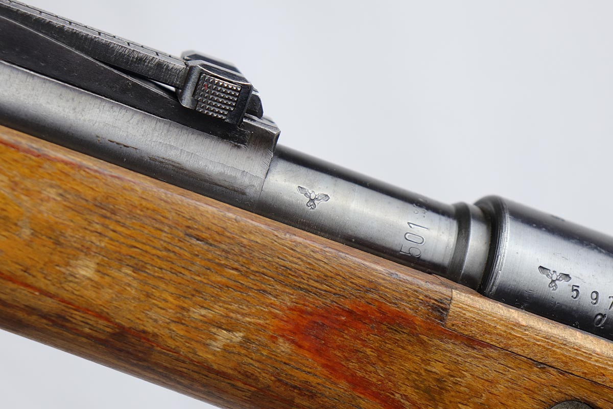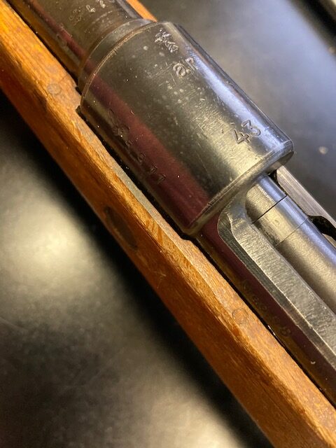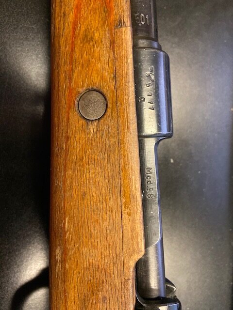 1/16/20 – This is an all matching Nazi Mauser K98 that is marked ‘ar 43’ on the receiver, denoting it was made in 1943 at the Mauser factory in Berlin-Borsigwalde. The metal parts are all matching numbers throughout the rifle, with the majority of the finish loss found on the bands and near the muzzle. The stock is unnumbered with Heer Army proof on right side, and a thin surface crack on the left/underside. The stock also appears to have been originally designed for a sniper scope mount, but the cutout was later filled in. Have not seen this before so don’t know the full story there, but will include a couple of closeup photos. Rifle bore is excellent.