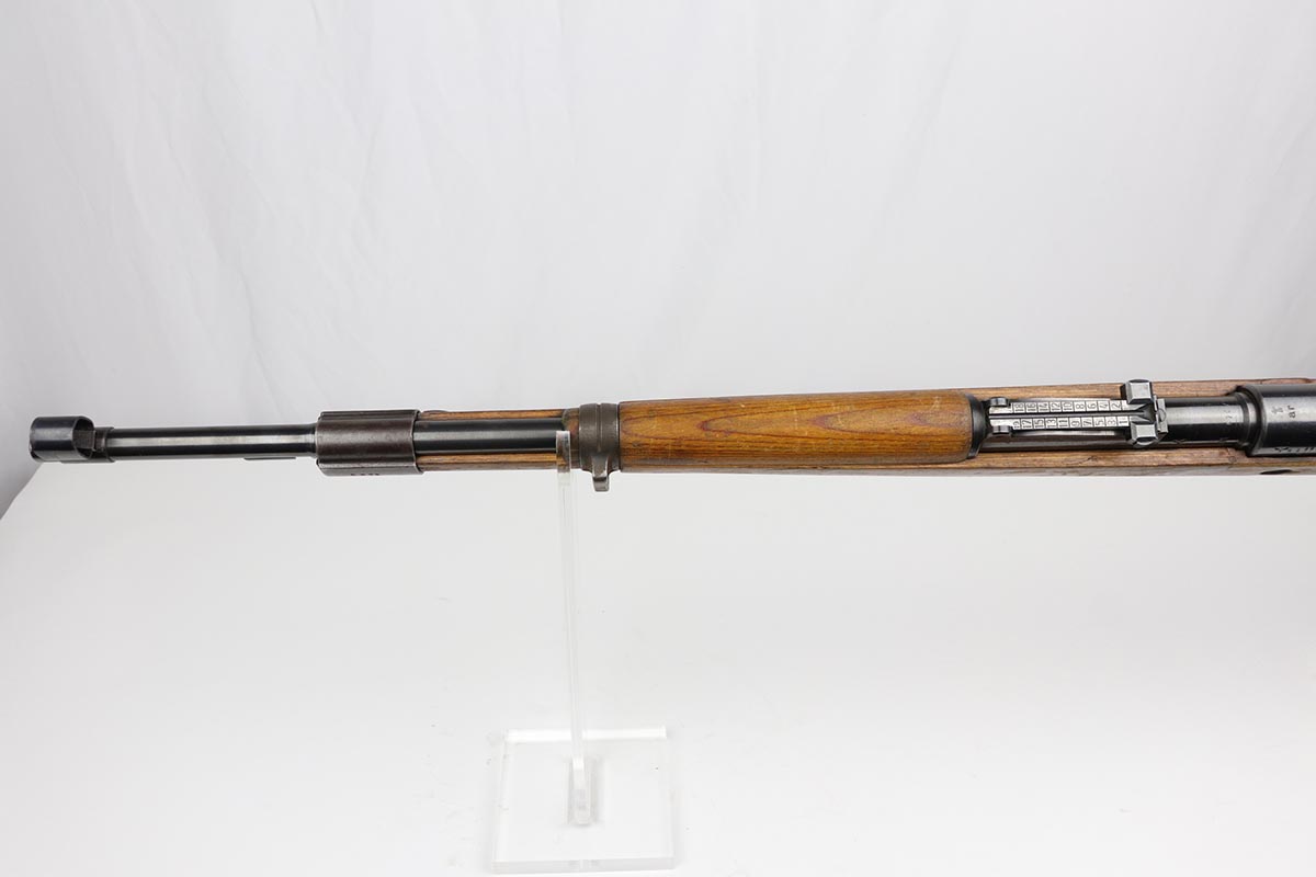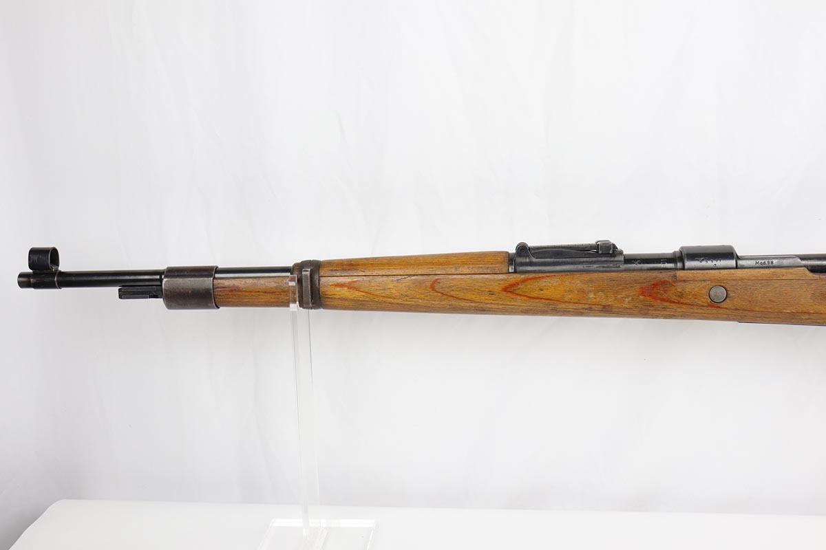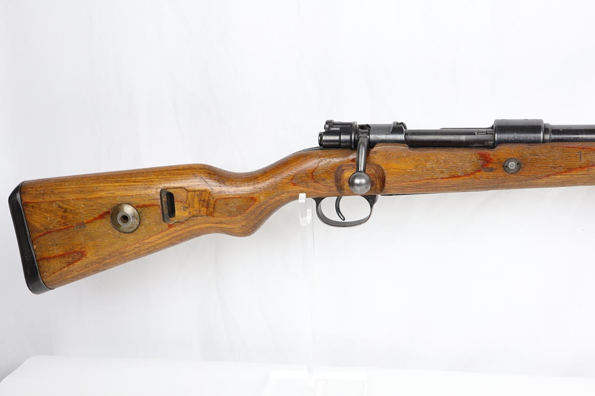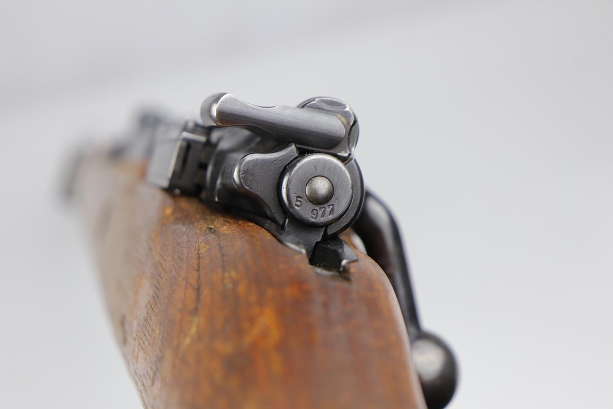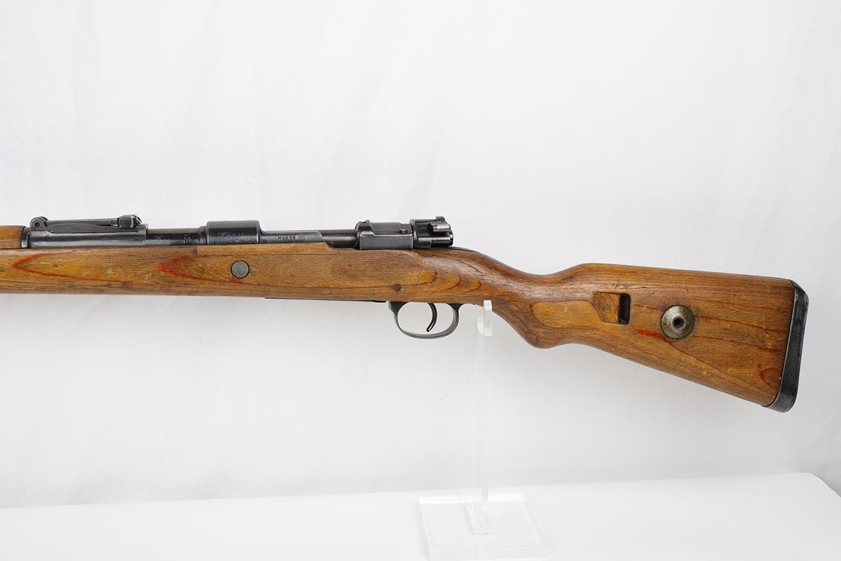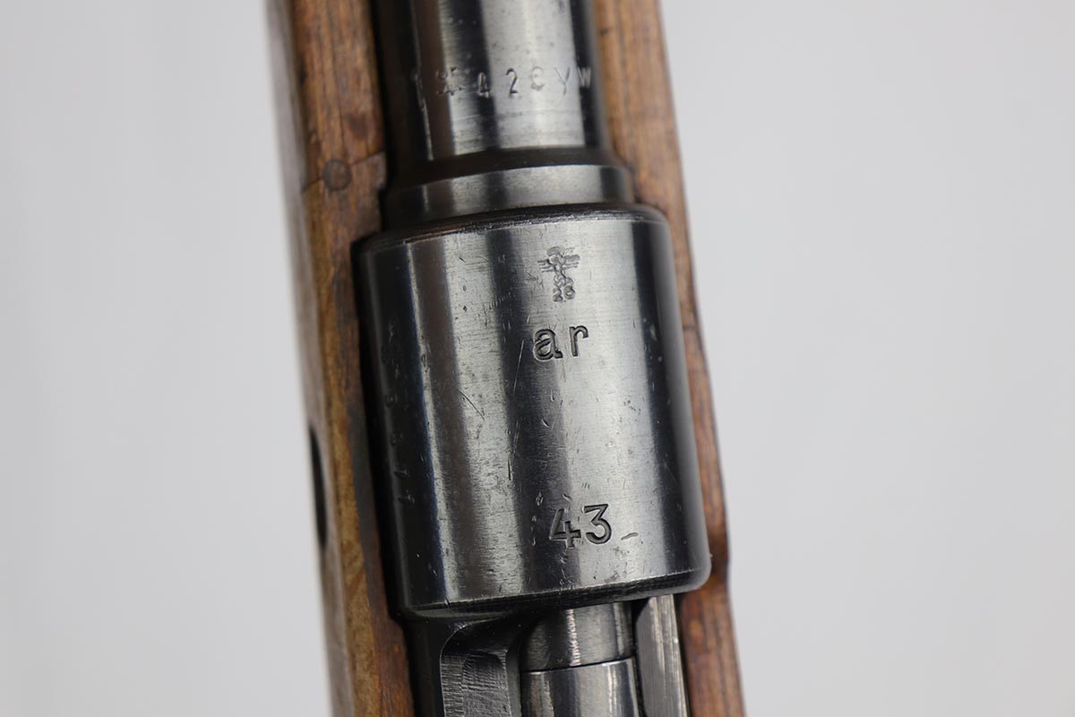 1/16/20 – This is an all matching Nazi Mauser K98 that is marked ‘ar 43’ on the receiver, denoting it was made in 1943 at the Mauser factory in Berlin-Borsigwalde. The metal parts are all matching numbers throughout the rifle, with the majority of the finish loss found on the bands and near the muzzle. The stock is unnumbered with Heer Army proof on right side, and a thin surface crack on the left/underside. The stock also appears to have been originally designed for a sniper scope mount, but the cutout was later filled in. Have not seen this before so don’t know the full story there, but will include a couple of closeup photos. Rifle bore is excellent.
