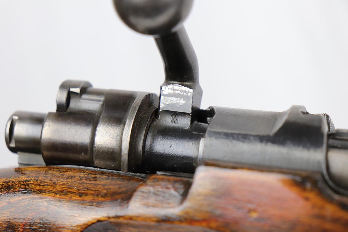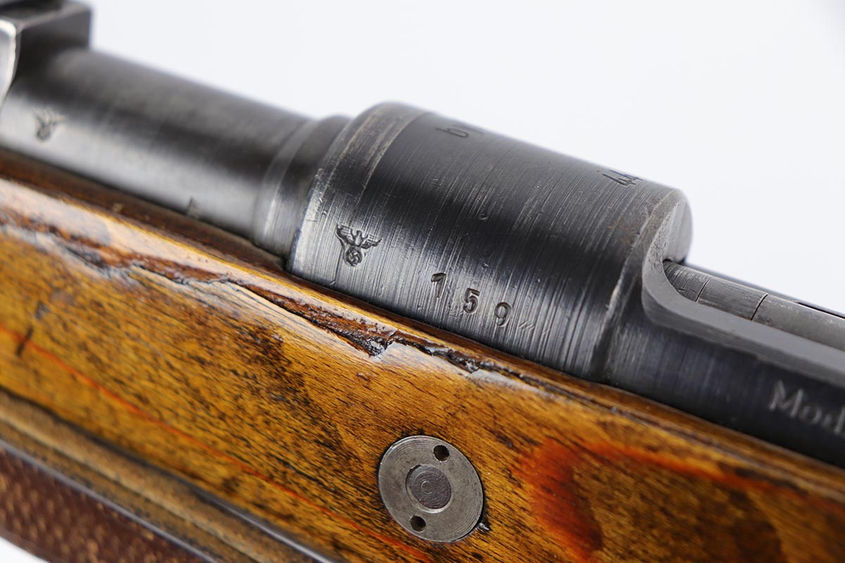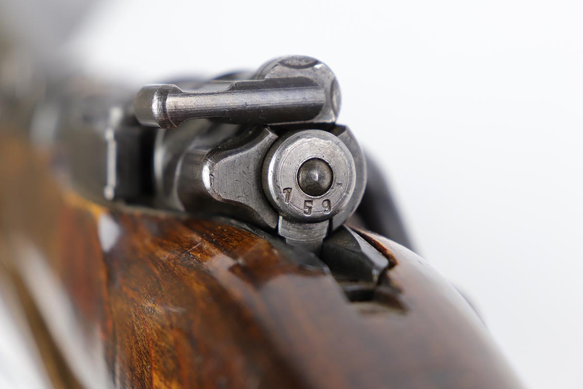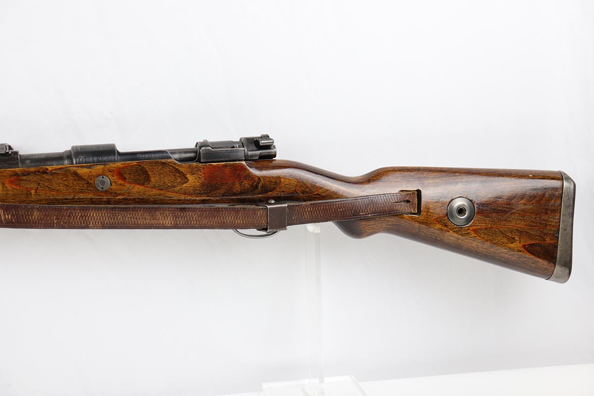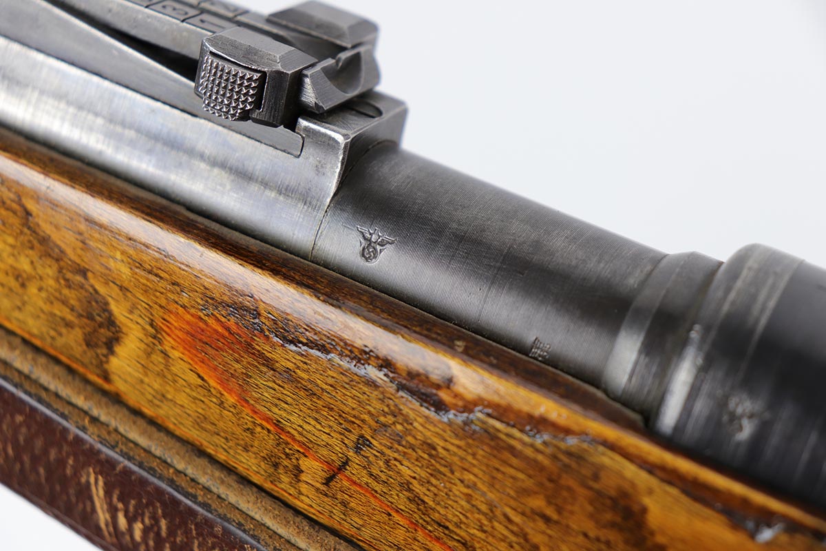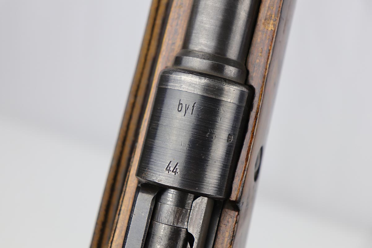 7/24/19 – This is a nice Mauser K98 that was manufactured early in 1944, as evidenced by no suffix and a three digit serial. The receiver is coded ‘byf 44’, and all numbered parts are matching. The metal surfaces show general thinning to the original blue but no major areas of wear or corrosion. The stock does show a repaired crack on the left side, though in an inconsequential area that wouldn’t affect structural integrity. It appears the rifle then received a layer of lacquer, hence the shininess and the blurred waffenamts. Original cleaning rod, sight hood and sling are present. Buttplate is marked ‘gqm 43’. The bore is excellent and shiny except near the muzzle, where it must not have been cleaning properly and there is minor pitting nearby.