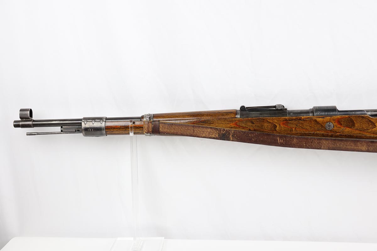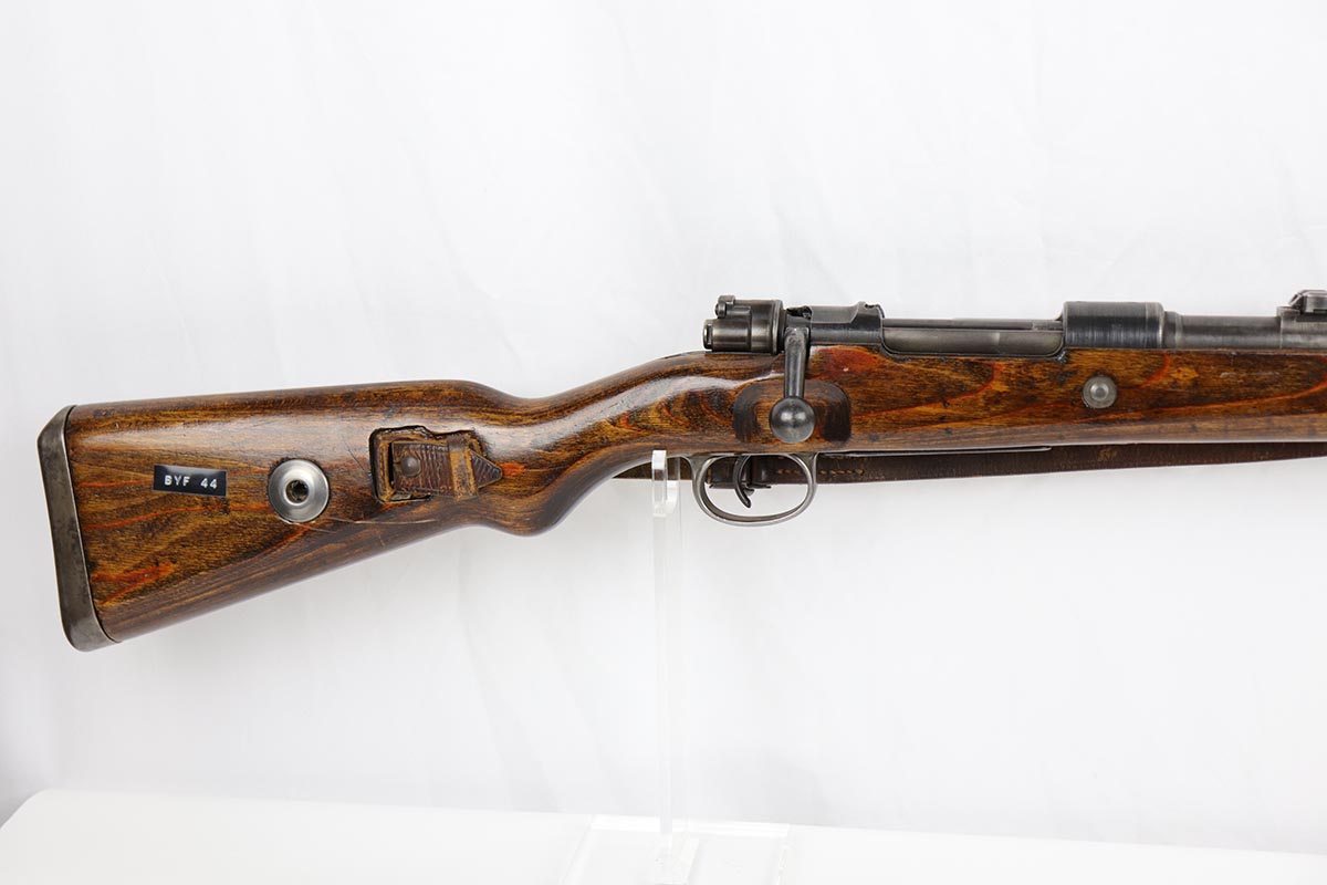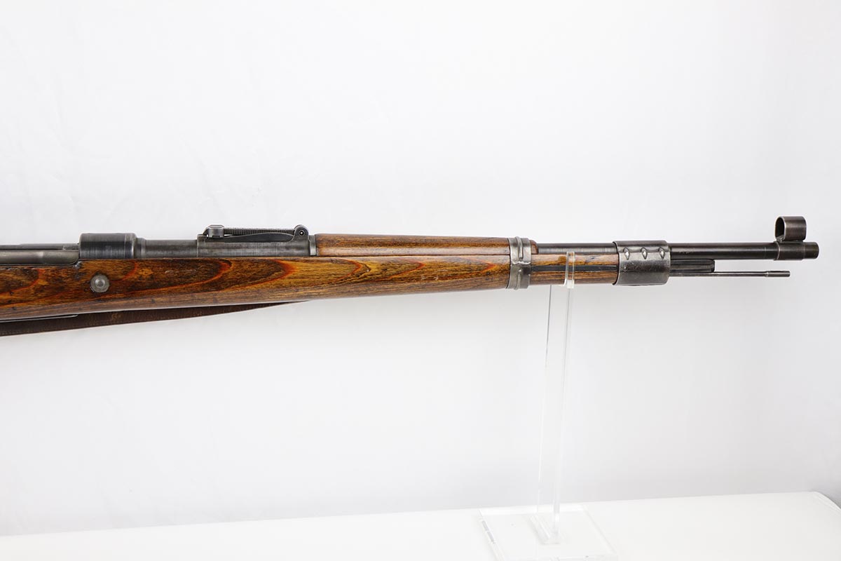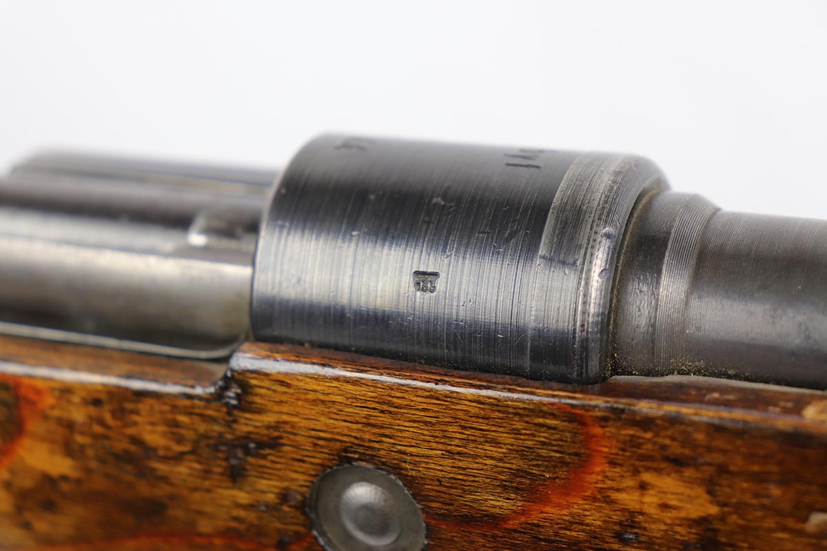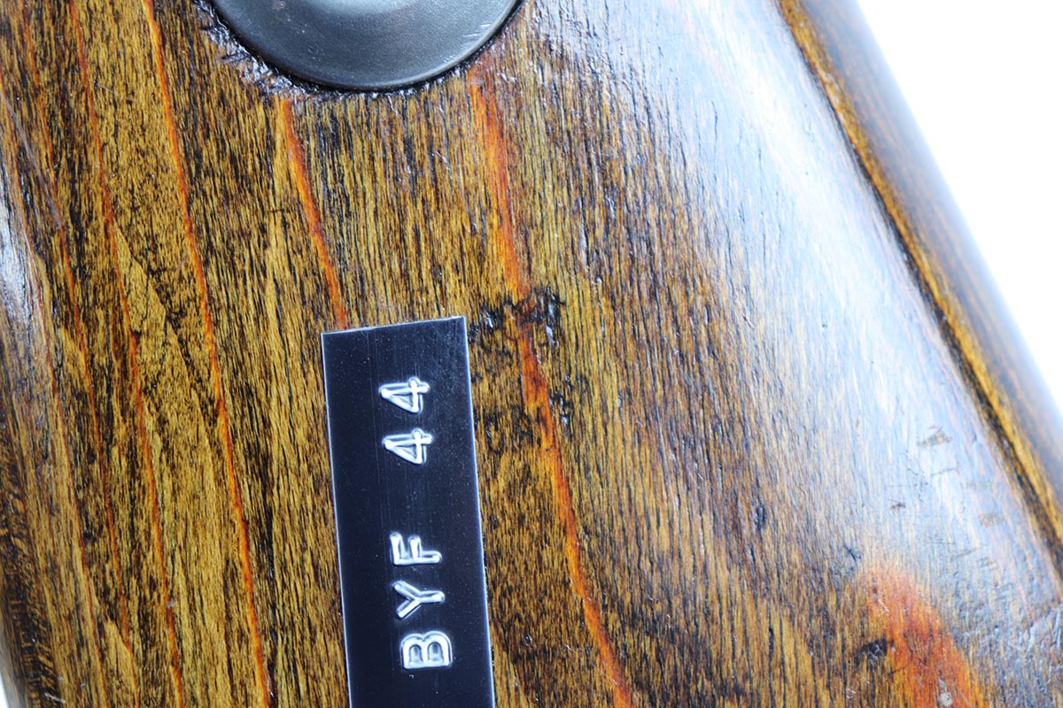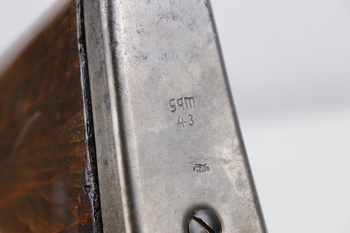 7/24/19 – This is a nice Mauser K98 that was manufactured early in 1944, as evidenced by no suffix and a three digit serial. The receiver is coded ‘byf 44’, and all numbered parts are matching. The metal surfaces show general thinning to the original blue but no major areas of wear or corrosion. The stock does show a repaired crack on the left side, though in an inconsequential area that wouldn’t affect structural integrity. It appears the rifle then received a layer of lacquer, hence the shininess and the blurred waffenamts. Original cleaning rod, sight hood and sling are present. Buttplate is marked ‘gqm 43’. The bore is excellent and shiny except near the muzzle, where it must not have been cleaning properly and there is minor pitting nearby.