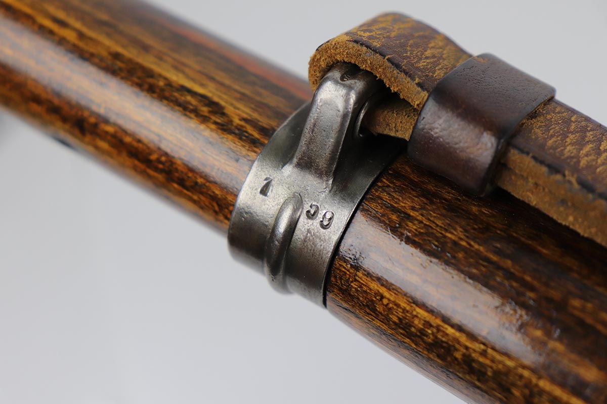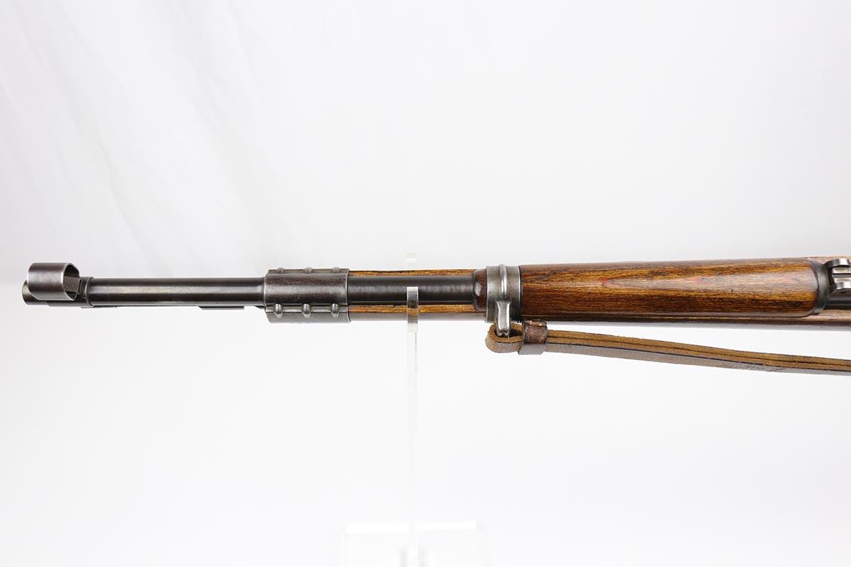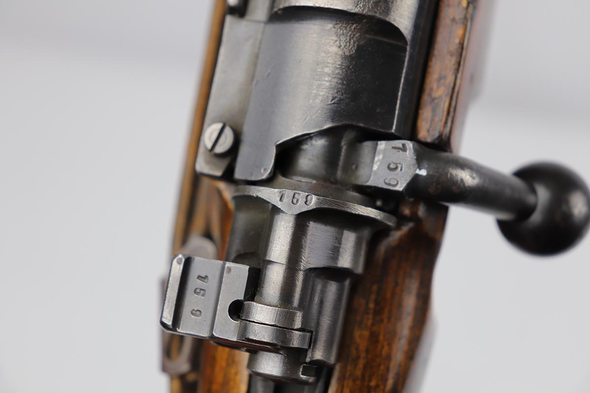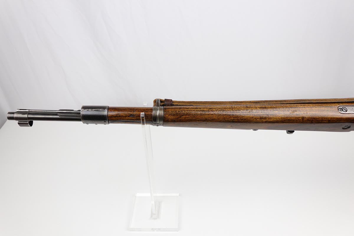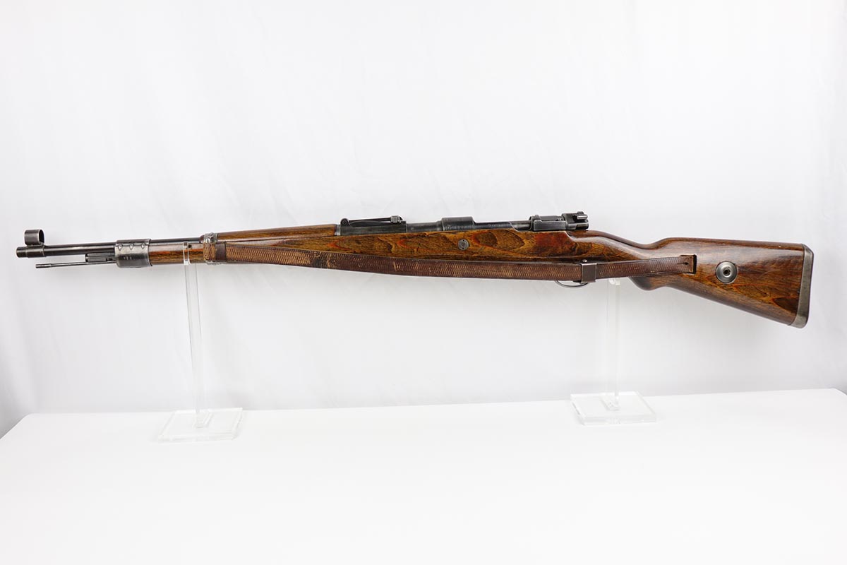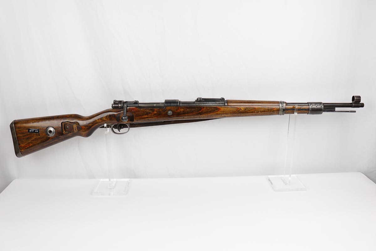 7/24/19 – This is a nice Mauser K98 that was manufactured early in 1944, as evidenced by no suffix and a three digit serial. The receiver is coded ‘byf 44’, and all numbered parts are matching. The metal surfaces show general thinning to the original blue but no major areas of wear or corrosion. The stock does show a repaired crack on the left side, though in an inconsequential area that wouldn’t affect structural integrity. It appears the rifle then received a layer of lacquer, hence the shininess and the blurred waffenamts. Original cleaning rod, sight hood and sling are present. Buttplate is marked ‘gqm 43’. The bore is excellent and shiny except near the muzzle, where it must not have been cleaning properly and there is minor pitting nearby.