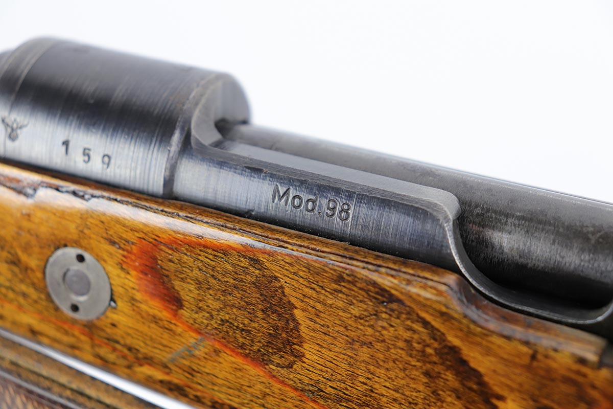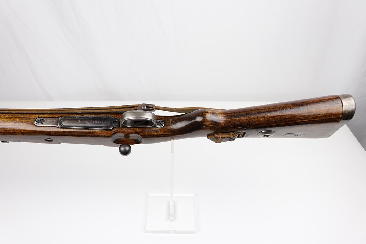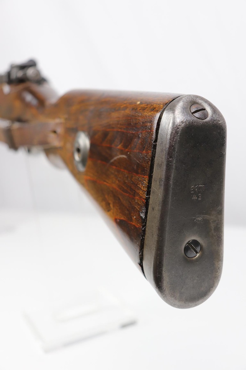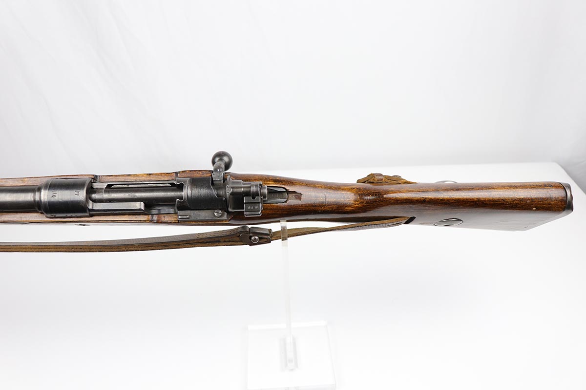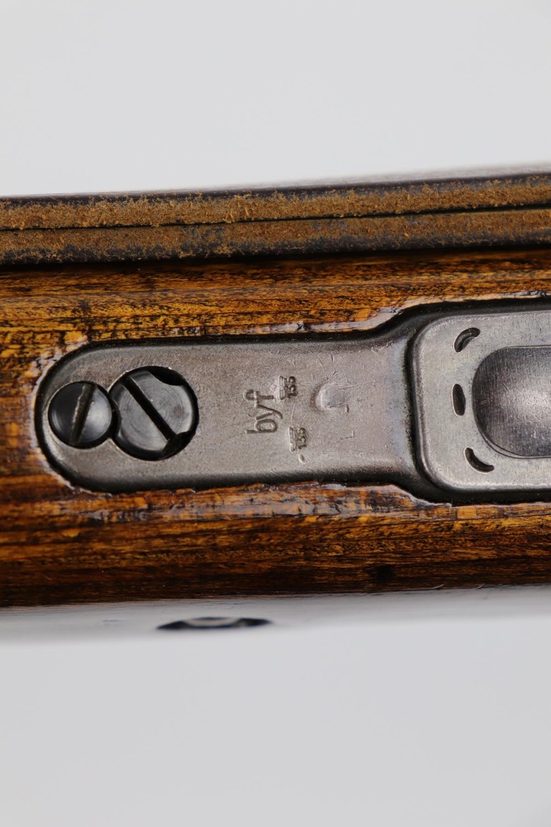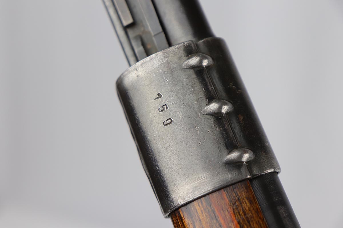 7/24/19 – This is a nice Mauser K98 that was manufactured early in 1944, as evidenced by no suffix and a three digit serial. The receiver is coded ‘byf 44’, and all numbered parts are matching. The metal surfaces show general thinning to the original blue but no major areas of wear or corrosion. The stock does show a repaired crack on the left side, though in an inconsequential area that wouldn’t affect structural integrity. It appears the rifle then received a layer of lacquer, hence the shininess and the blurred waffenamts. Original cleaning rod, sight hood and sling are present. Buttplate is marked ‘gqm 43’. The bore is excellent and shiny except near the muzzle, where it must not have been cleaning properly and there is minor pitting nearby.