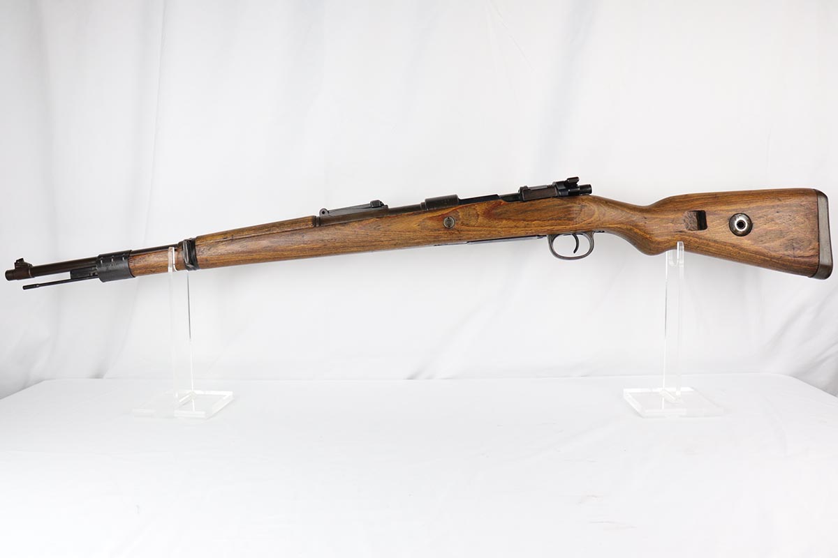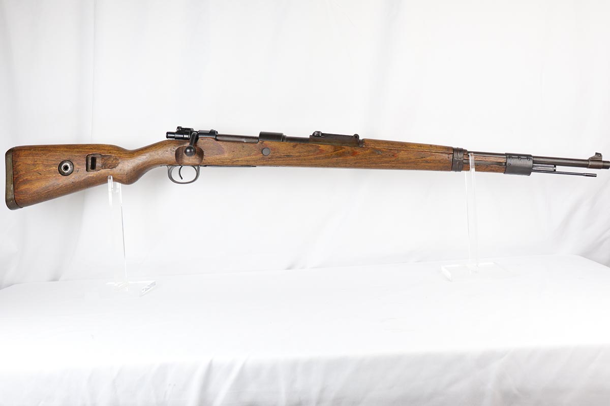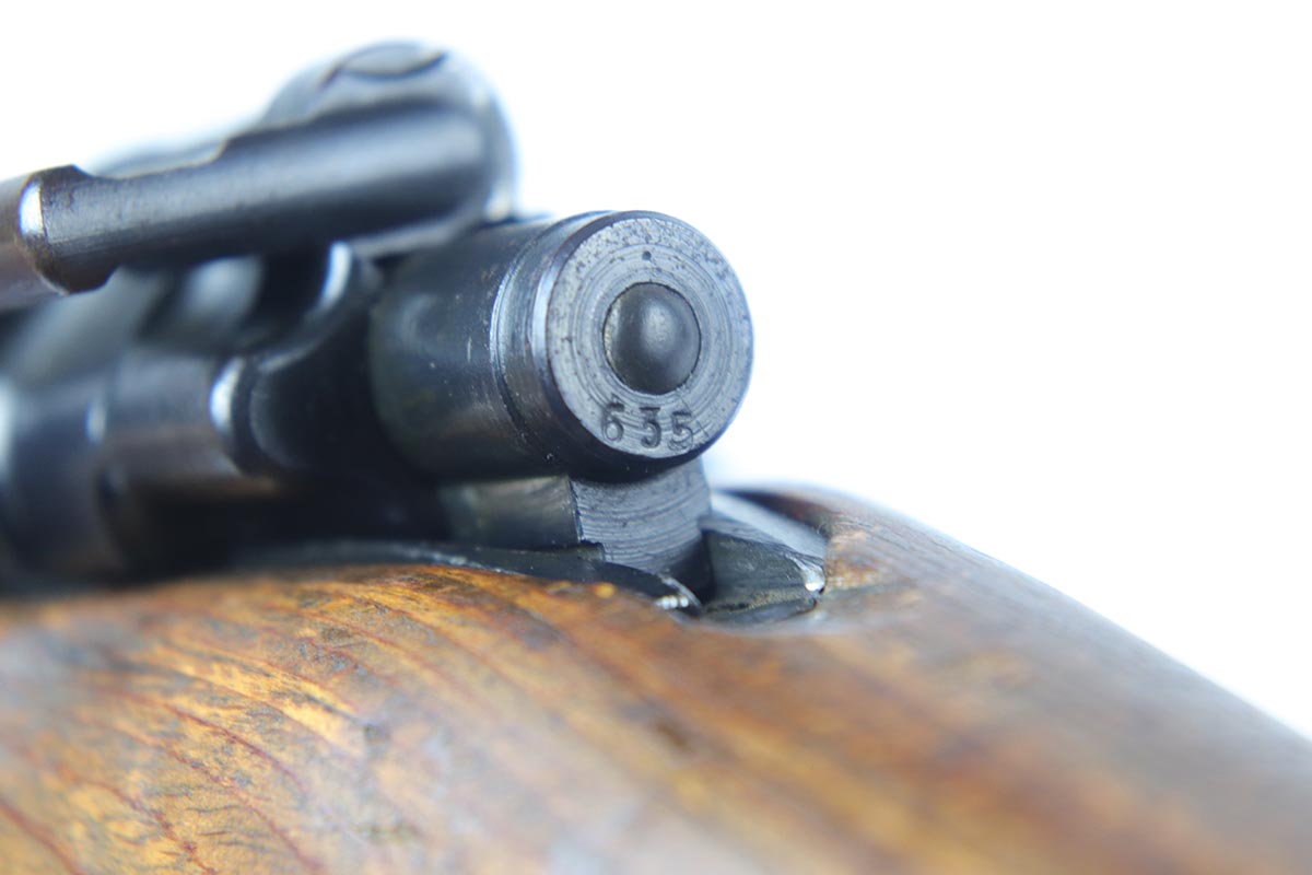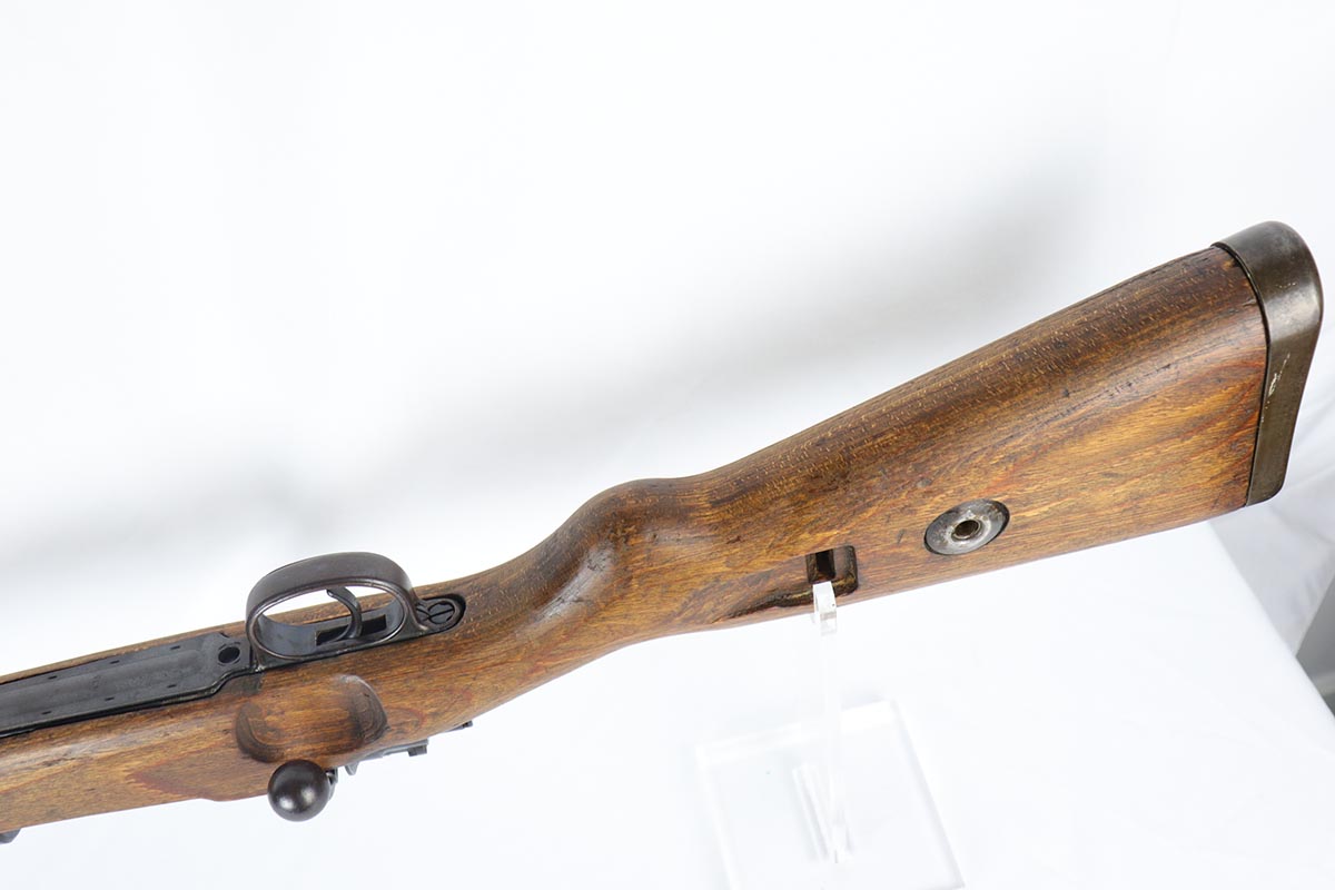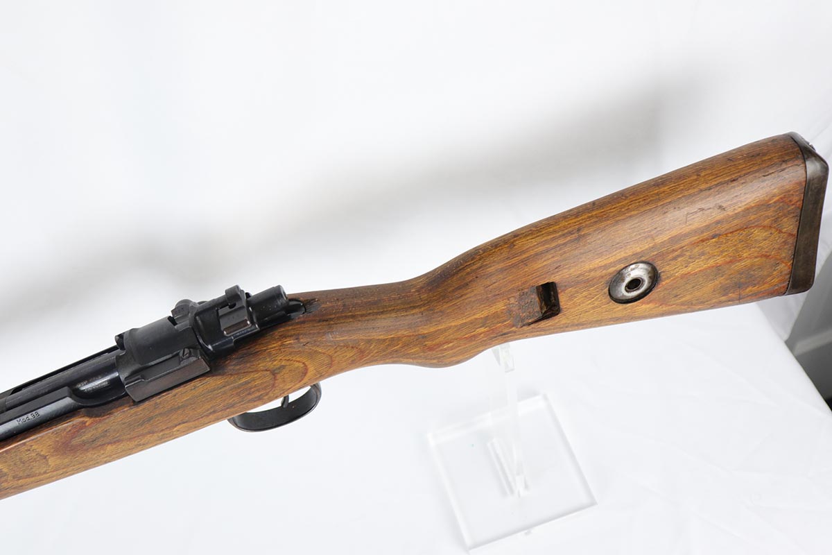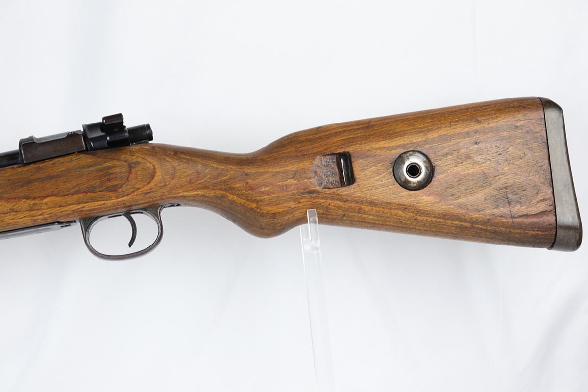 7/2/18 – This is an all matching and original Mauser K98, made in 1944 at the Waffenwerke Brunn factory. The bluing does not have much actual finish loss but does have patina visible throughout the barrel and forward portion of the receiver. All numbered parts match. Stock is correctly unmarked. There is a very thin surface crack near the buttplate, but it does not go through the wood more than a quarter of an inch at the deepest point. There are also a few ding marks on the receiver. Rifle has an excellent bore and comes with a cleaning rod.
