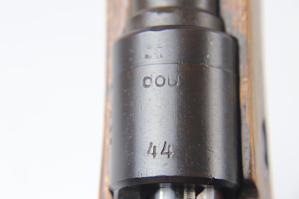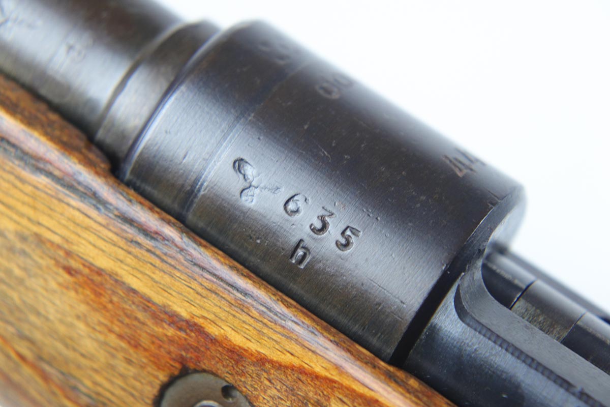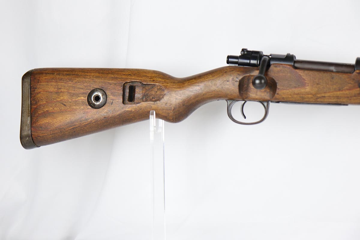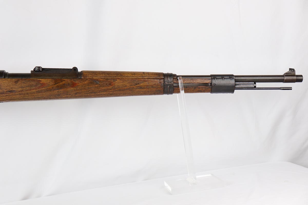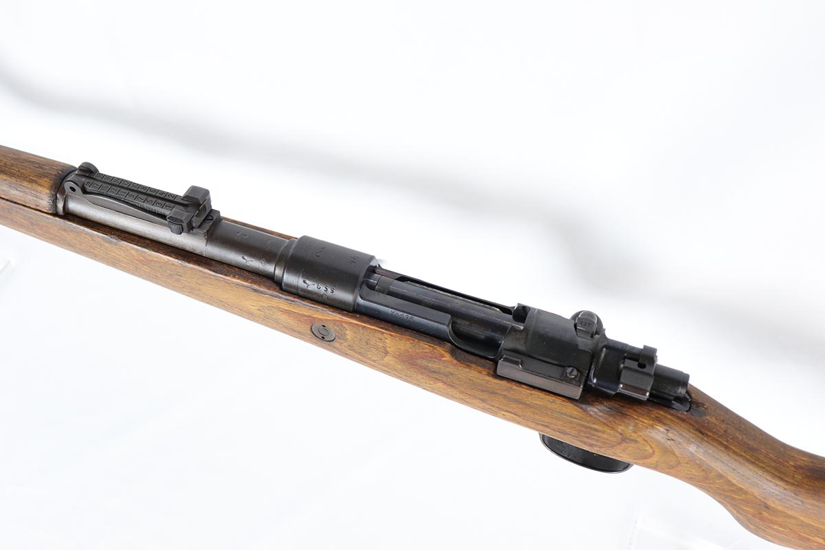 7/2/18 – This is an all matching and original Mauser K98, made in 1944 at the Waffenwerke Brunn factory. The bluing does not have much actual finish loss but does have patina visible throughout the barrel and forward portion of the receiver. All numbered parts match. Stock is correctly unmarked. There is a very thin surface crack near the buttplate, but it does not go through the wood more than a quarter of an inch at the deepest point. There are also a few ding marks on the receiver. Rifle has an excellent bore and comes with a cleaning rod.