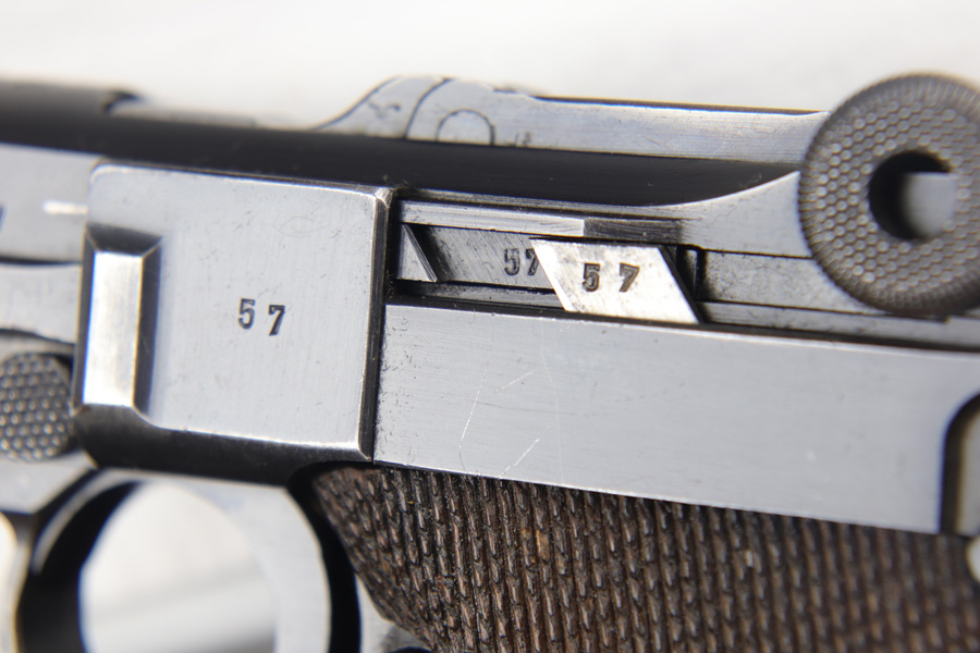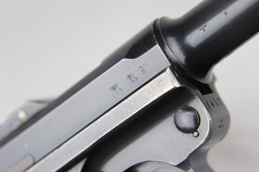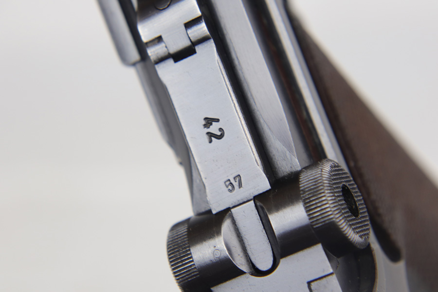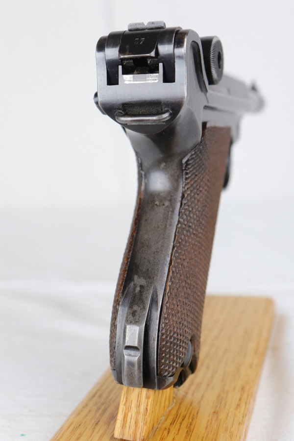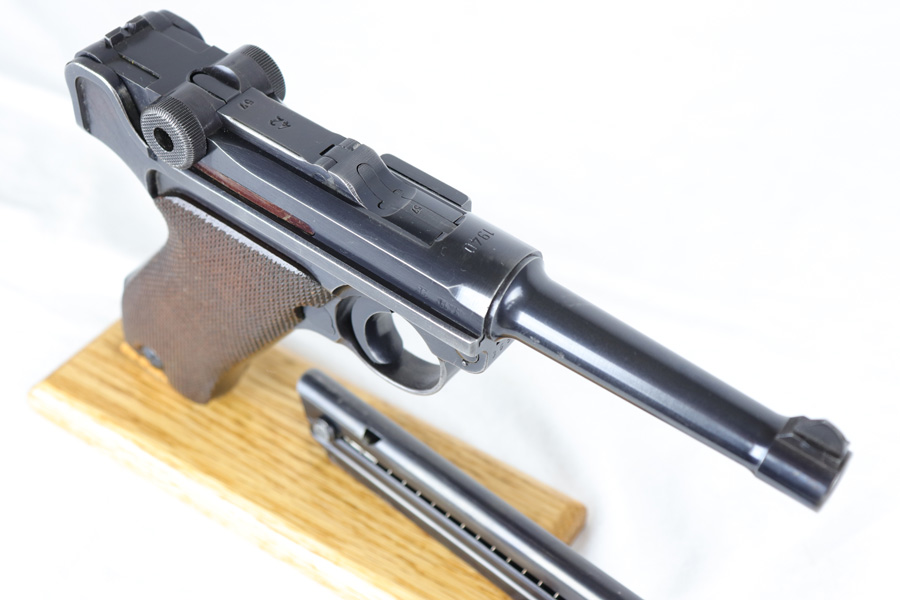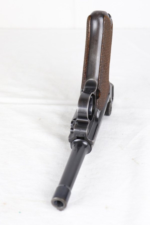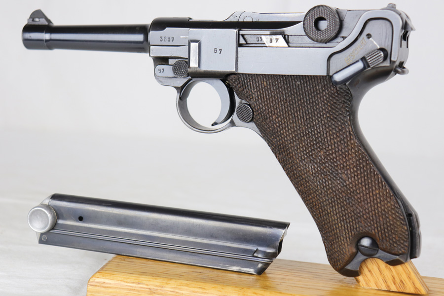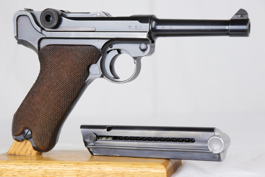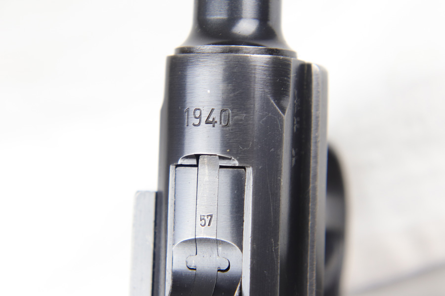10/24/18 – This is a nice example of a collectible Nazi Mauser Luger from 1940. It is all matching and original, including the grips. The magazine is period correct but numbered to another Luger. The finish rates at 85+% with a nice profile view but some thinning/patina on the straps. Terrific bore, so this one would combine to make a nice shooter, as well as display/conversation piece. Grips are in great condition. Proper mechanics.