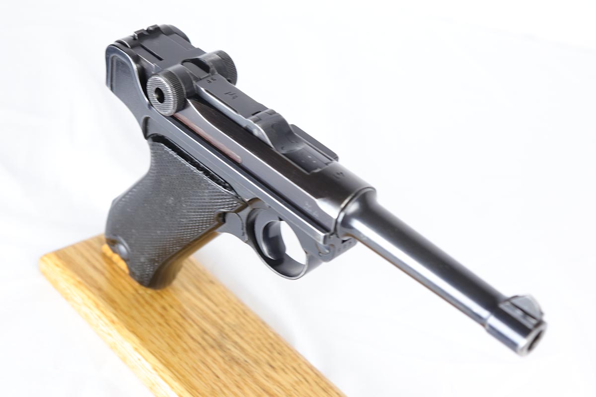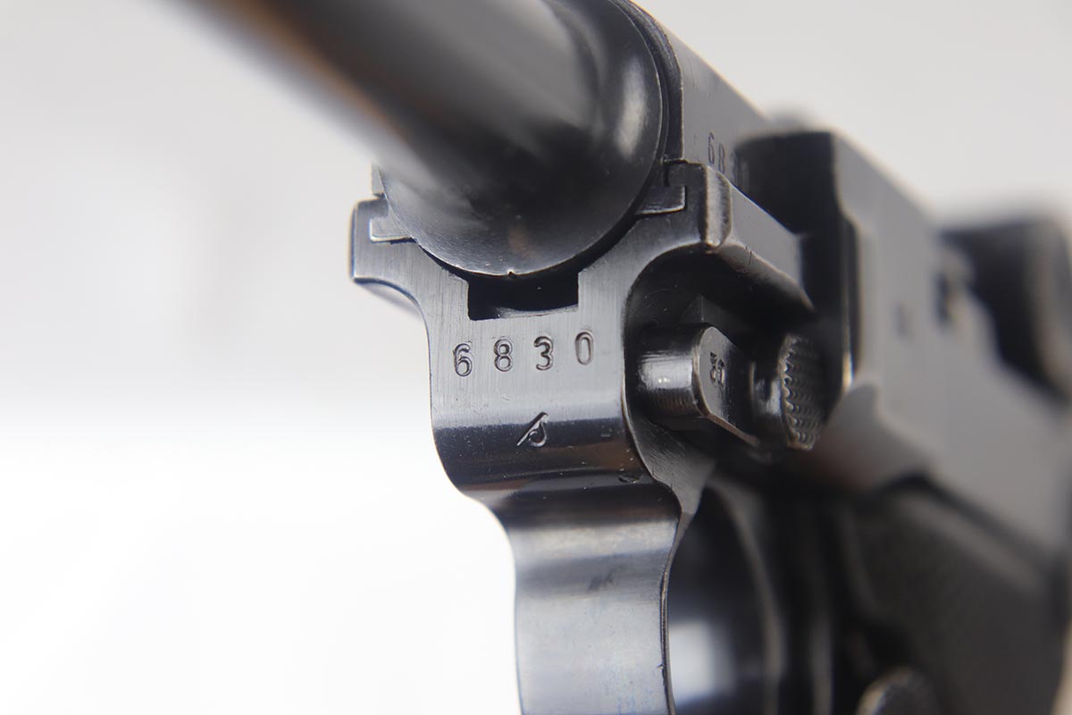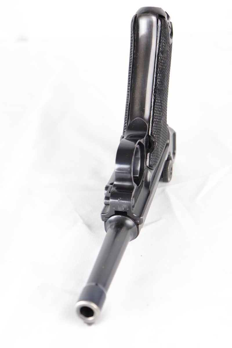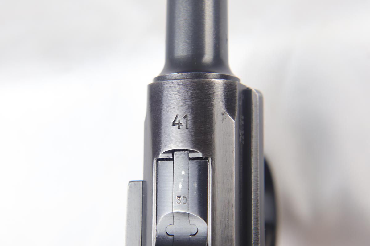 8/27/18 – This is a German Army issued Mauser Luger from 1941, commonly referred to as a Black Widow due to the black plastic grips and magazine bottom. The pistol is all matching and original with about 95% blue remaining. There is minor thinning on the front strap and sideplate, and some finish loss on the muzzle. Correct Black Widow style grips and magazine. Bore shows minor frost but strong rifling and no major flaws.