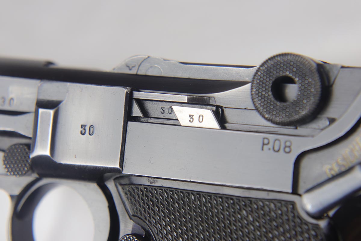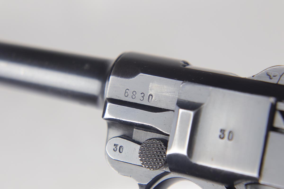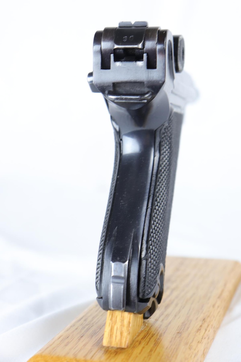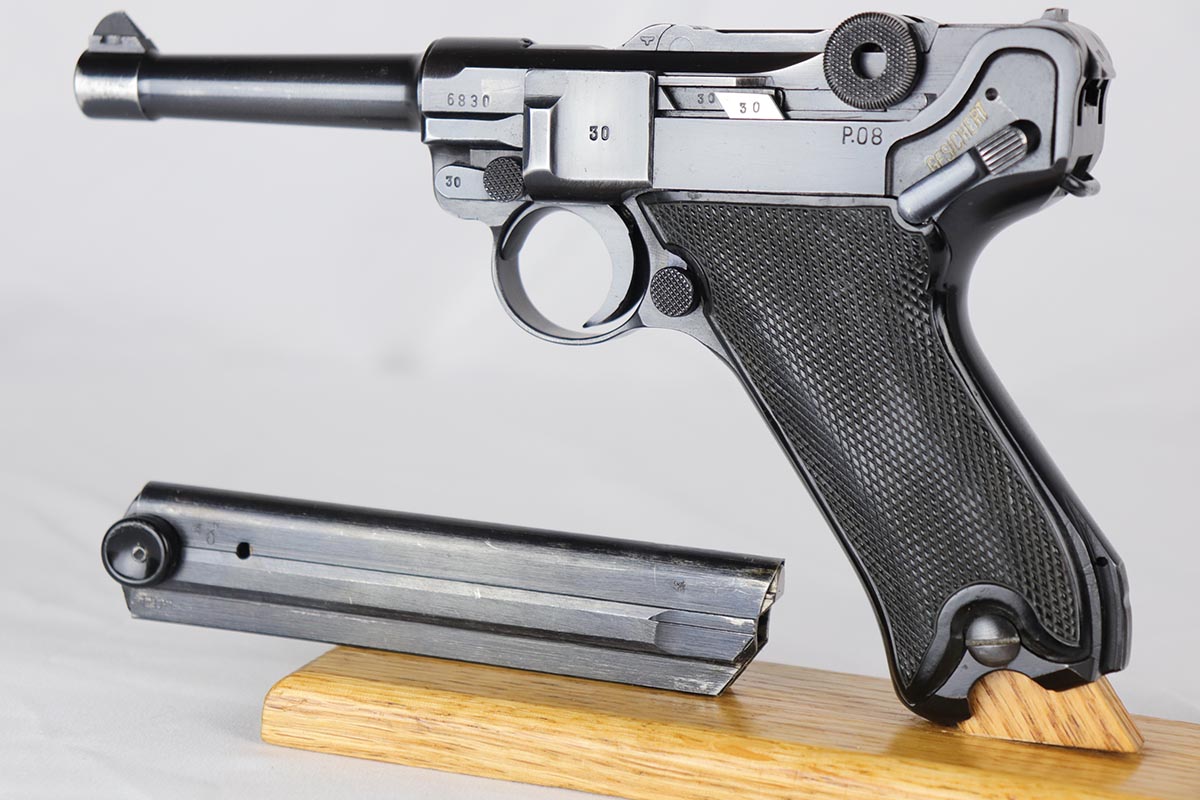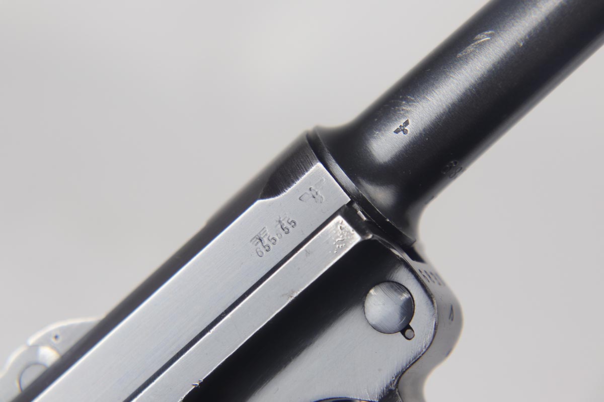 8/27/18 – This is a German Army issued Mauser Luger from 1941, commonly referred to as a Black Widow due to the black plastic grips and magazine bottom. The pistol is all matching and original with about 95% blue remaining. There is minor thinning on the front strap and sideplate, and some finish loss on the muzzle. Correct Black Widow style grips and magazine. Bore shows minor frost but strong rifling and no major flaws.